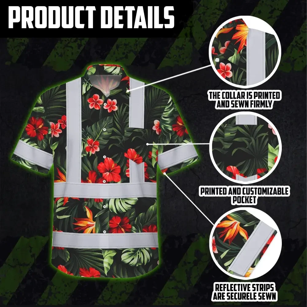 Choose Pack Hi Vis Hawaiian Shirt Reflective Tapes Red Neon Flowers Custom Name Safety Workwear For Workers, Truckers, Operators