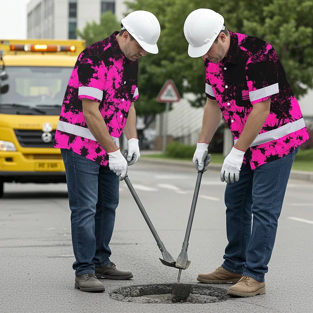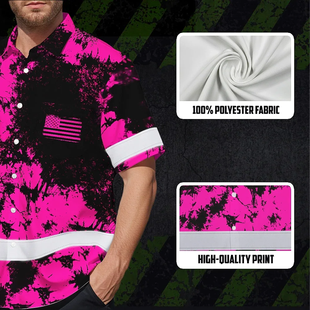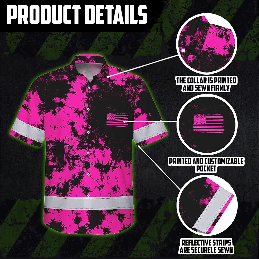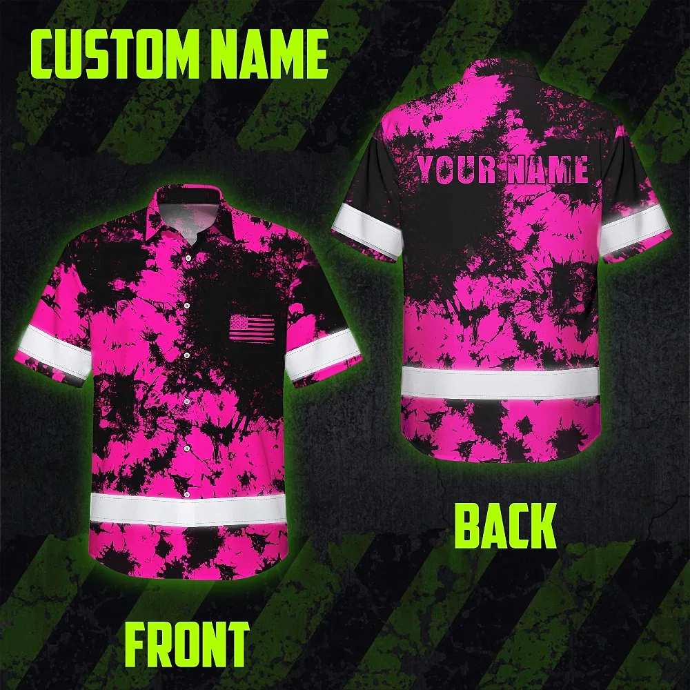 Hi Vis Hawaiian American Flag Shirt, Pink Neon Custom Name Reflective Short Sleeve Button-up Safety Shirt for Workers