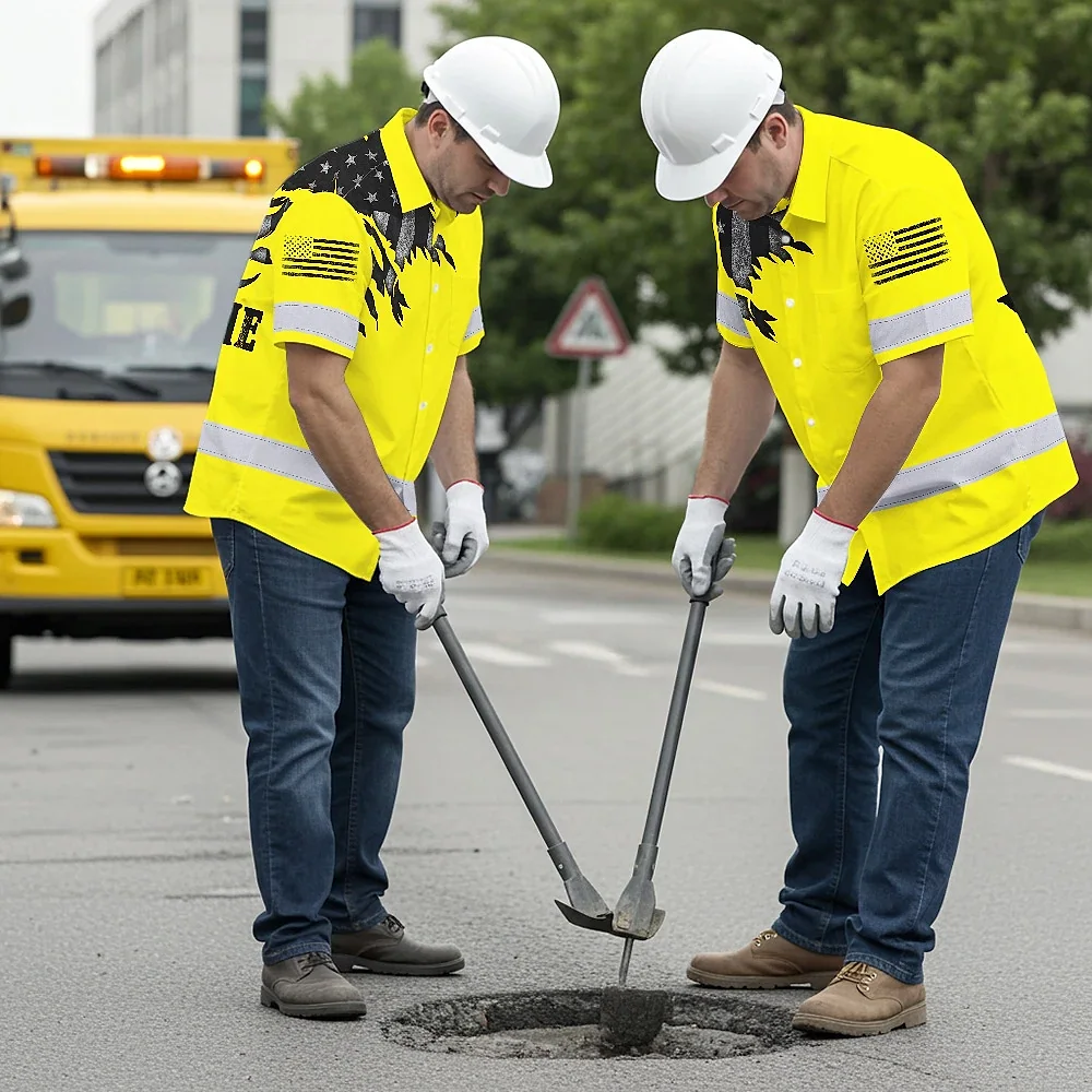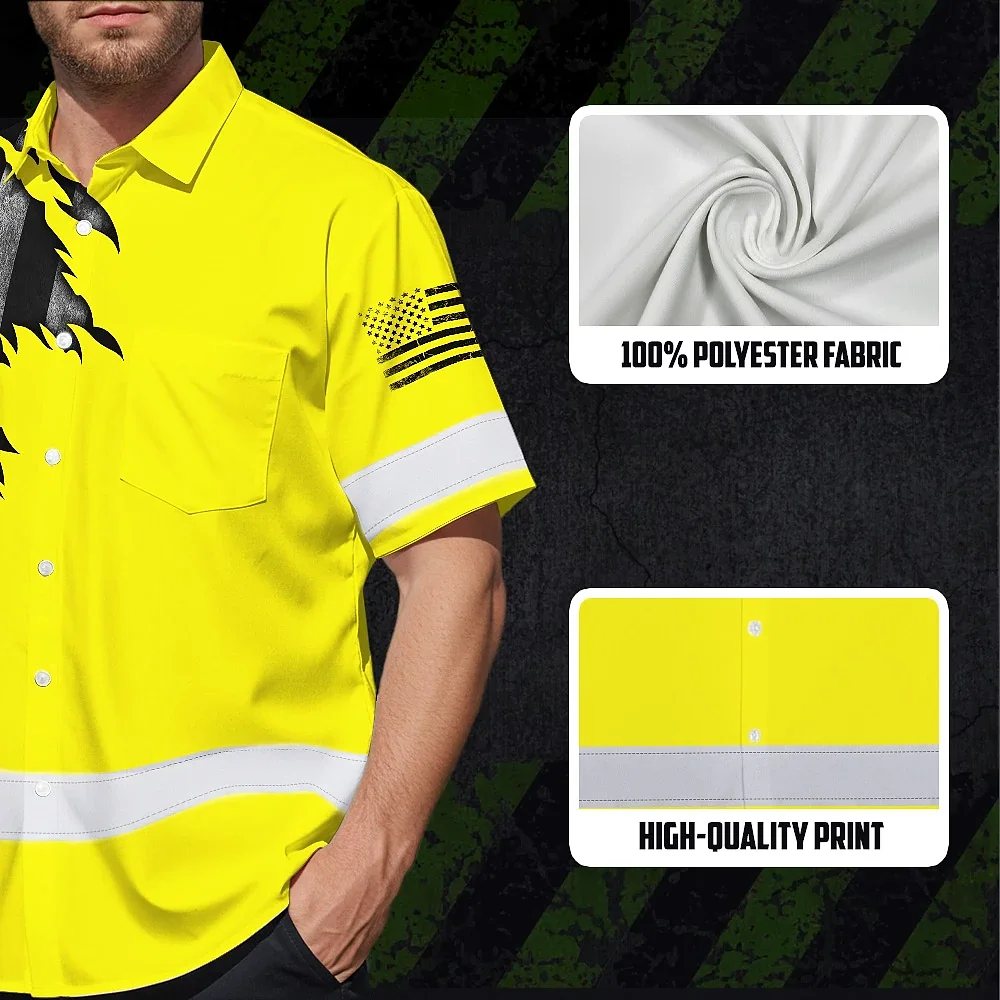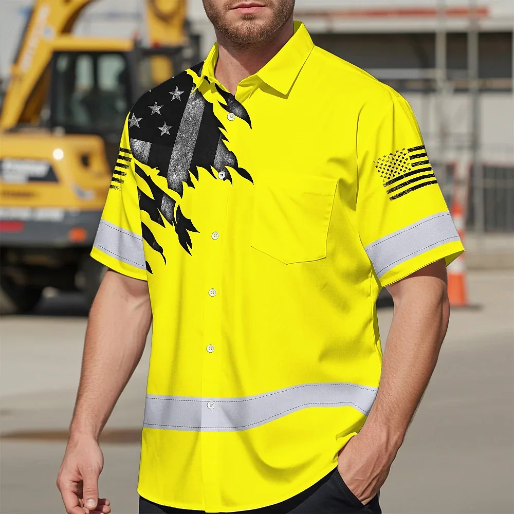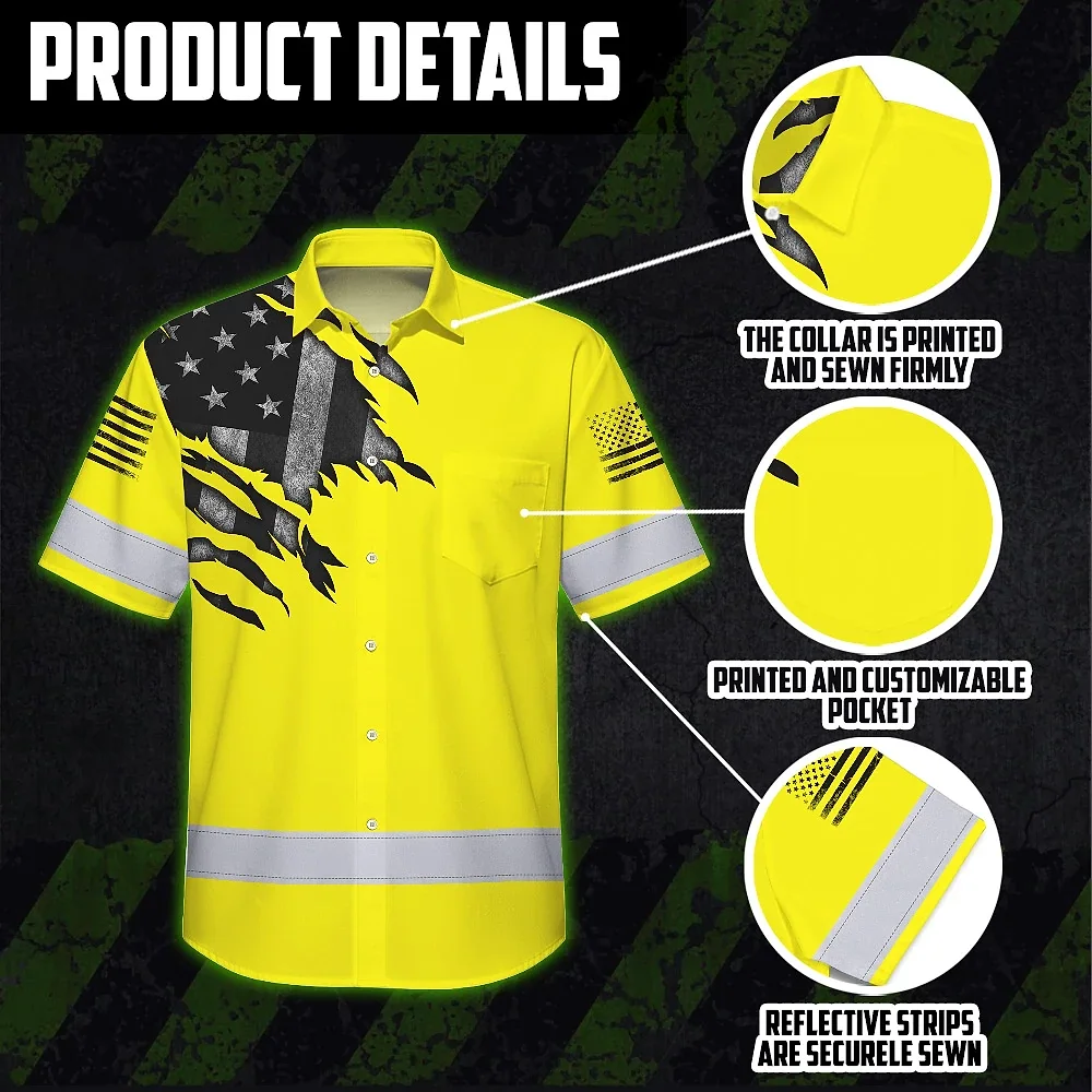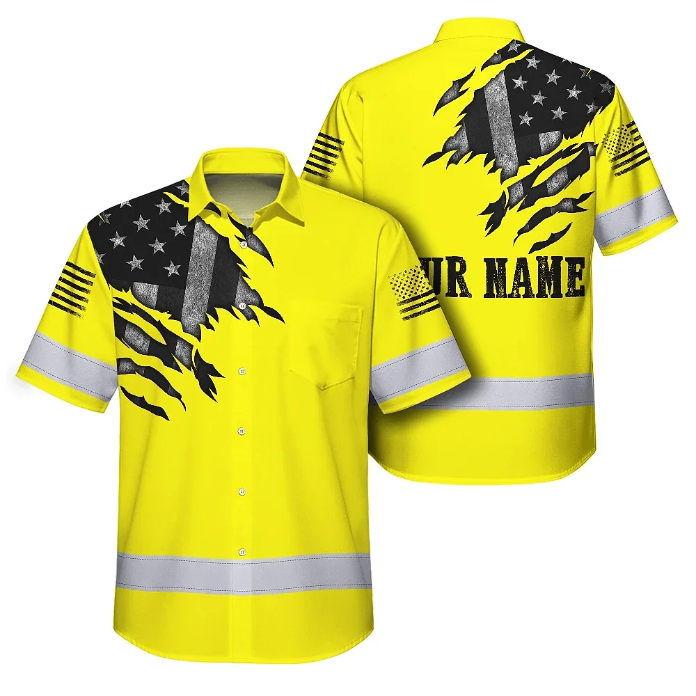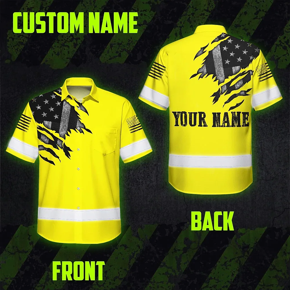 Hi Vis Hawaiian American Flag Shirt, Yellow Neon Custom Name Reflective Short Sleeve Button-up Safety Shirt for Workers