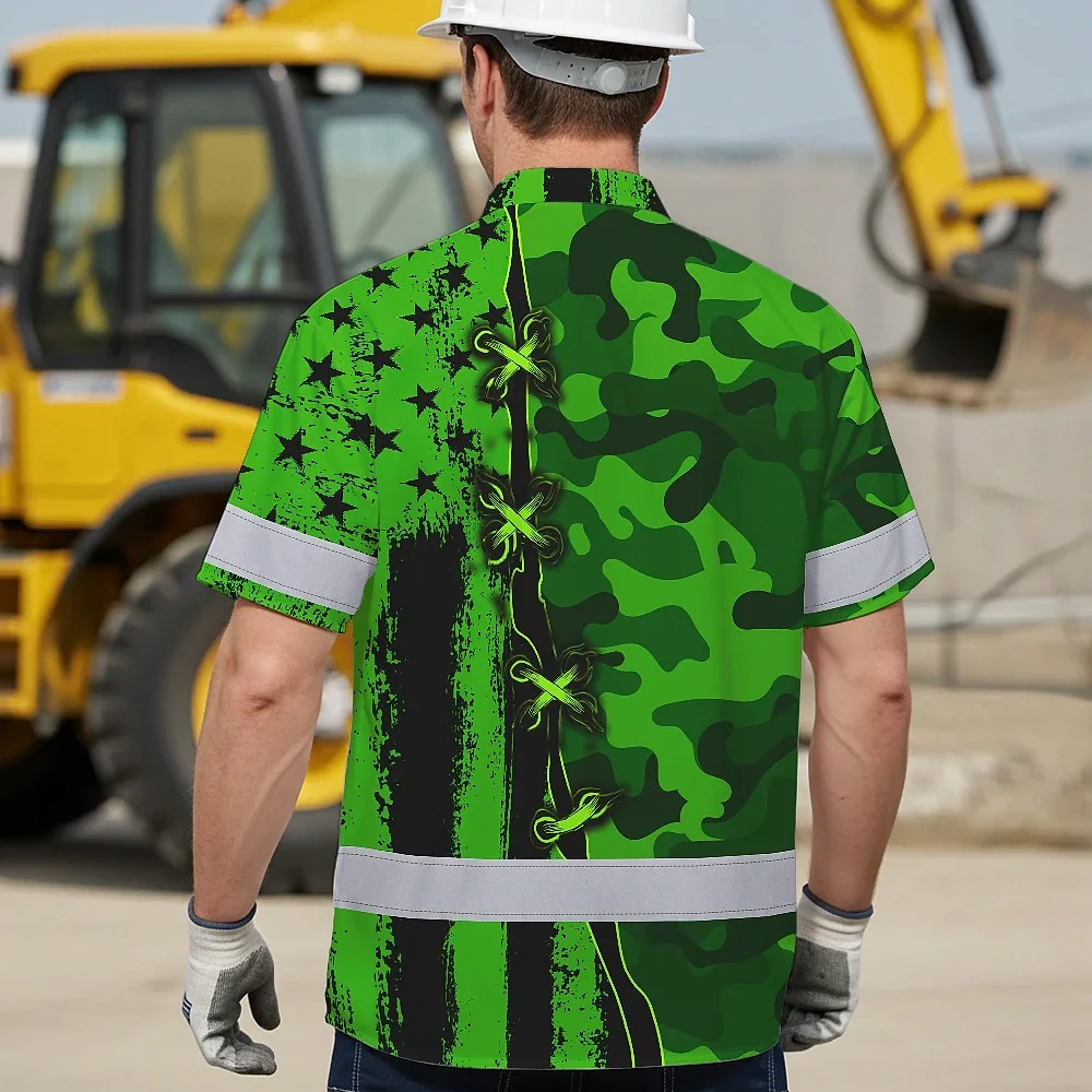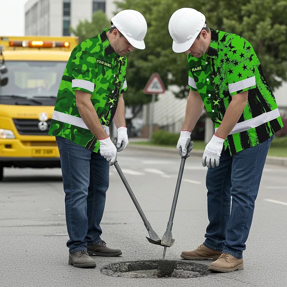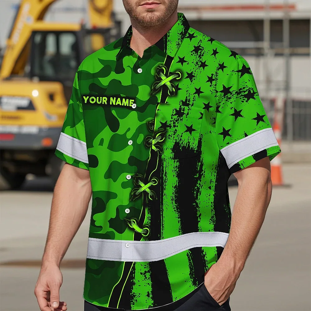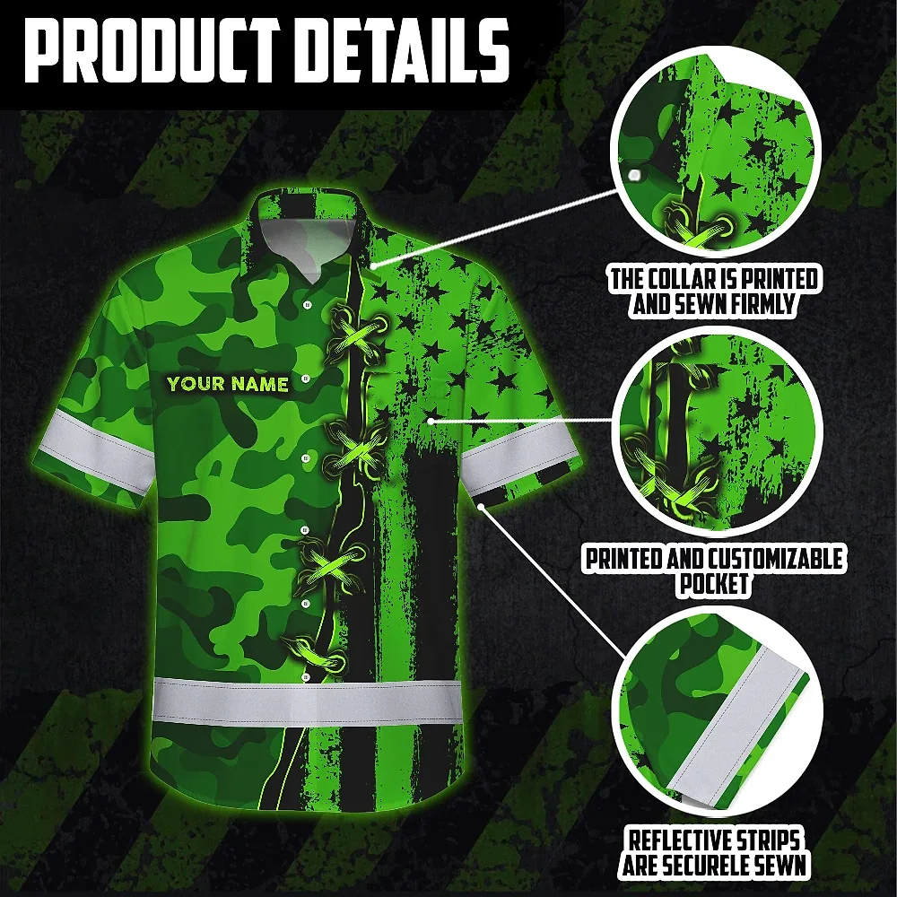 Hi Vis Hawaiian Shirt Custom Name, Pattern Skull Camo Reflective Safety Workwear For Workers, Runners, Truckers, Skull Lovers