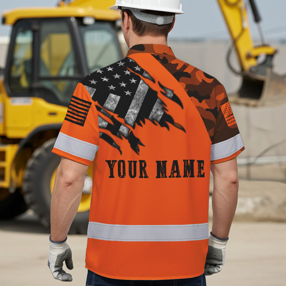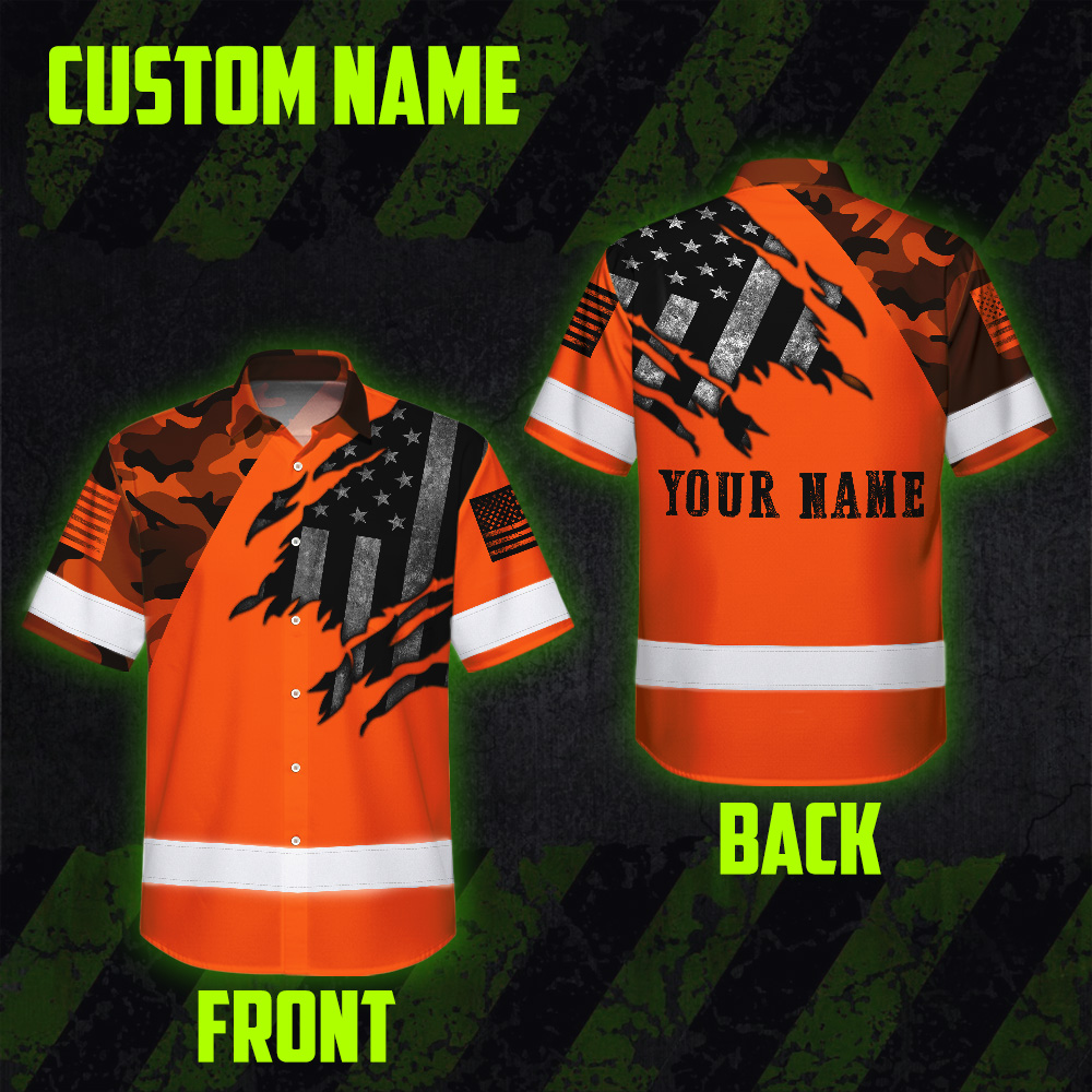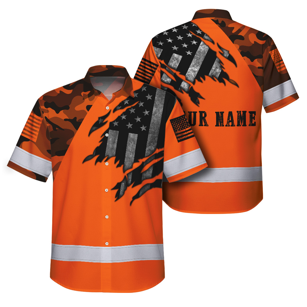 Hi Vis Hawaiian Shirt For Men Camo Orange Neon Scratch US Flag Custom Name Safety Workwear