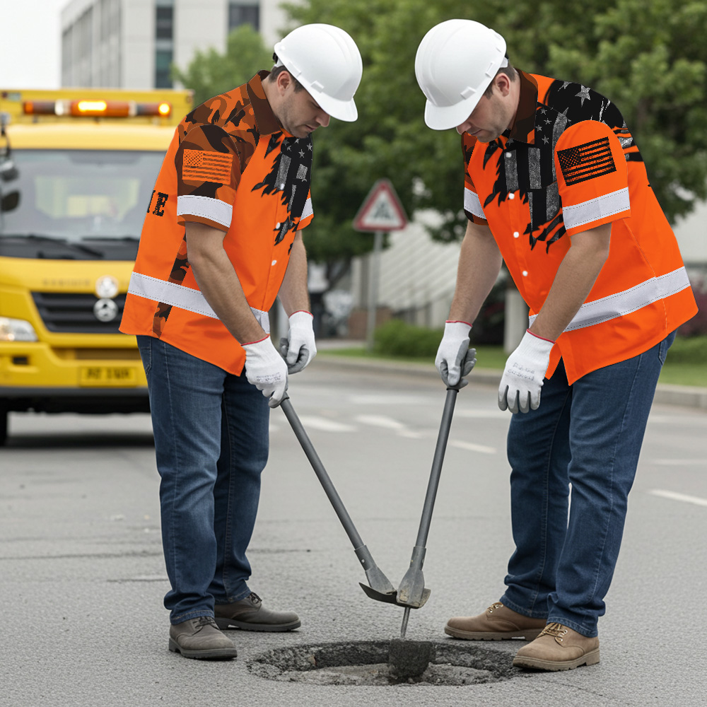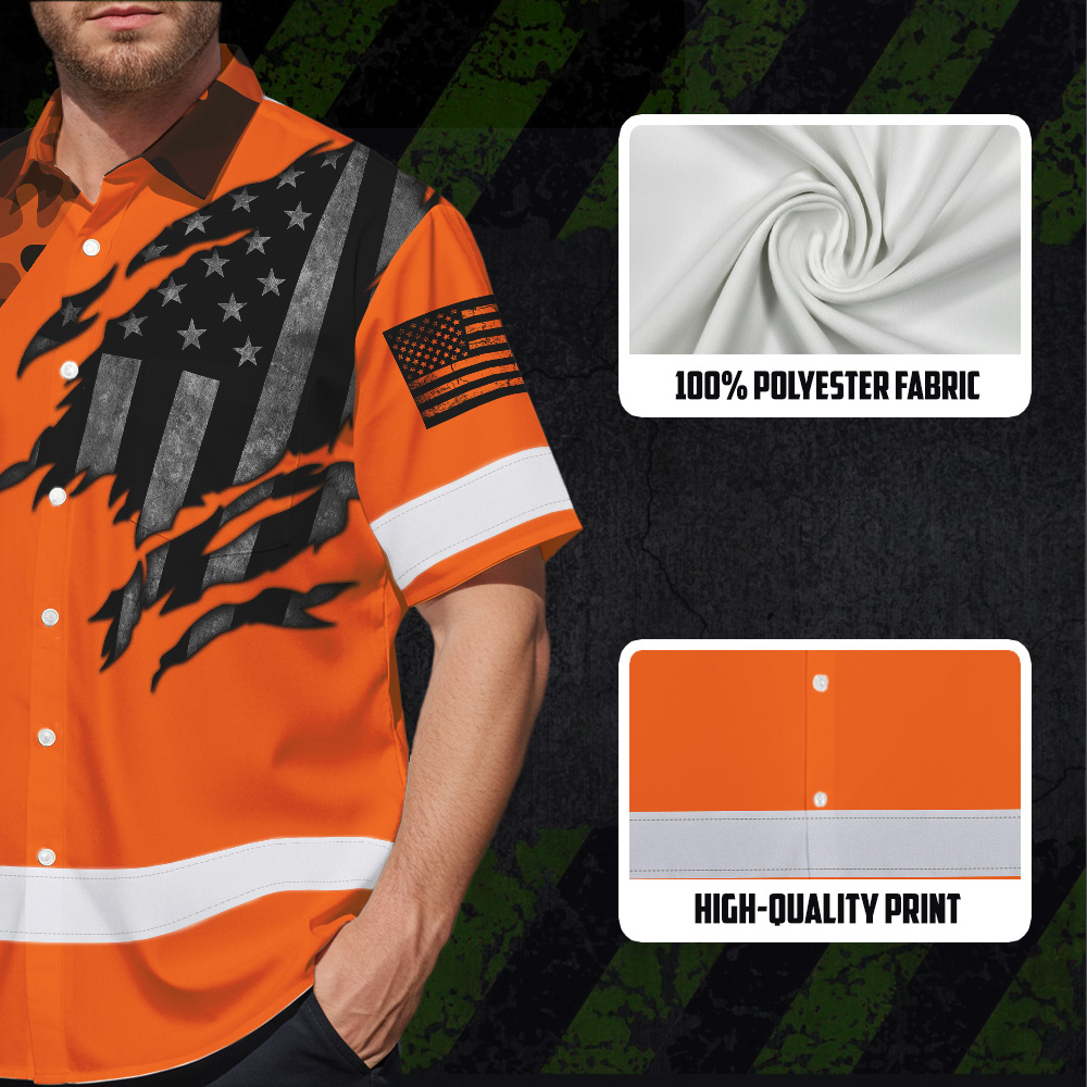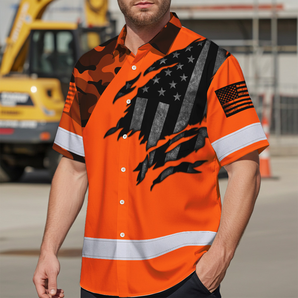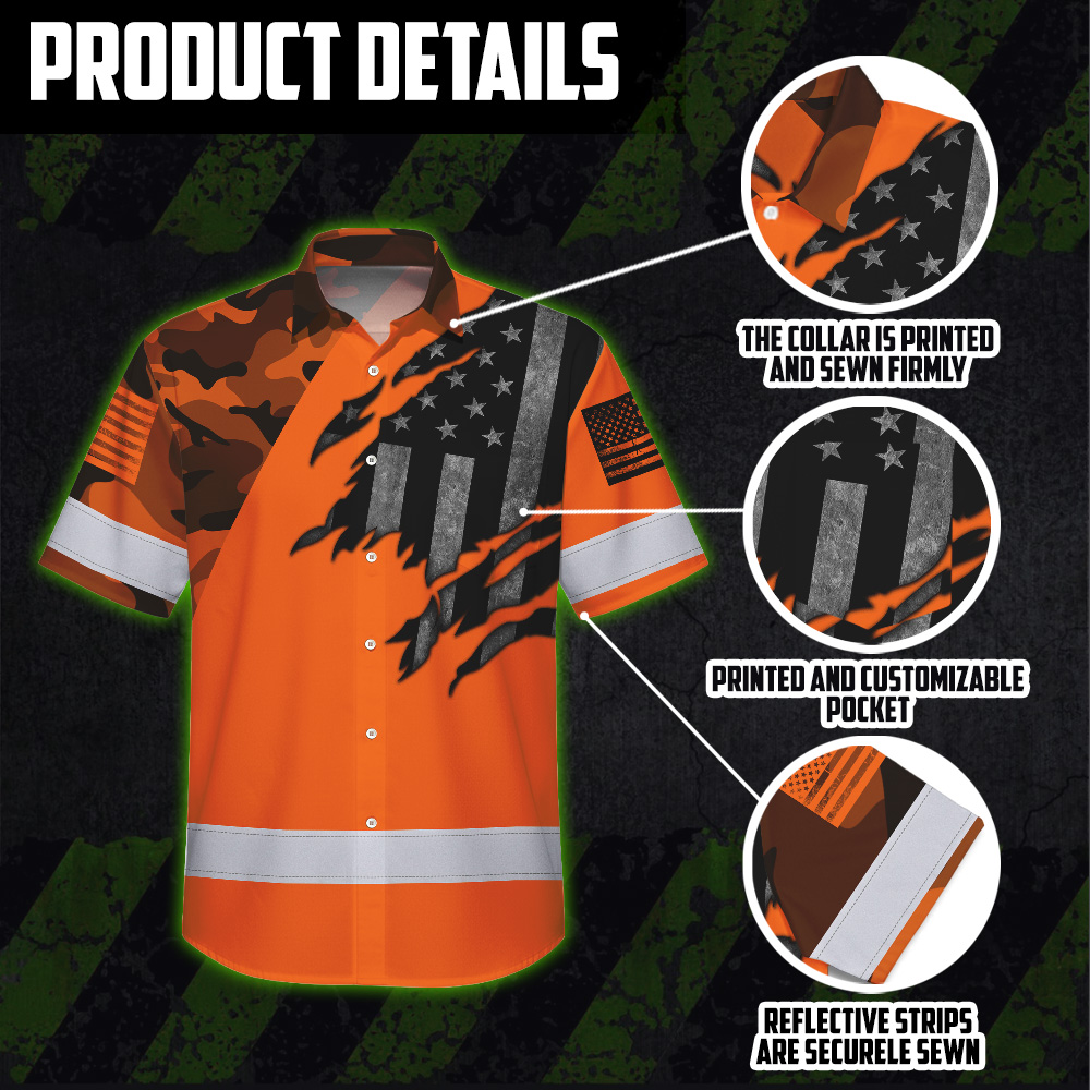 Hi Vis Hawaiian Shirt For Men Camo Orange Neon Scratch US Flag Custom Name Safety Workwear