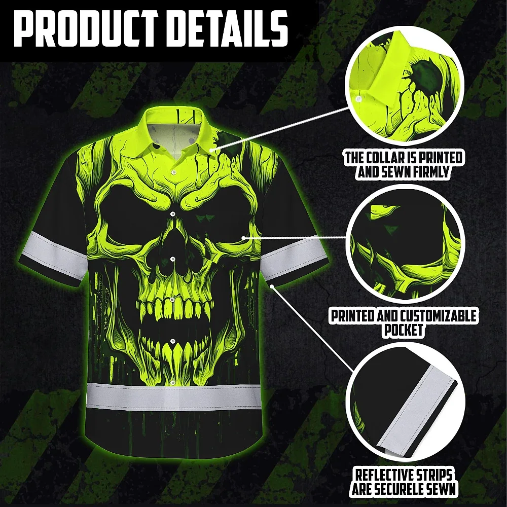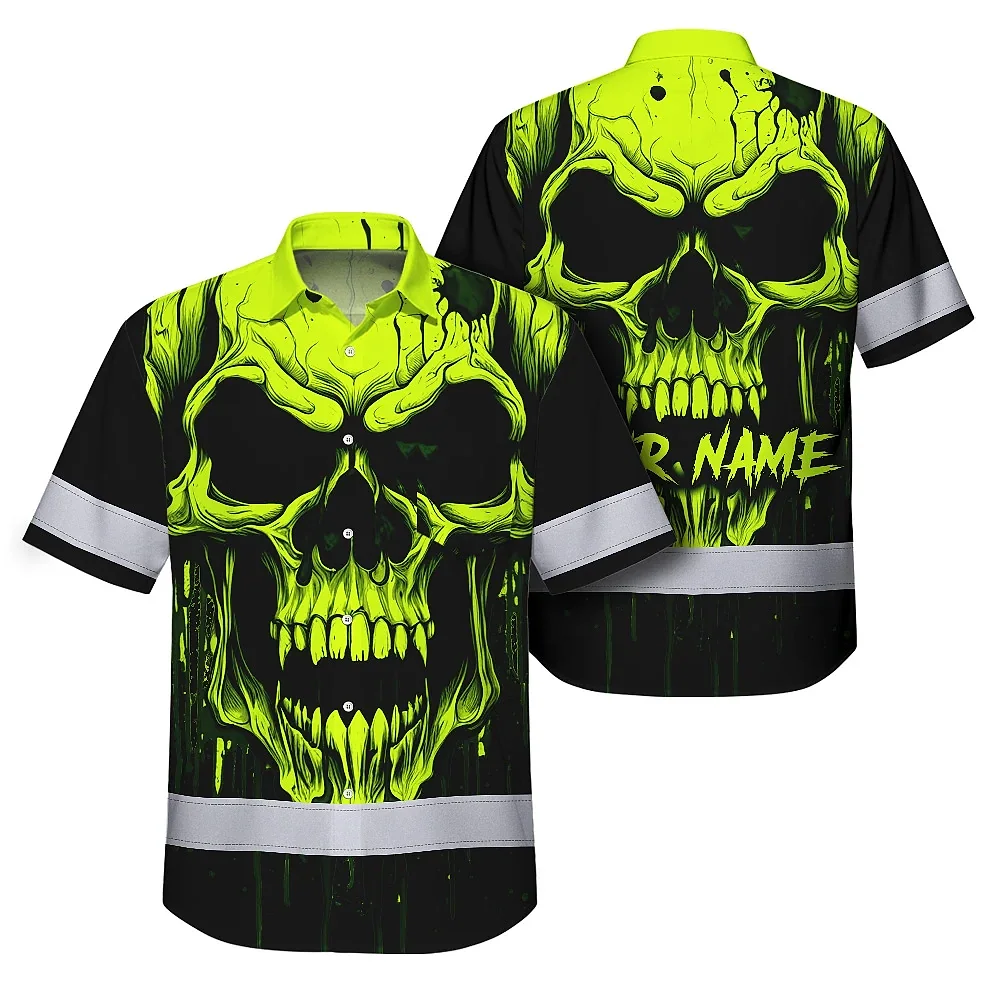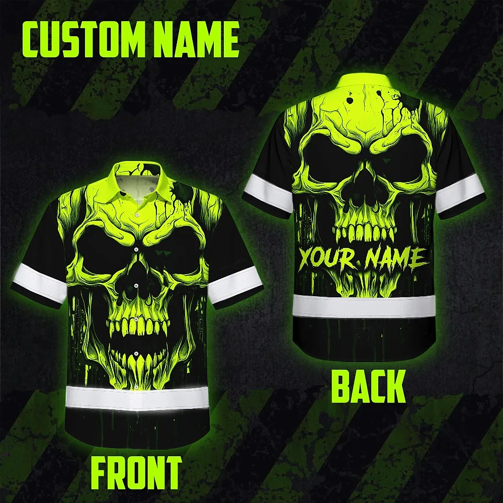 Hi Vis Hawaiian Shirt Reflective Lime Neon Skull Custom Name Safety Workwear For Runners, Cyclists, Skull Lover