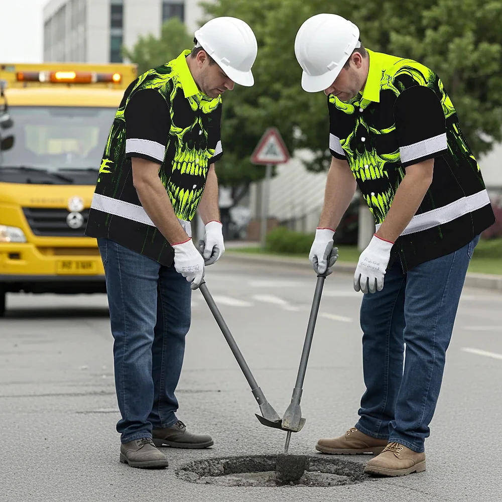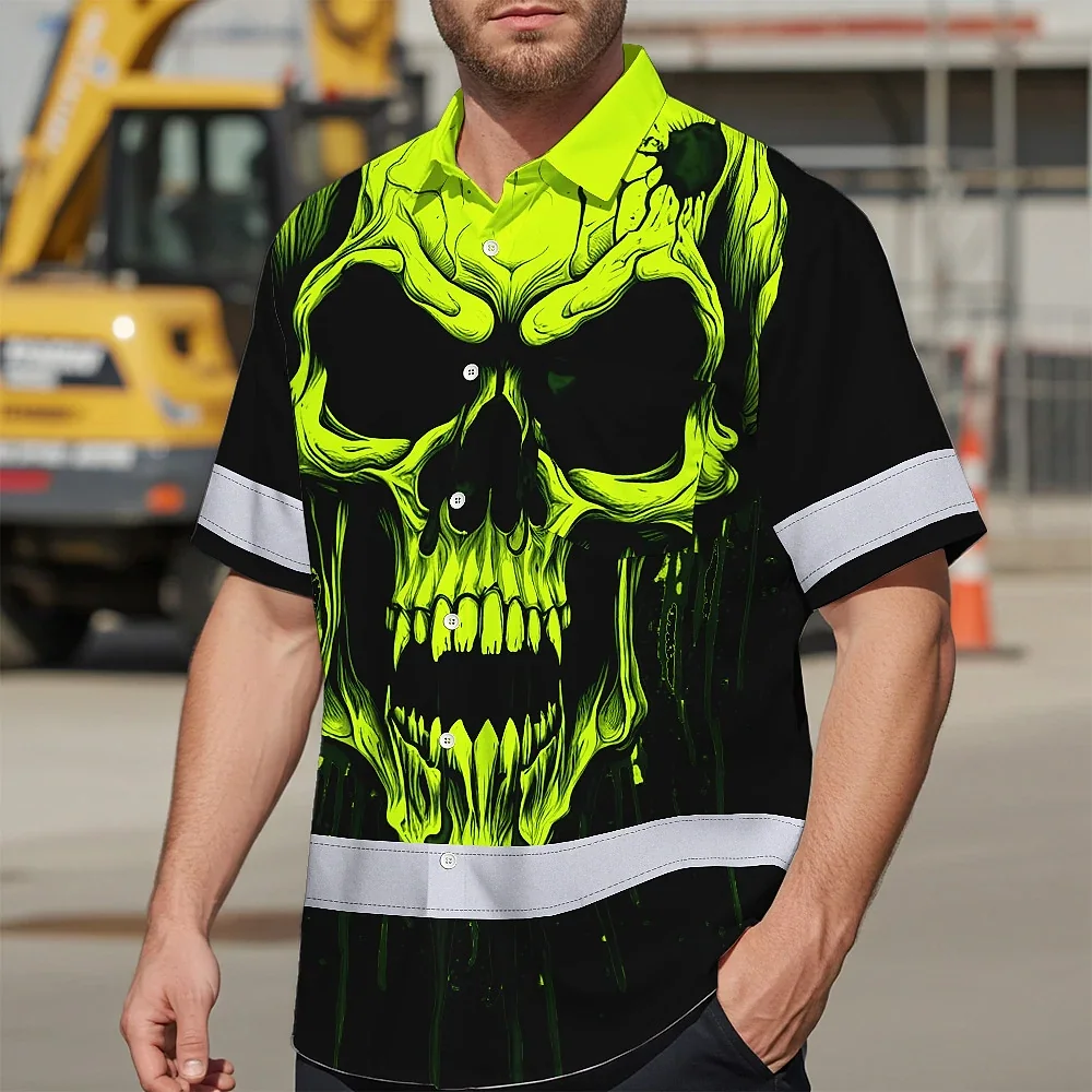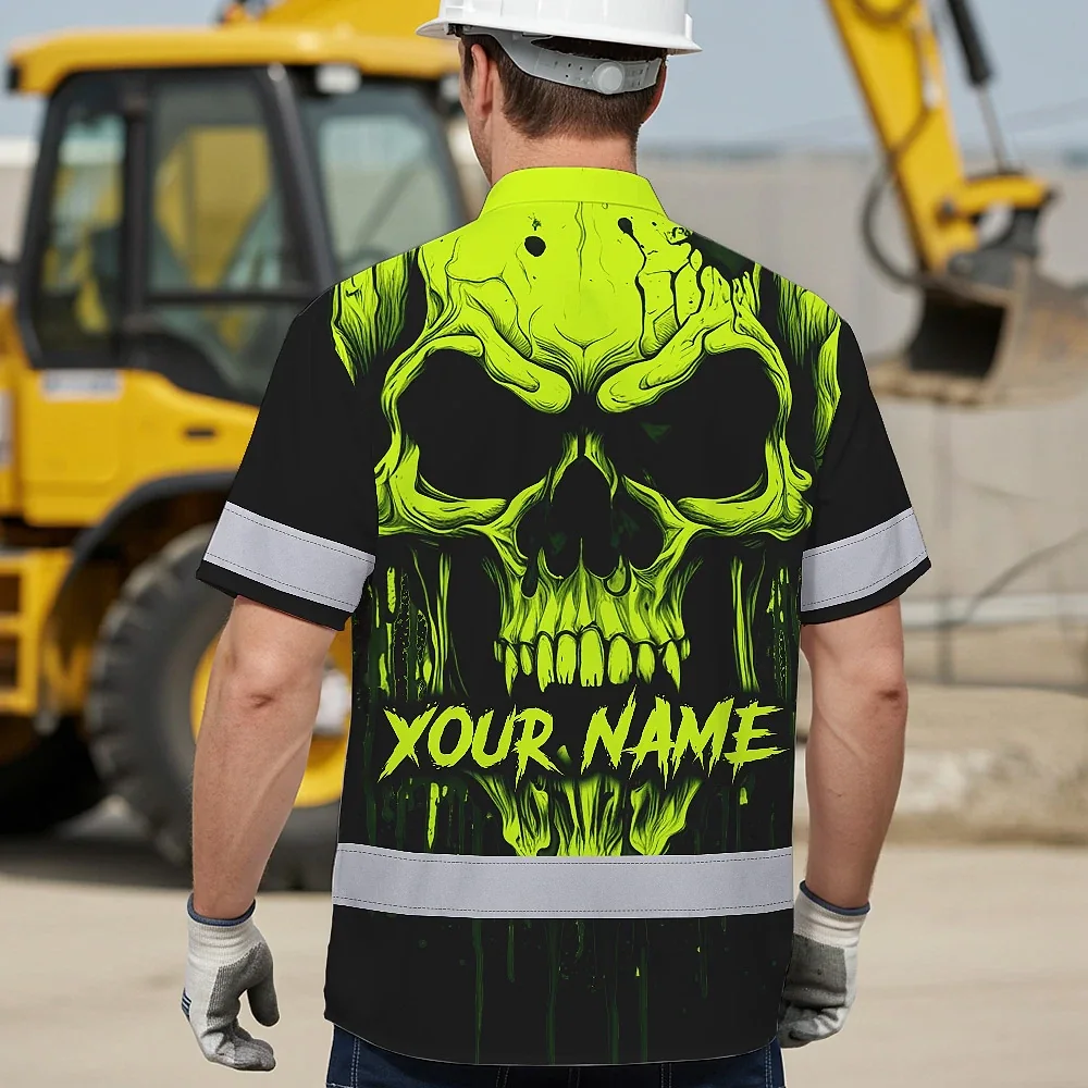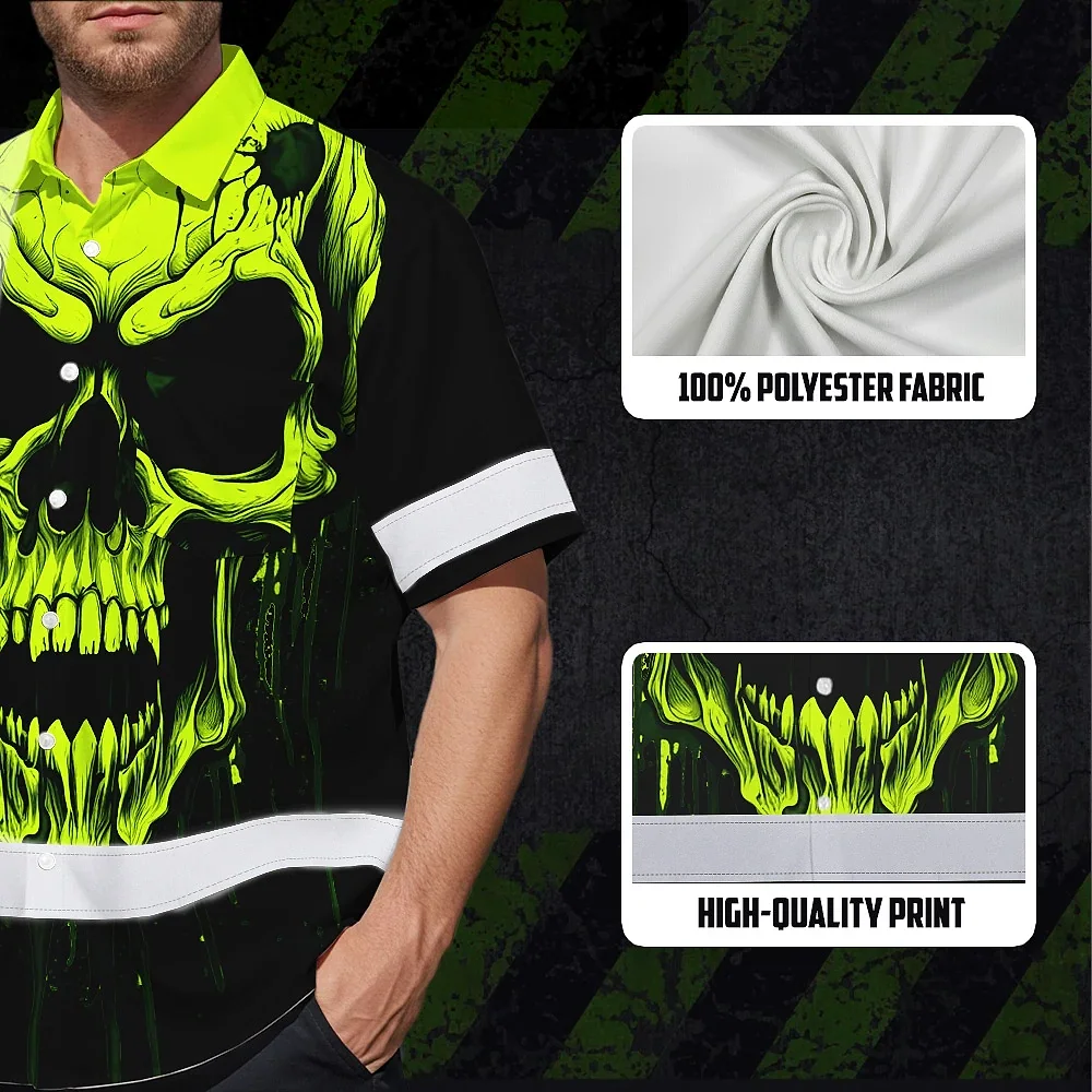 Hi Vis Hawaiian Shirt Reflective Lime Neon Skull Custom Name Safety Workwear For Runners, Cyclists, Skull Lover
