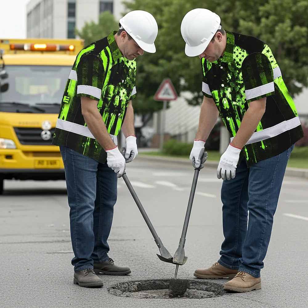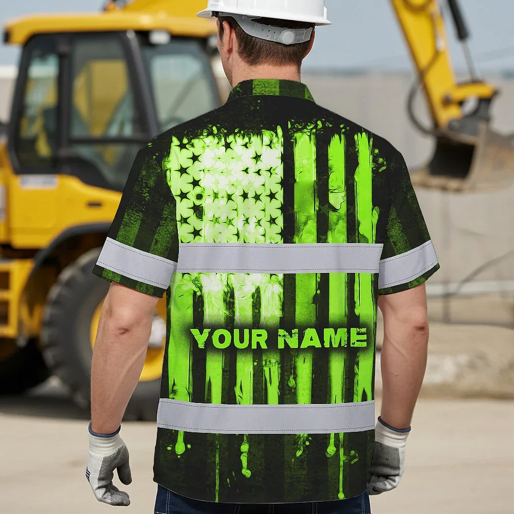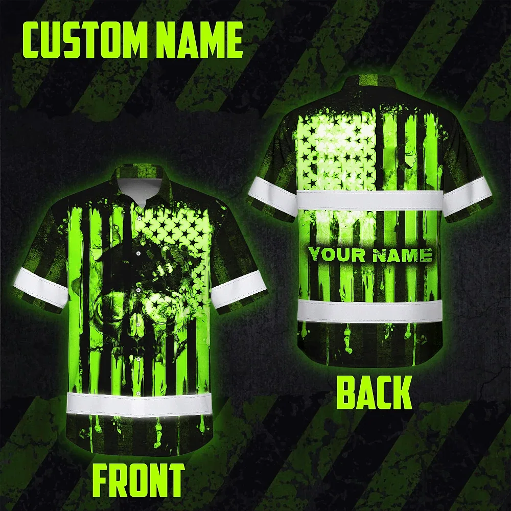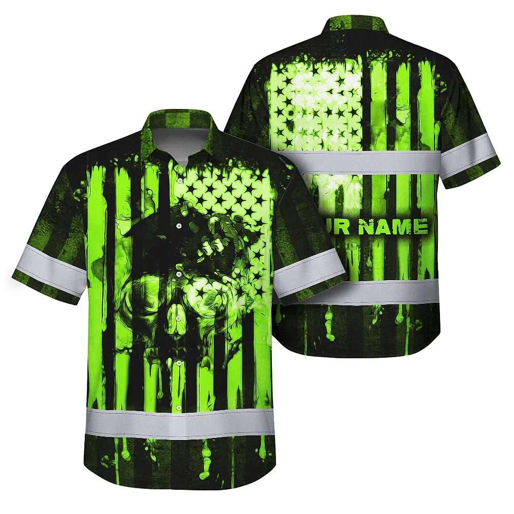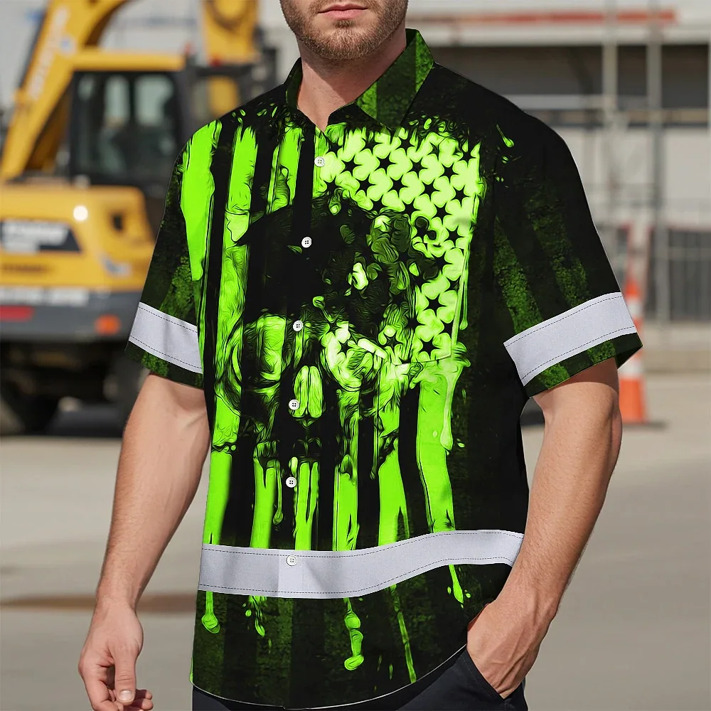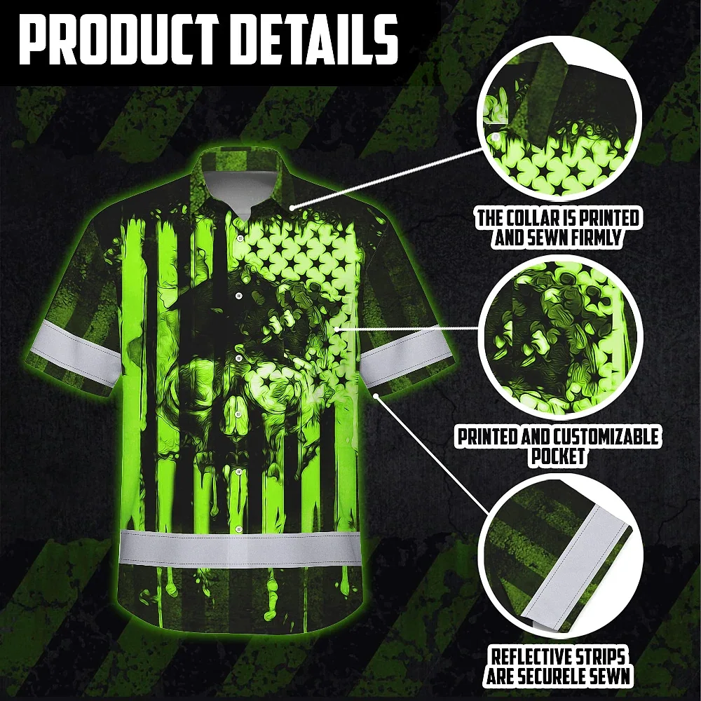 Hi Vis Hawaiian Shirt Reflective Skull USA Flag Green Neon Safety Workwear