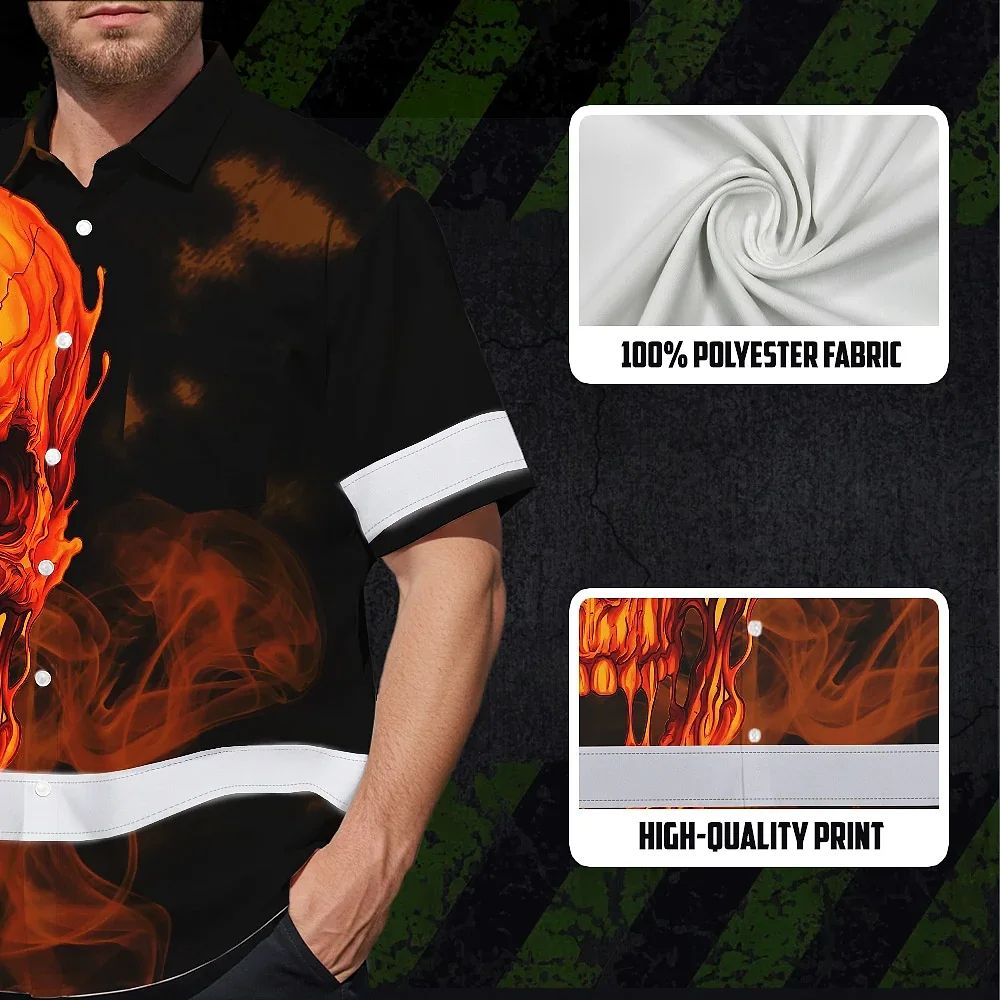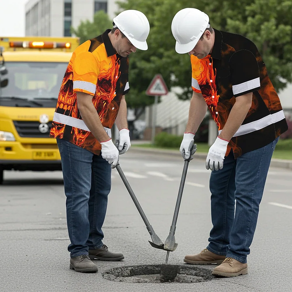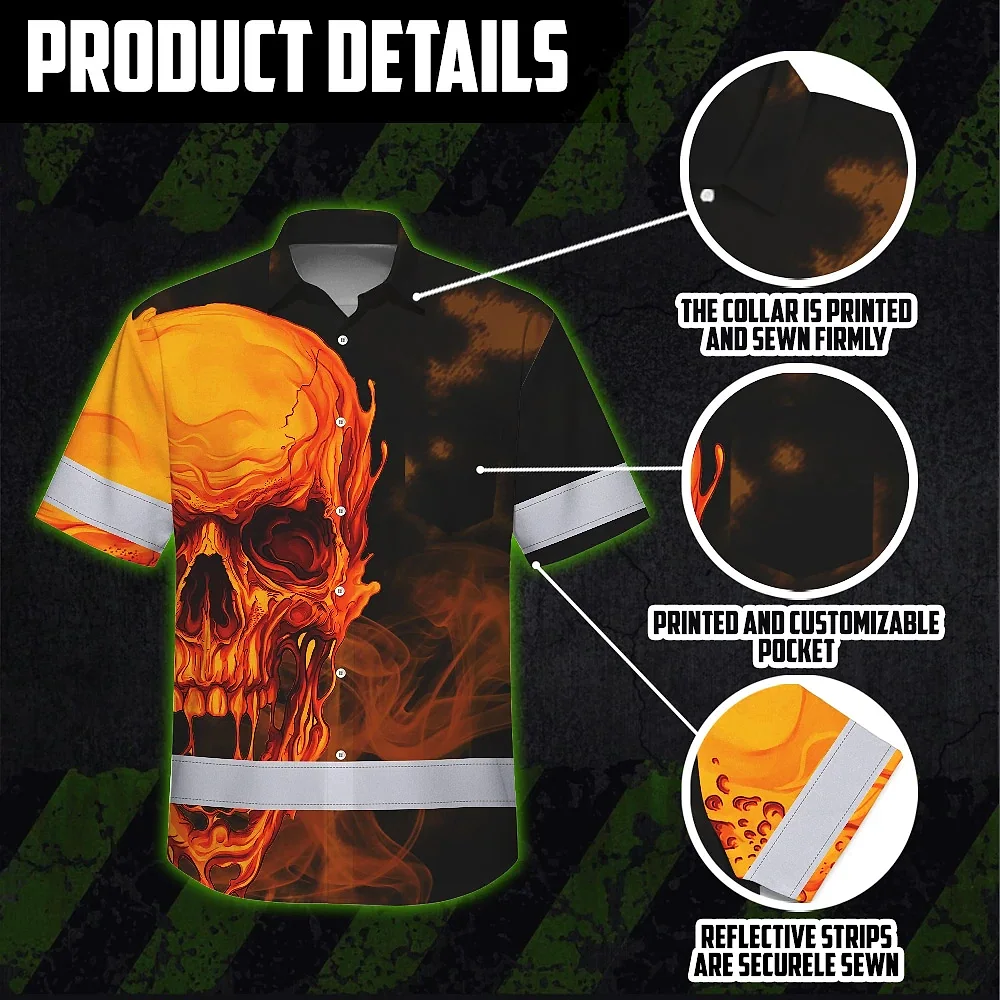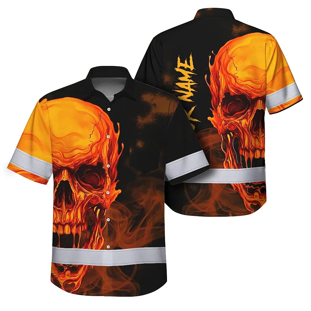 Hi Vis Hawaiian Shirt Reflective Tapes Black And Orange Skull Custom Name Safety Workwear For Workers, Truckers, Operators
