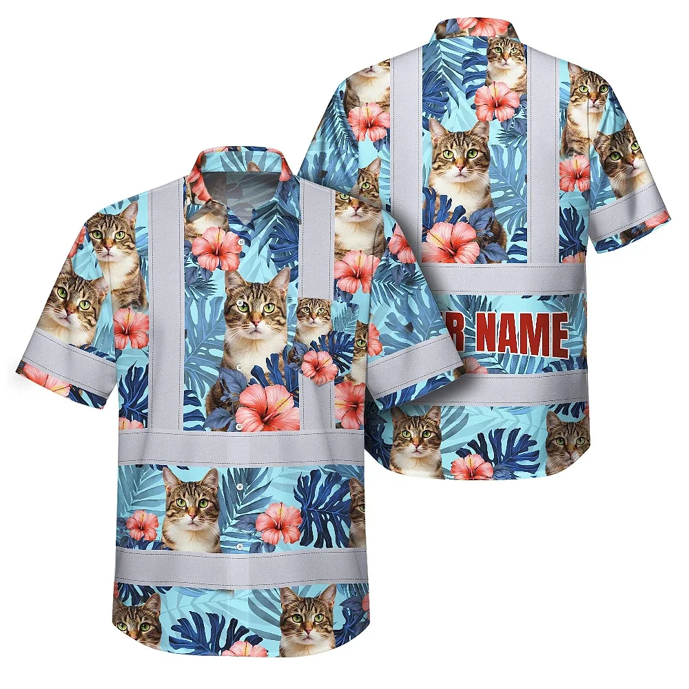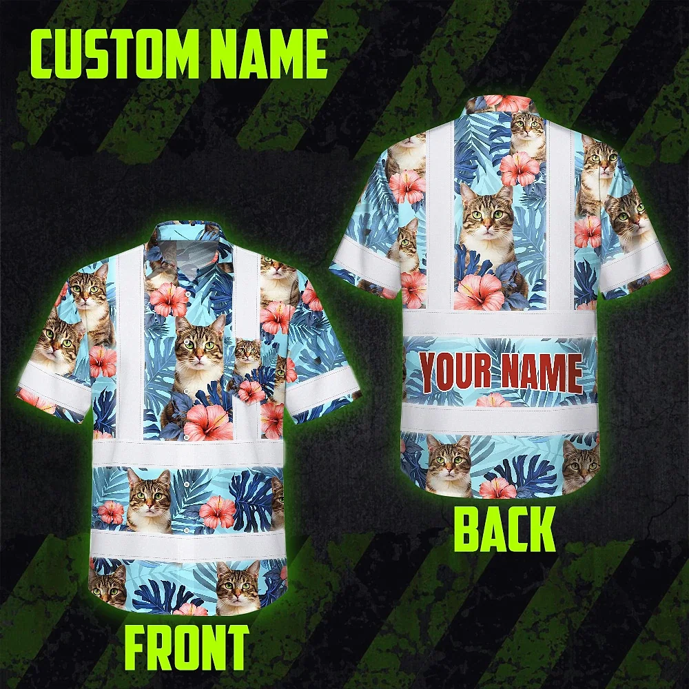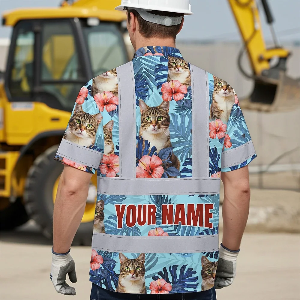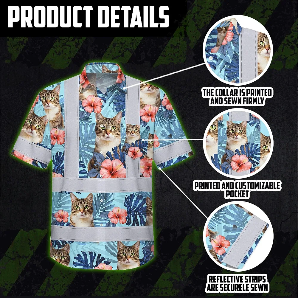 Hi Vis Hawaiian Shirt Reflective Tapes Blue Custom Name And Image Safety Workwear For Workers, Truckers, Operators, Company, Pet Lovers