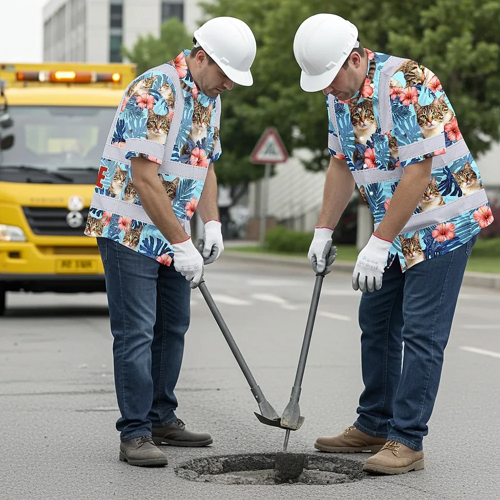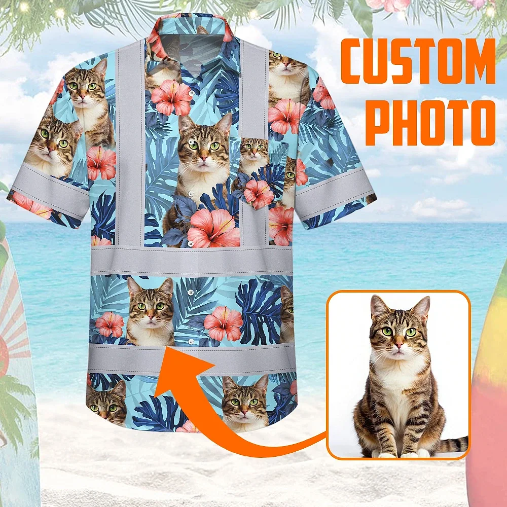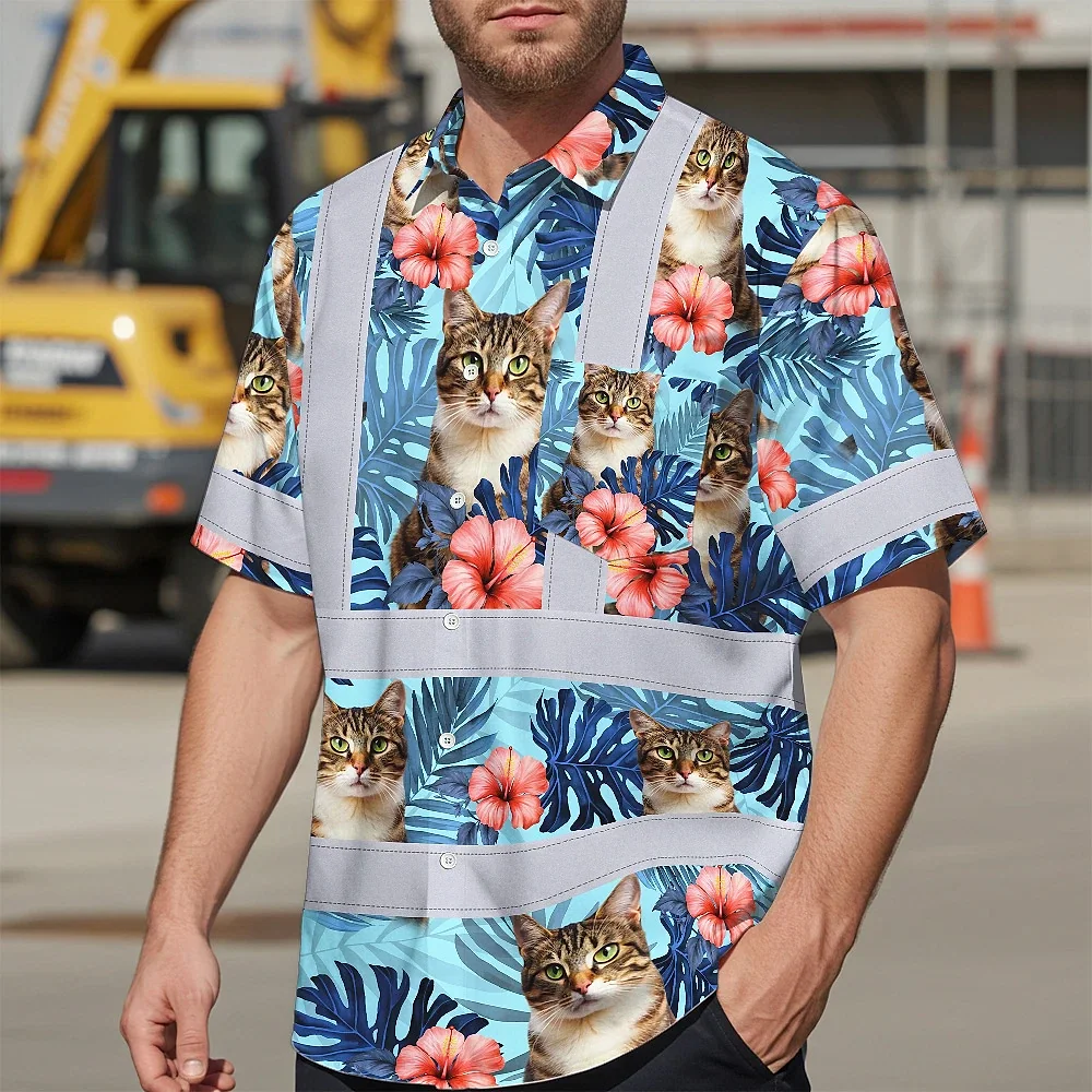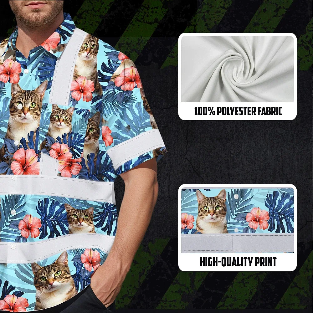 Hi Vis Hawaiian Shirt Reflective Tapes Blue Custom Name And Image Safety Workwear For Workers, Truckers, Operators, Company, Pet Lovers
