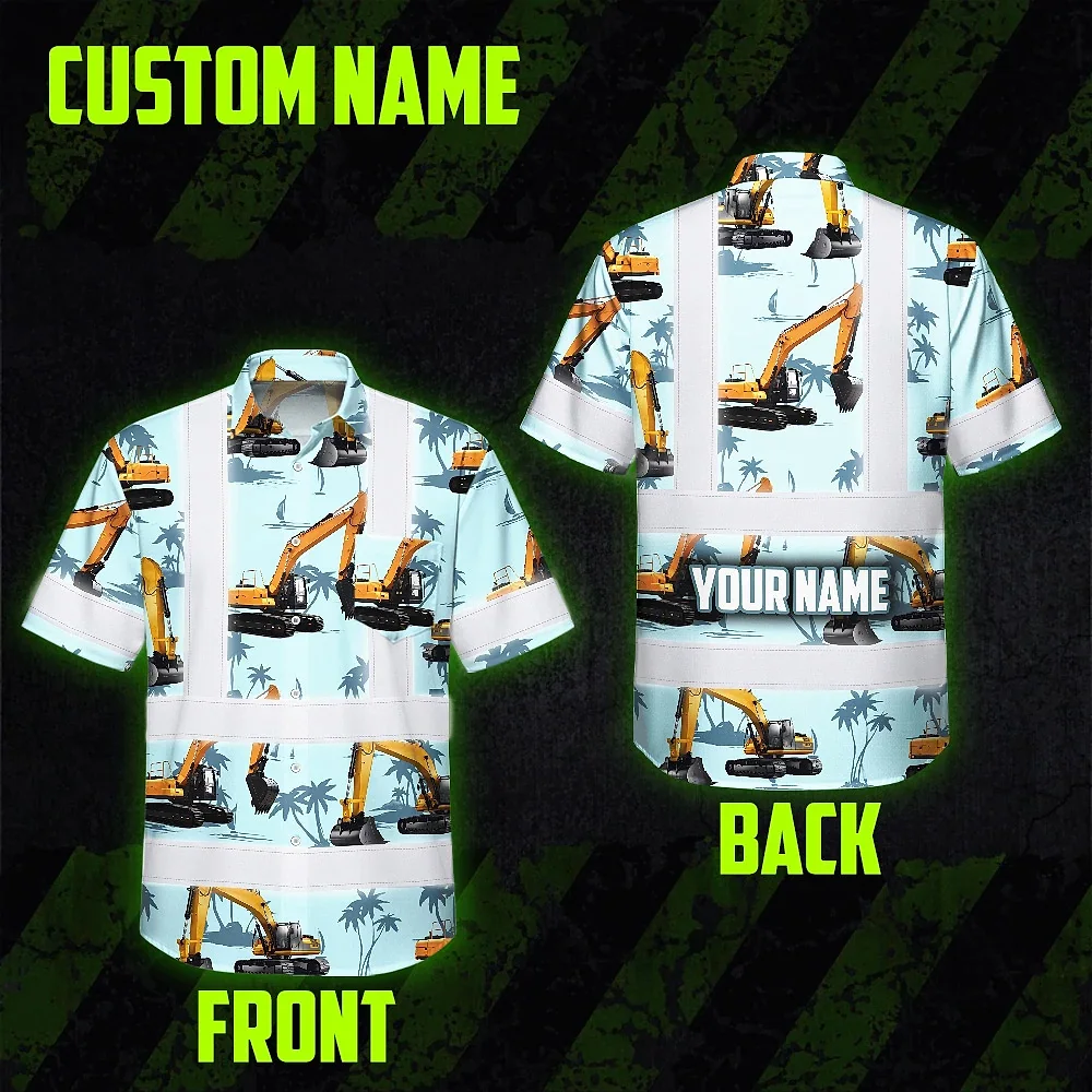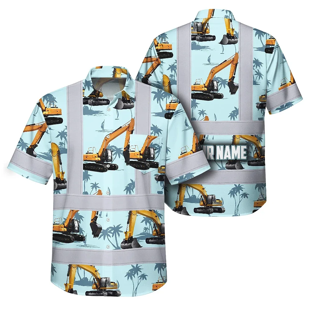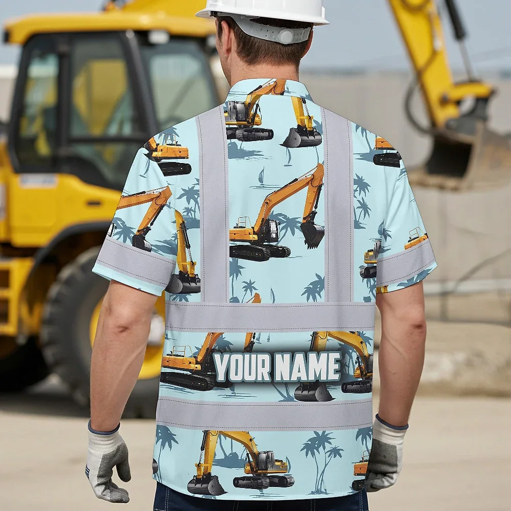 Hi Vis Hawaiian Shirt Reflective Tapes Blue Excavator Custom Name Safety Workwear For Workers, Truckers, Operators