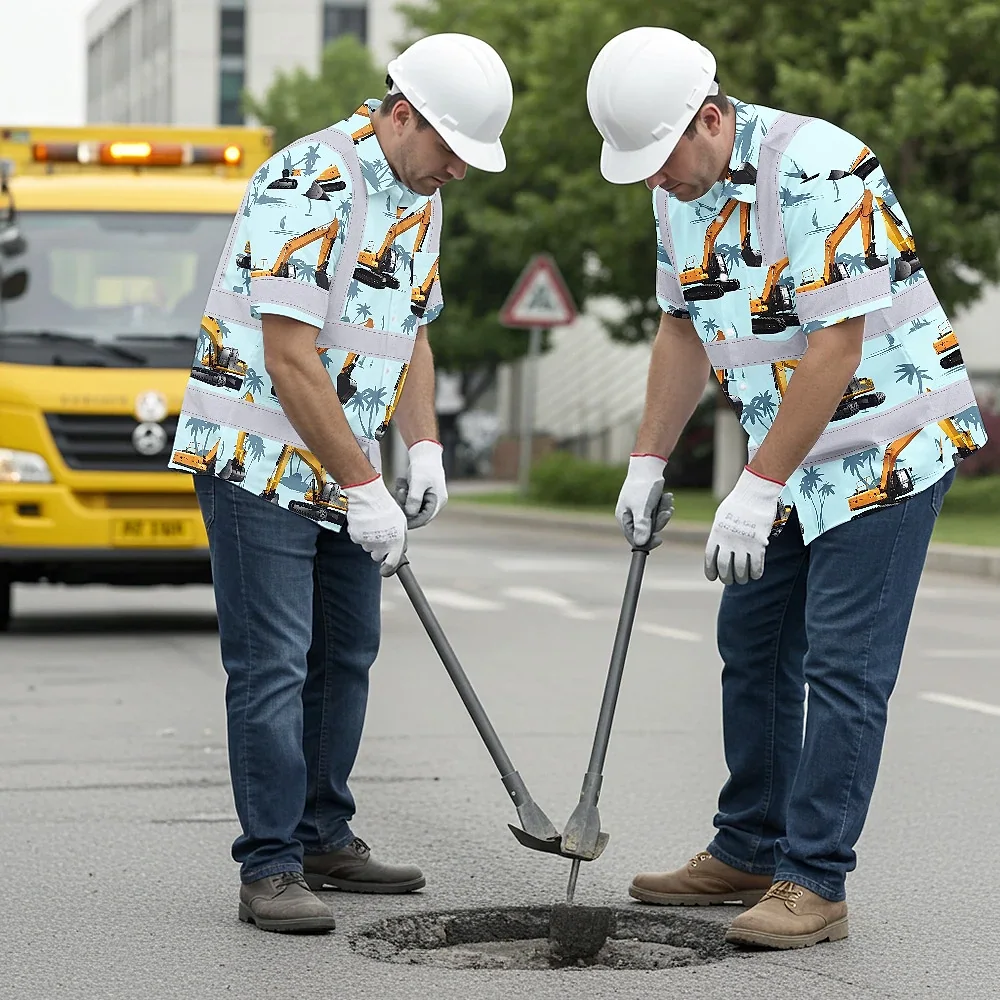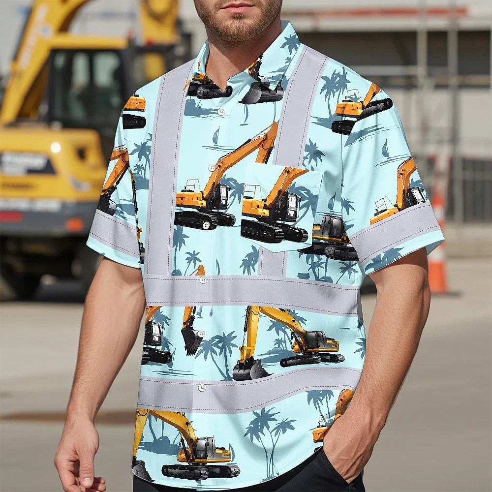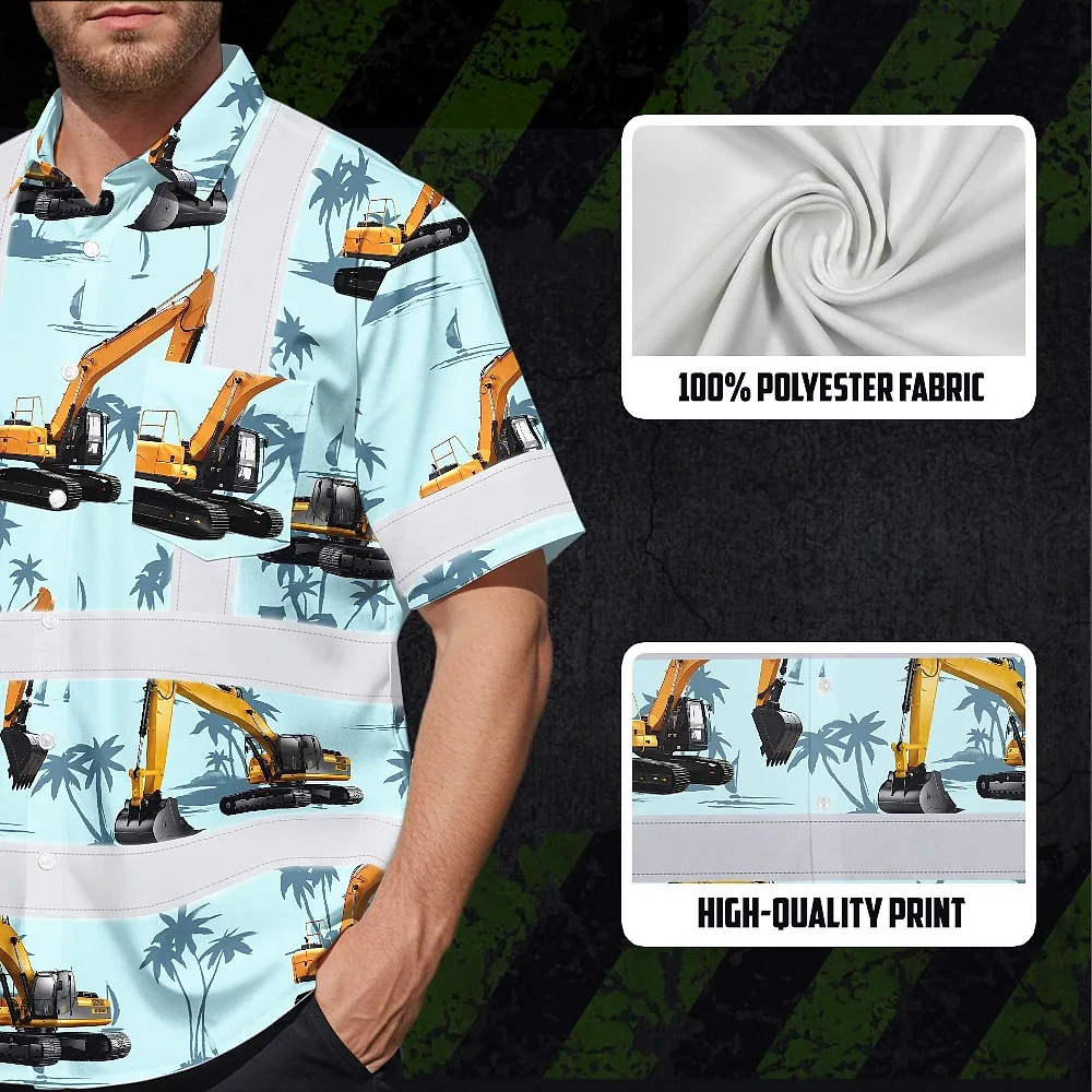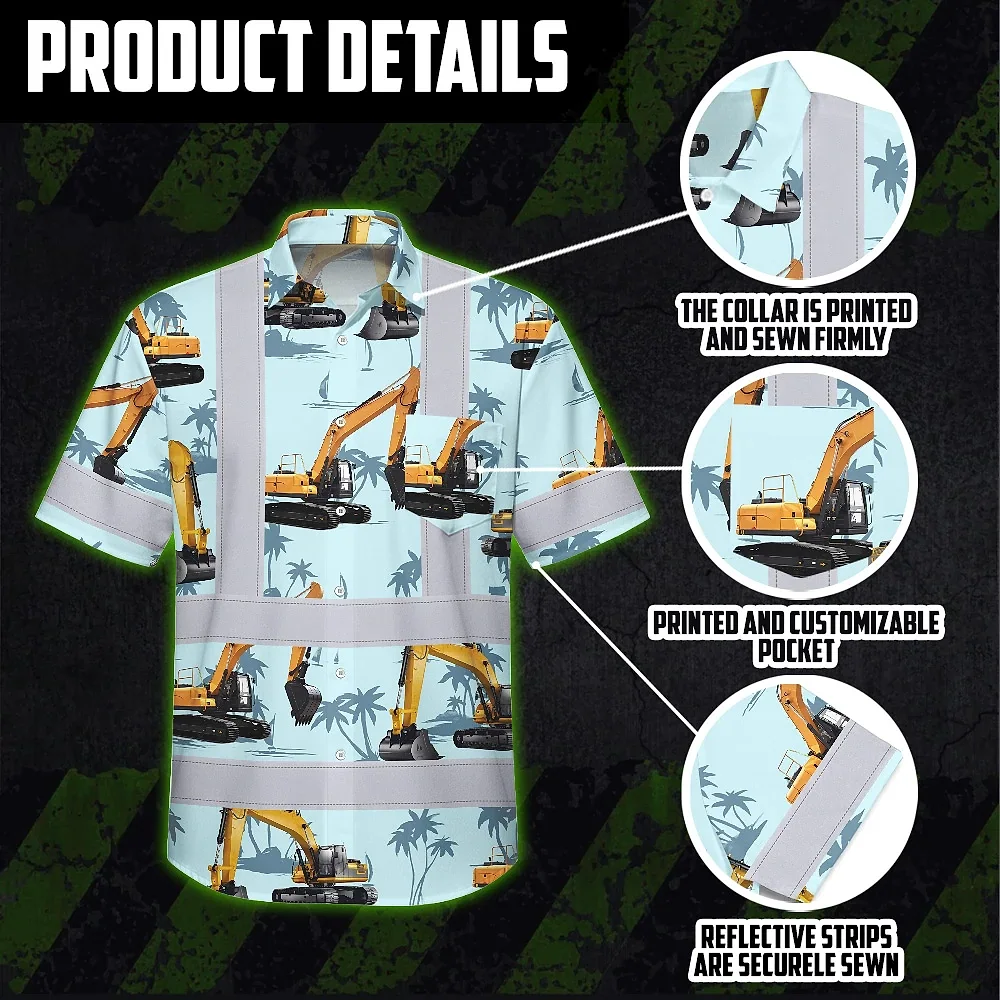 Hi Vis Hawaiian Shirt Reflective Tapes Blue Excavator Custom Name Safety Workwear For Workers, Truckers, Operators