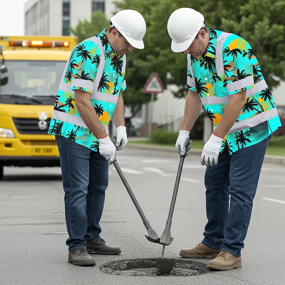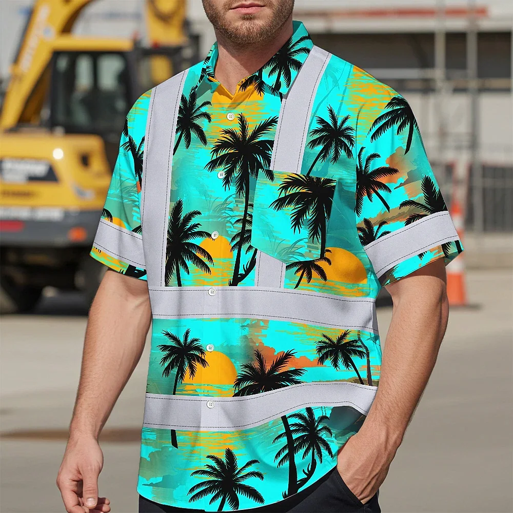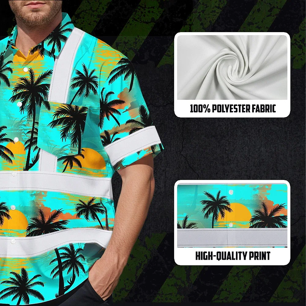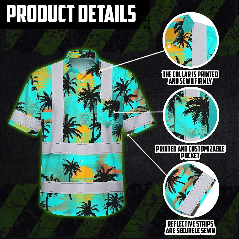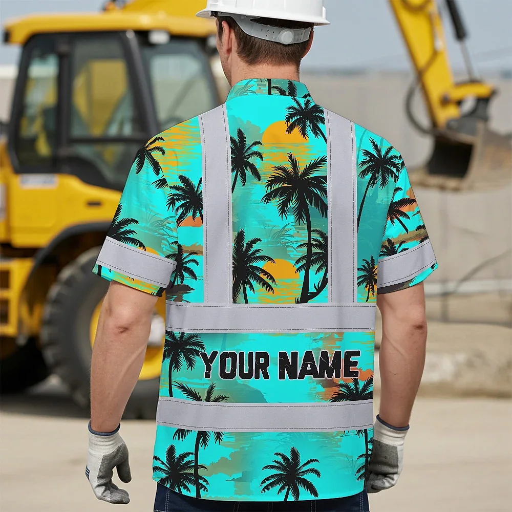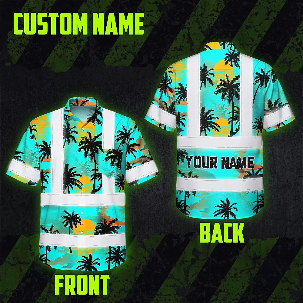 Hi Vis Hawaiian Shirt Reflective Tapes Blue Neon Flowers Custom Name Safety Workwear For Truckers, Operators