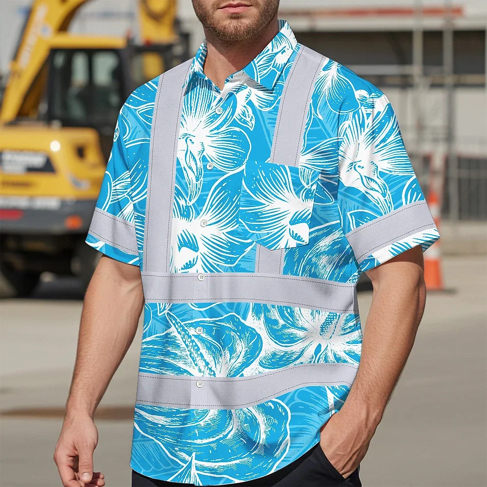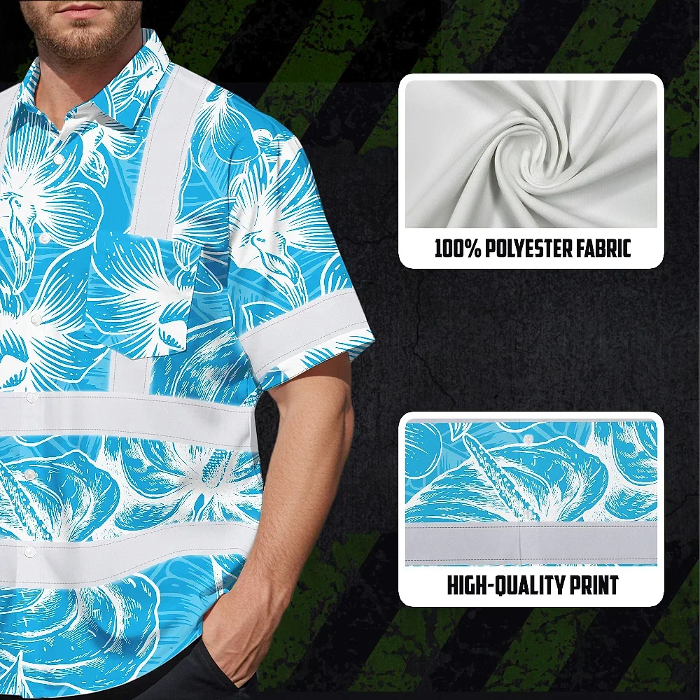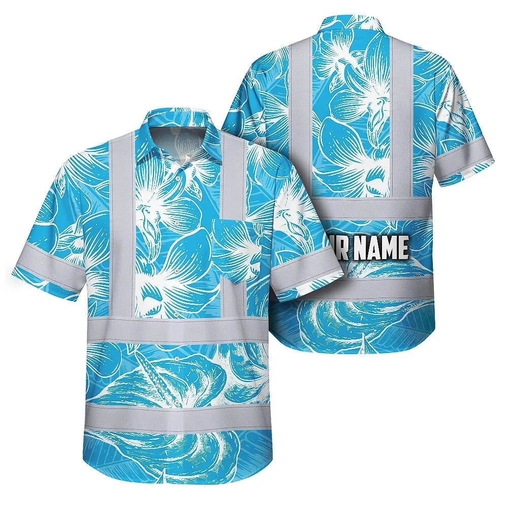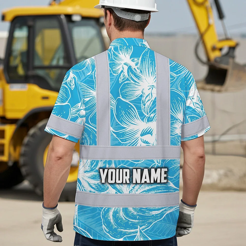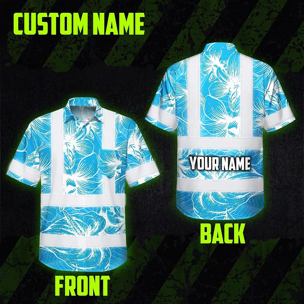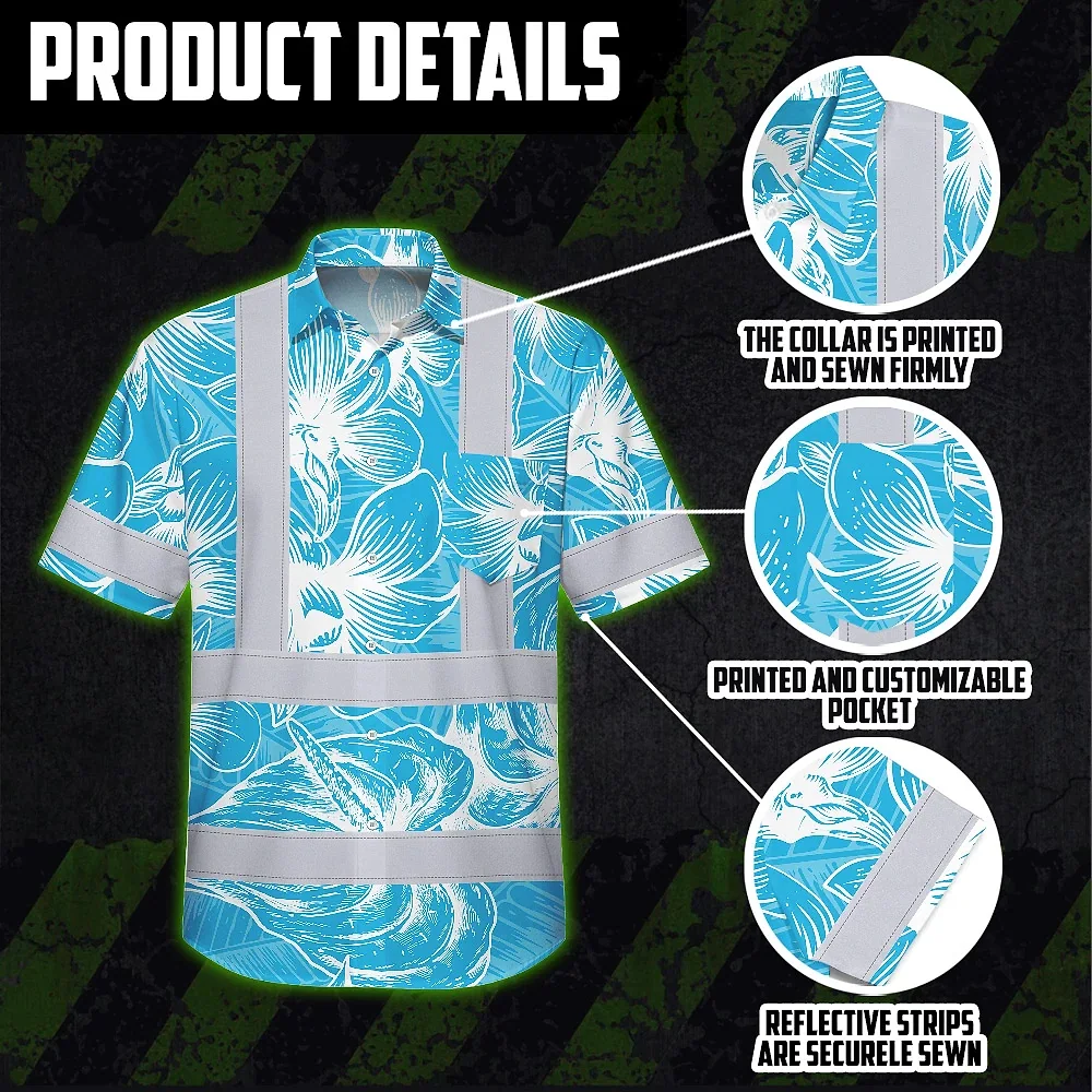 Hi Vis Hawaiian Shirt Reflective Tapes Blue Neon Flowers Custom Name Safety Workwear For Workers, Truckers, Operators