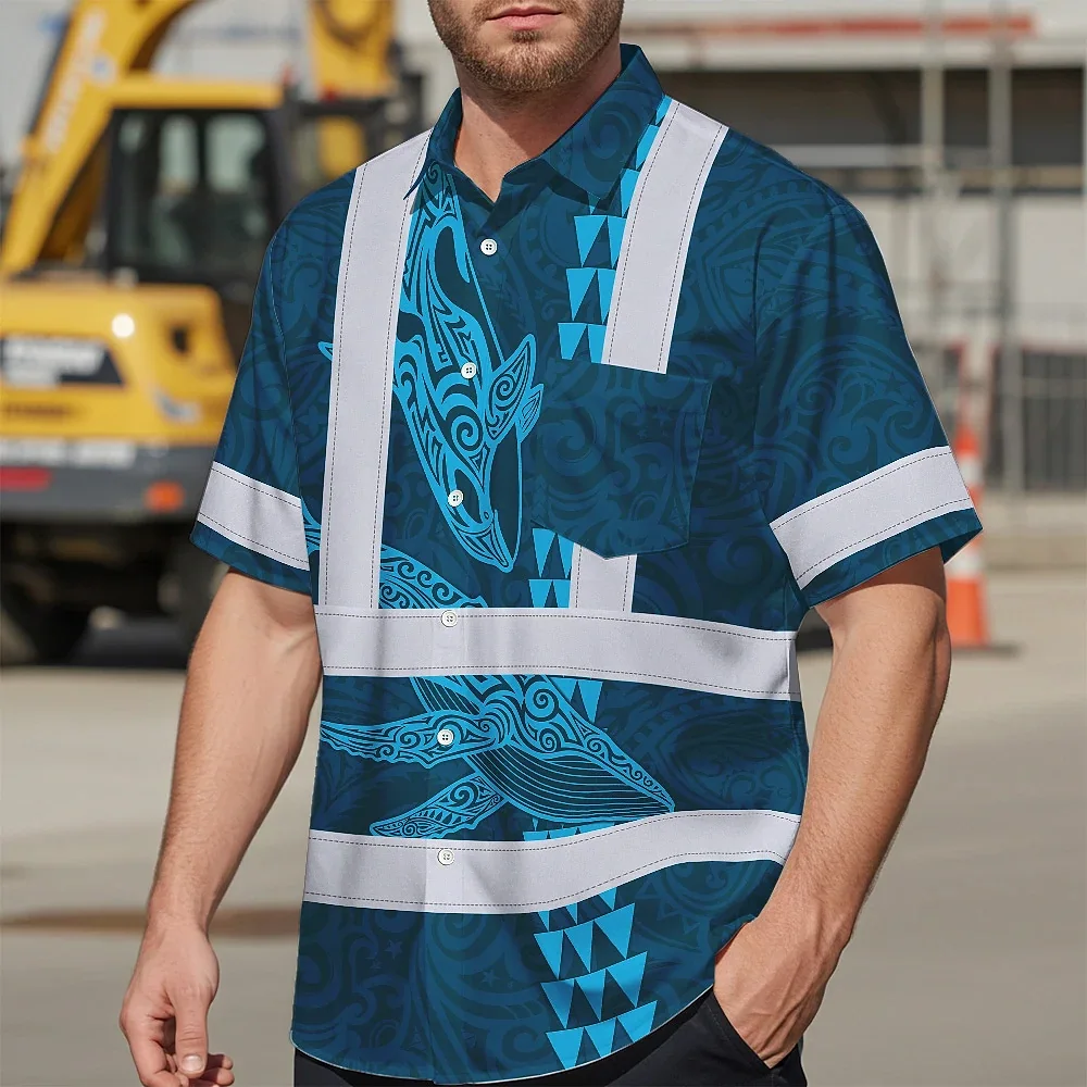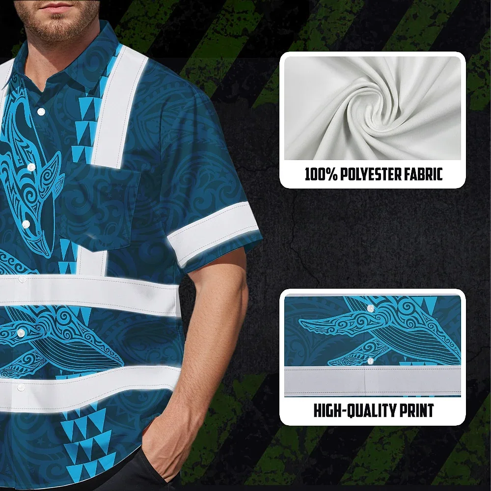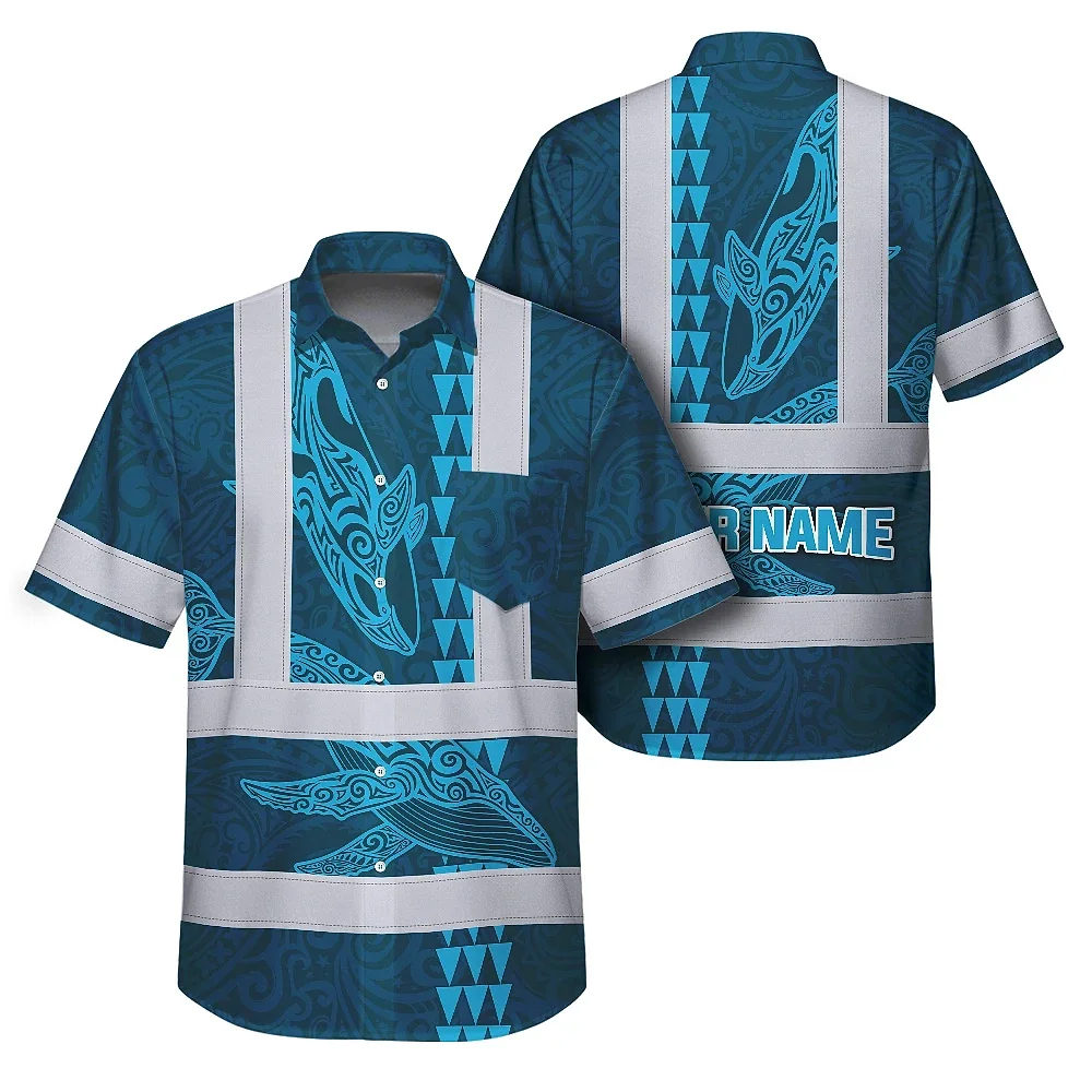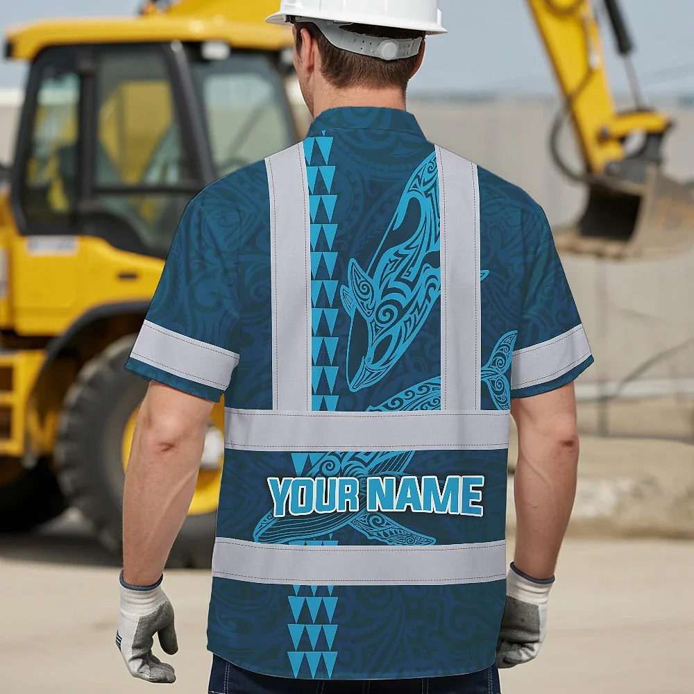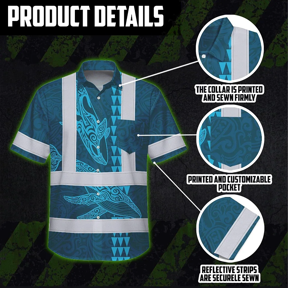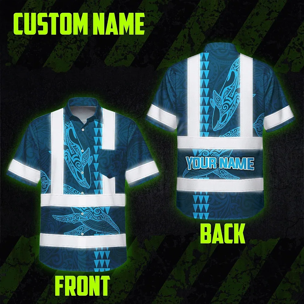 Hi Vis Hawaiian Shirt Reflective Tapes Blue Neon Flowers Whale Custom Name Safety Workwear For Workers, Truckers, Operators, Company