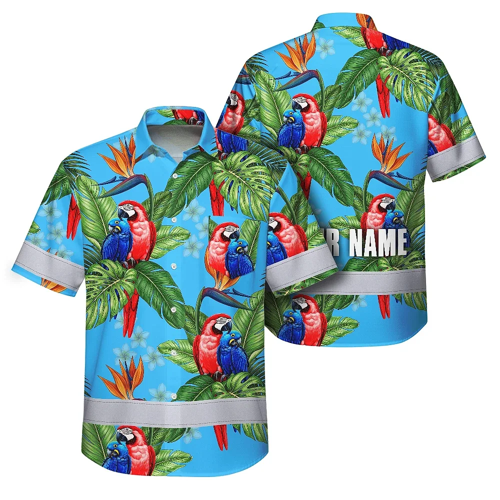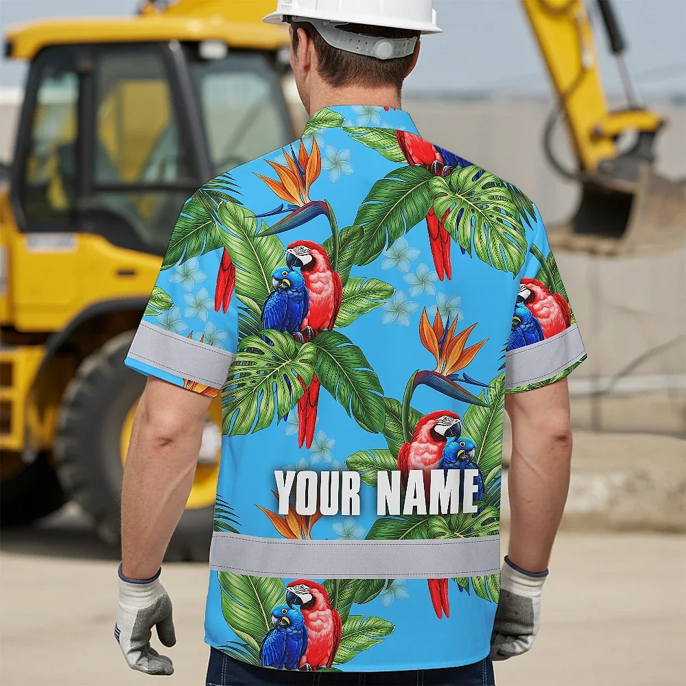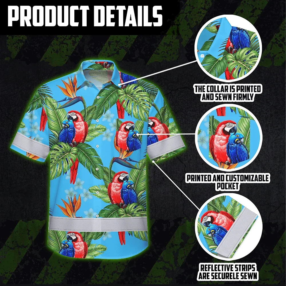 Hi Vis Hawaiian Shirt Reflective Tapes Blue Neon Parrot Hawaii Custom Name Safety Workwear For Workers, Truckers, Operators