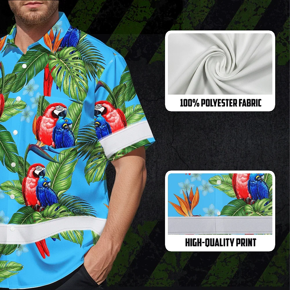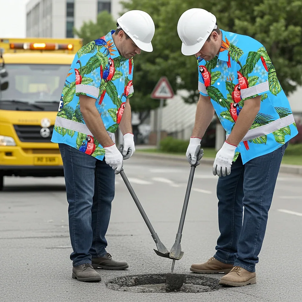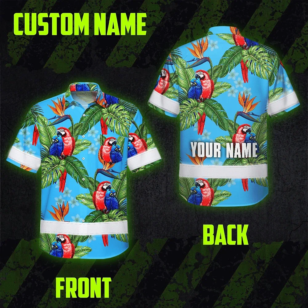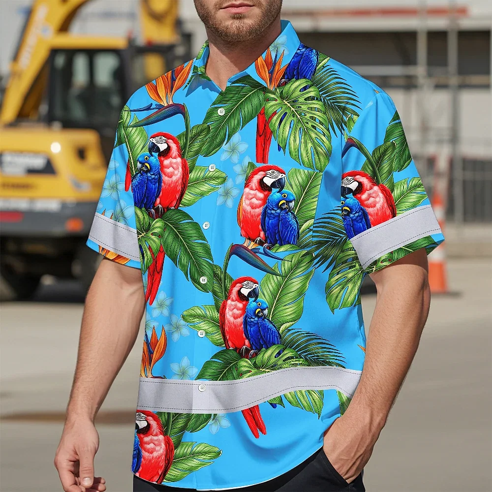 Hi Vis Hawaiian Shirt Reflective Tapes Blue Neon Parrot Hawaii Custom Name Safety Workwear For Workers, Truckers, Operators