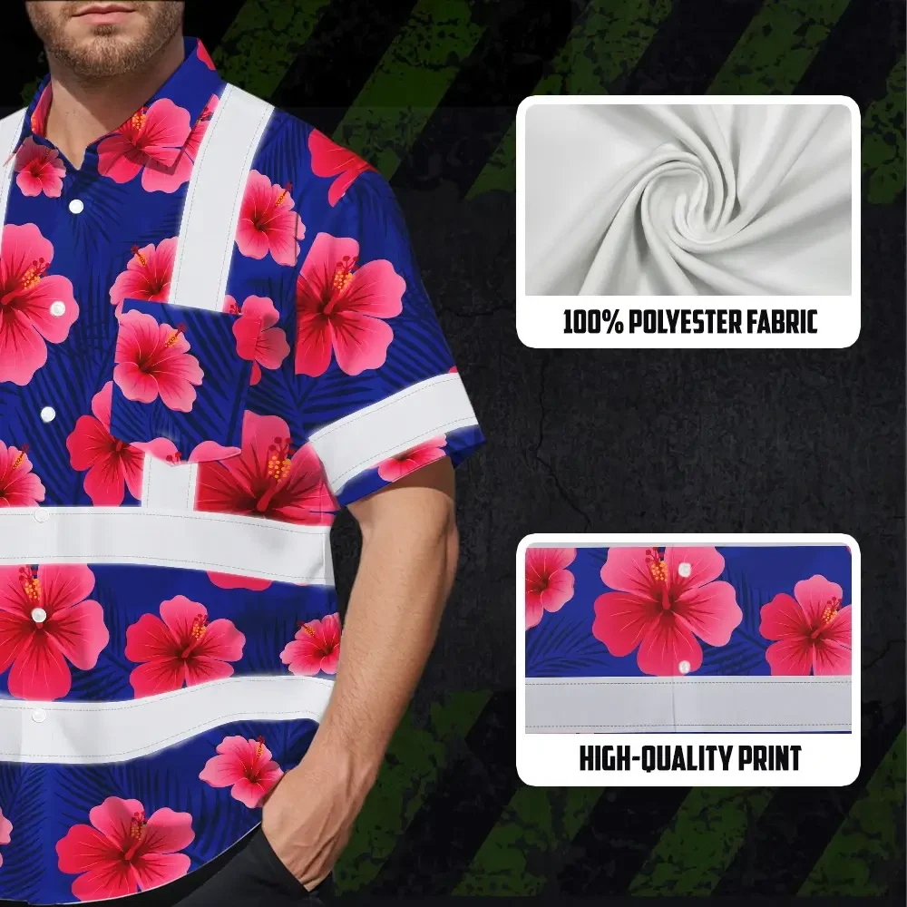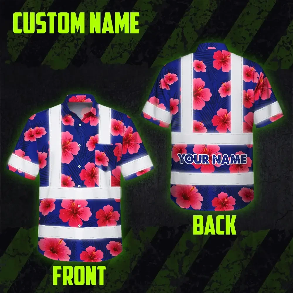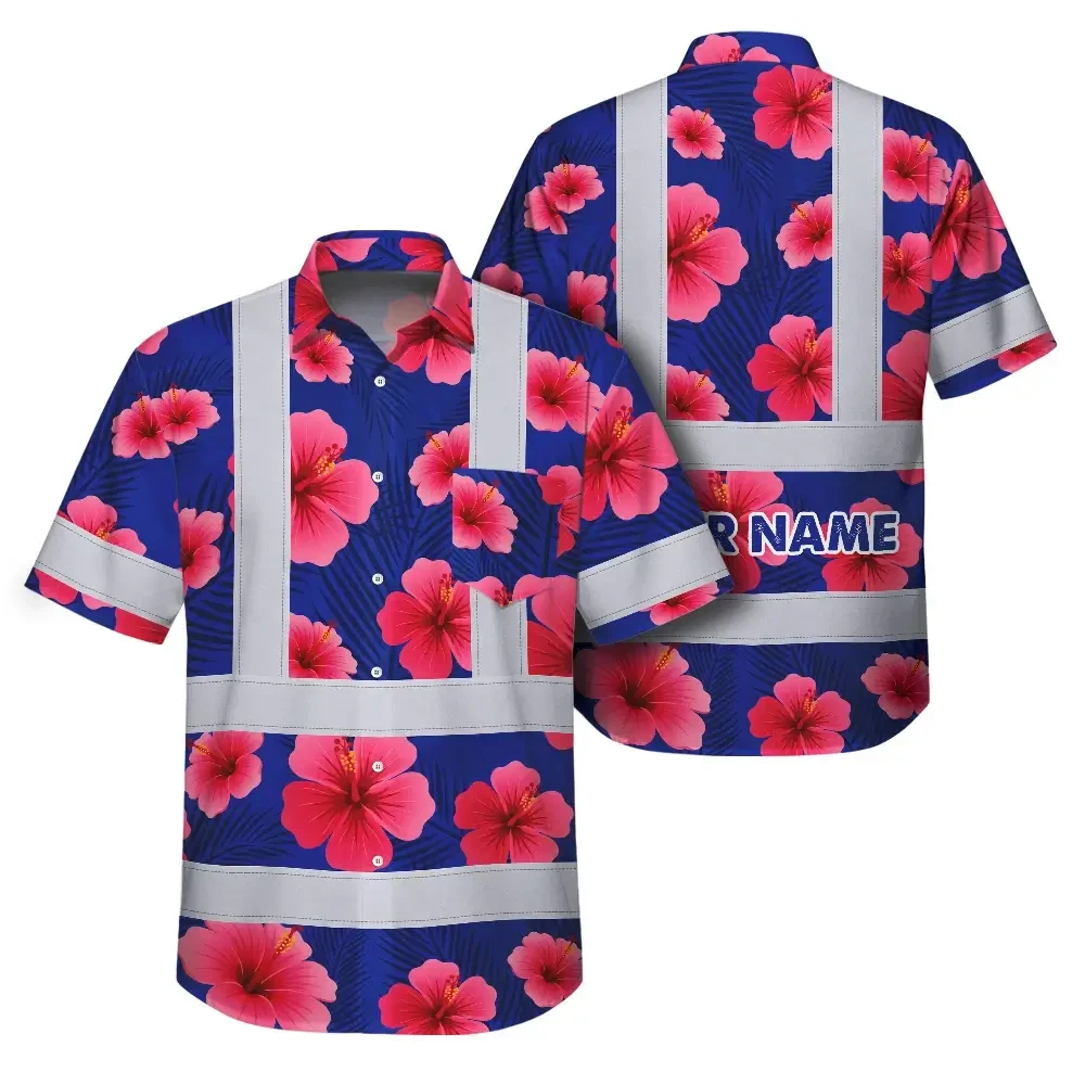 Hi Vis Hawaiian Shirt Reflective Tapes Blue Neon Pink Flowers Custom Name
