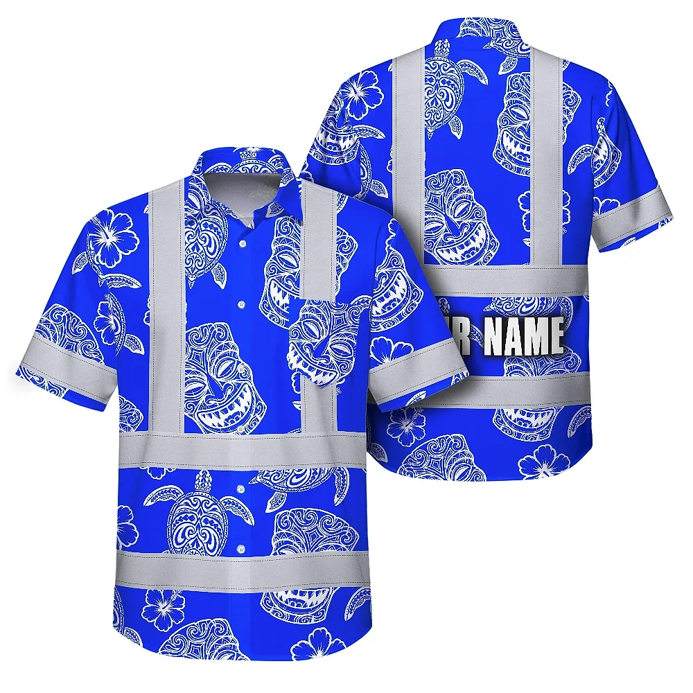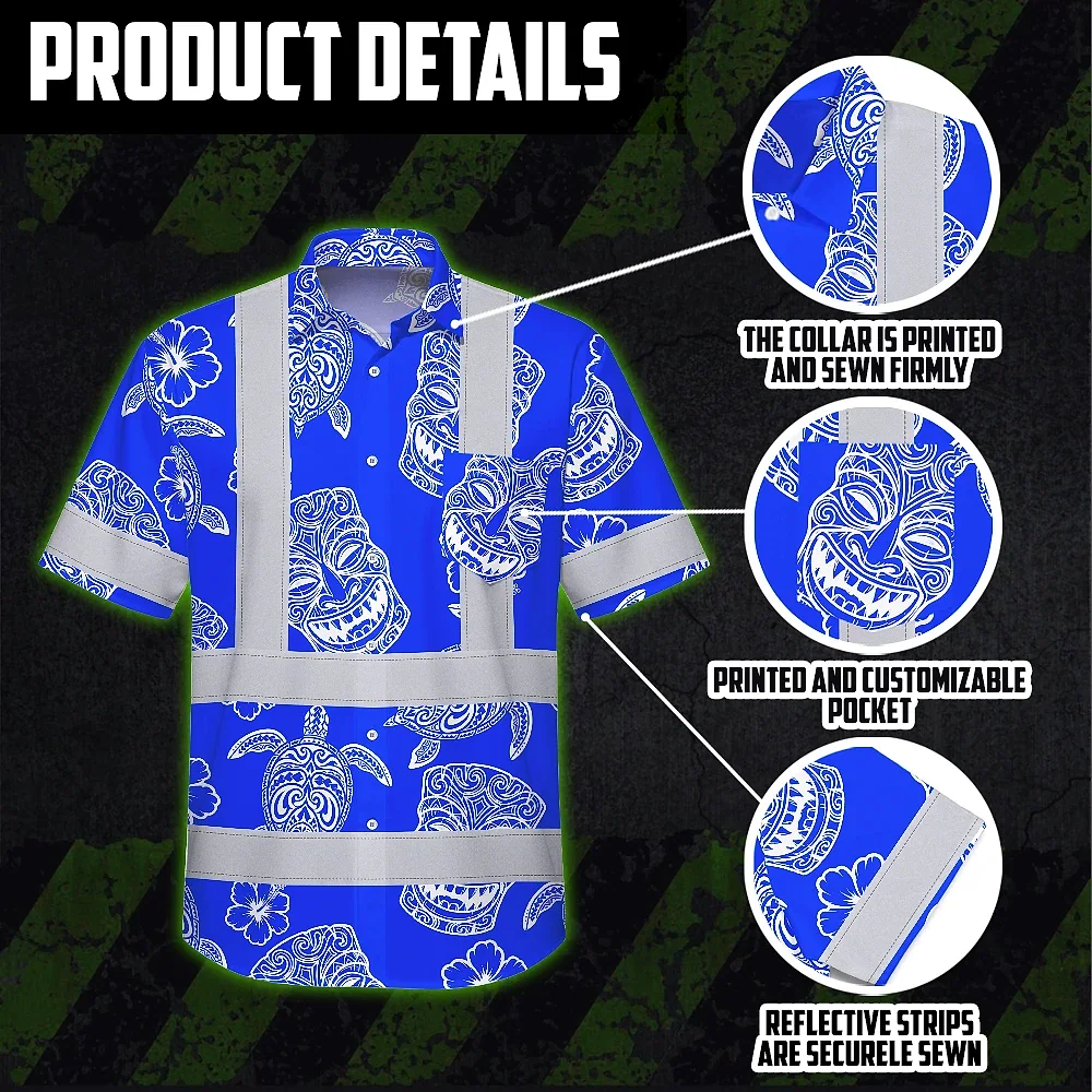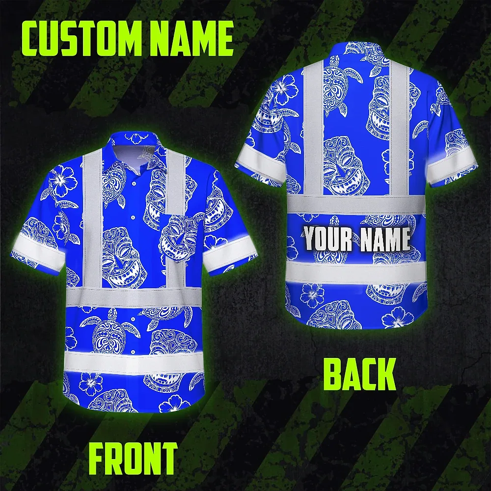 Hi Vis Hawaiian Shirt Reflective Tapes Blue Tiki Custom Name Safety Workwear For Workers, Truckers, Operators
