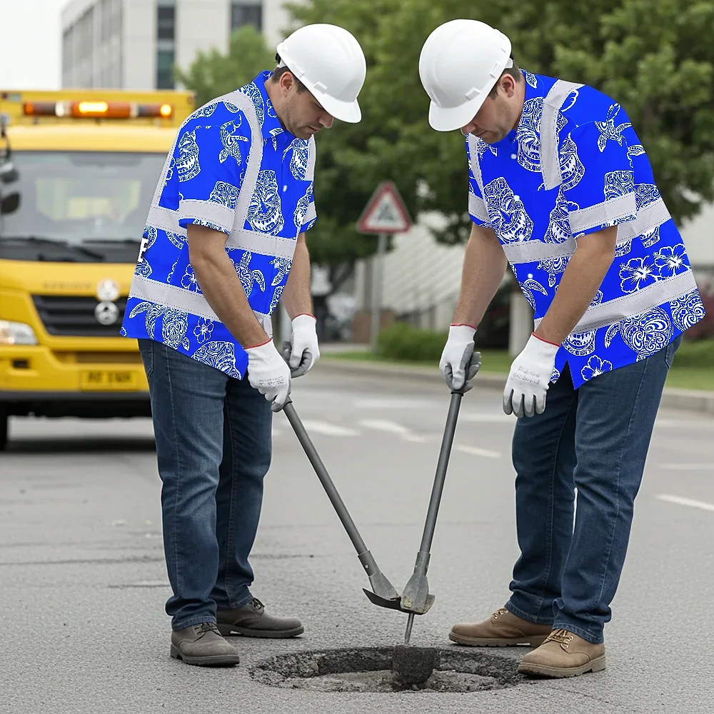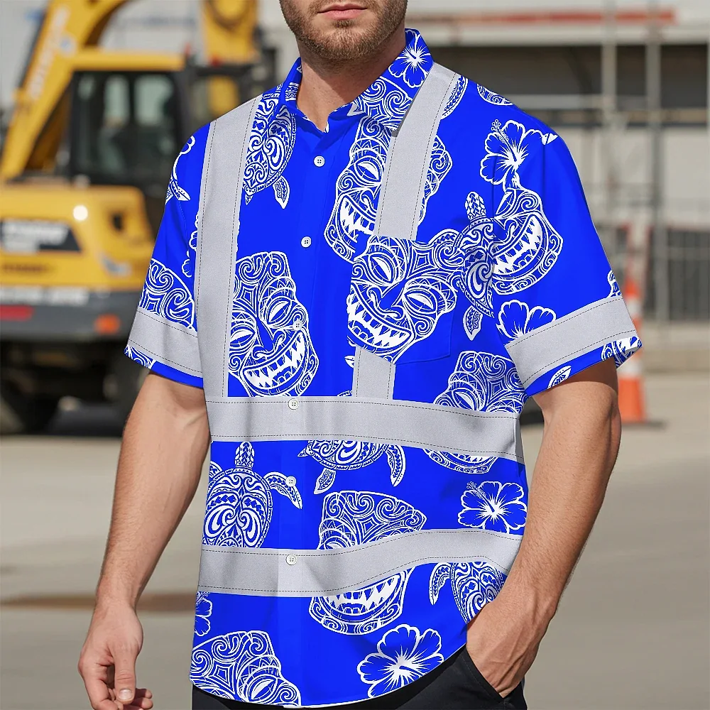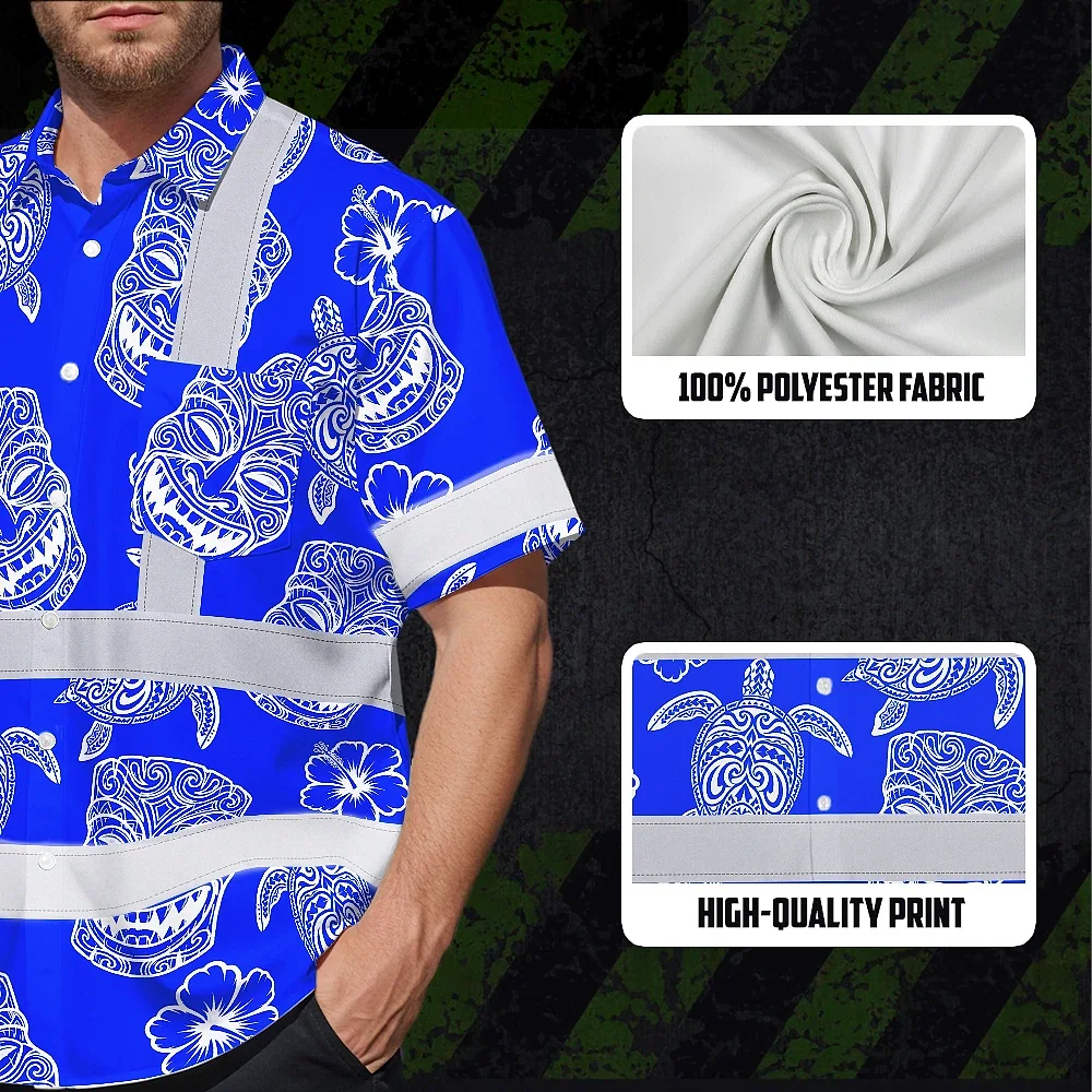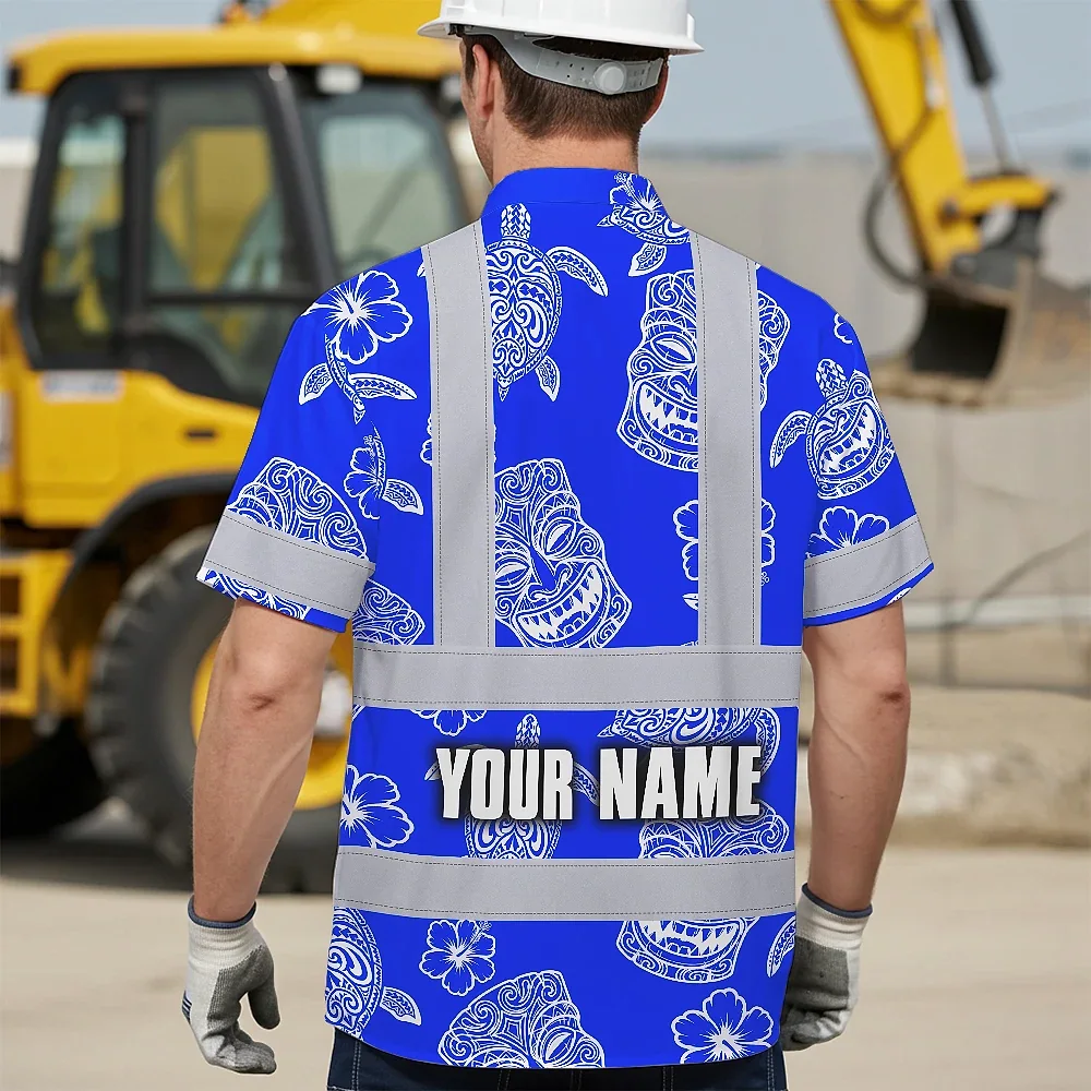 Hi Vis Hawaiian Shirt Reflective Tapes Blue Tiki Custom Name Safety Workwear For Workers, Truckers, Operators