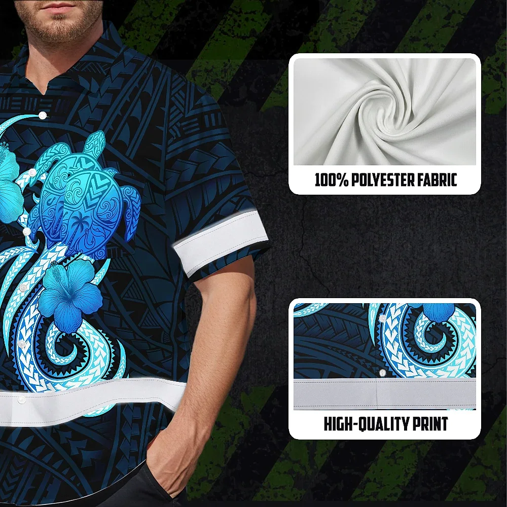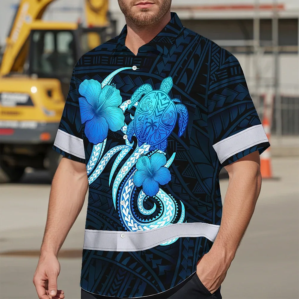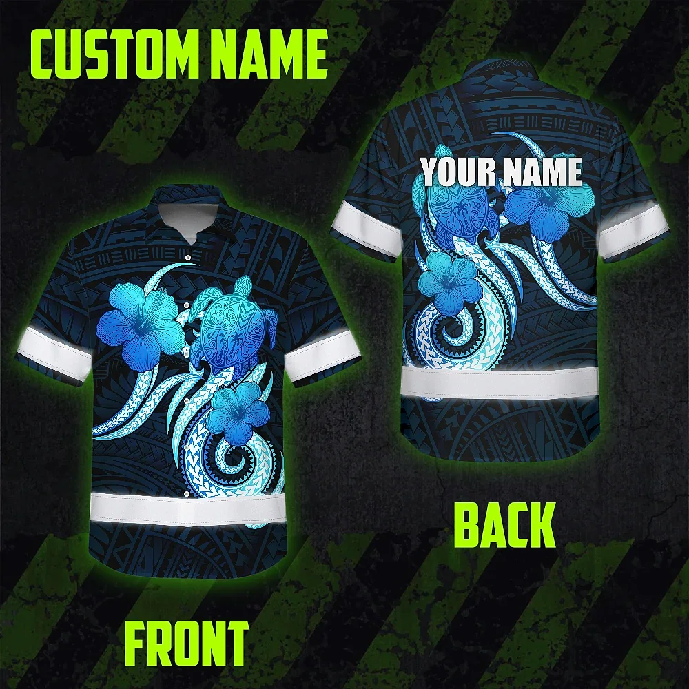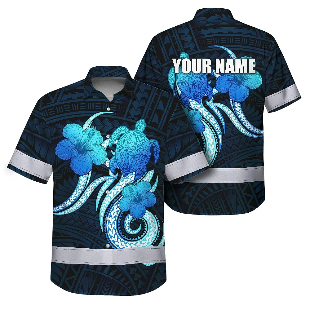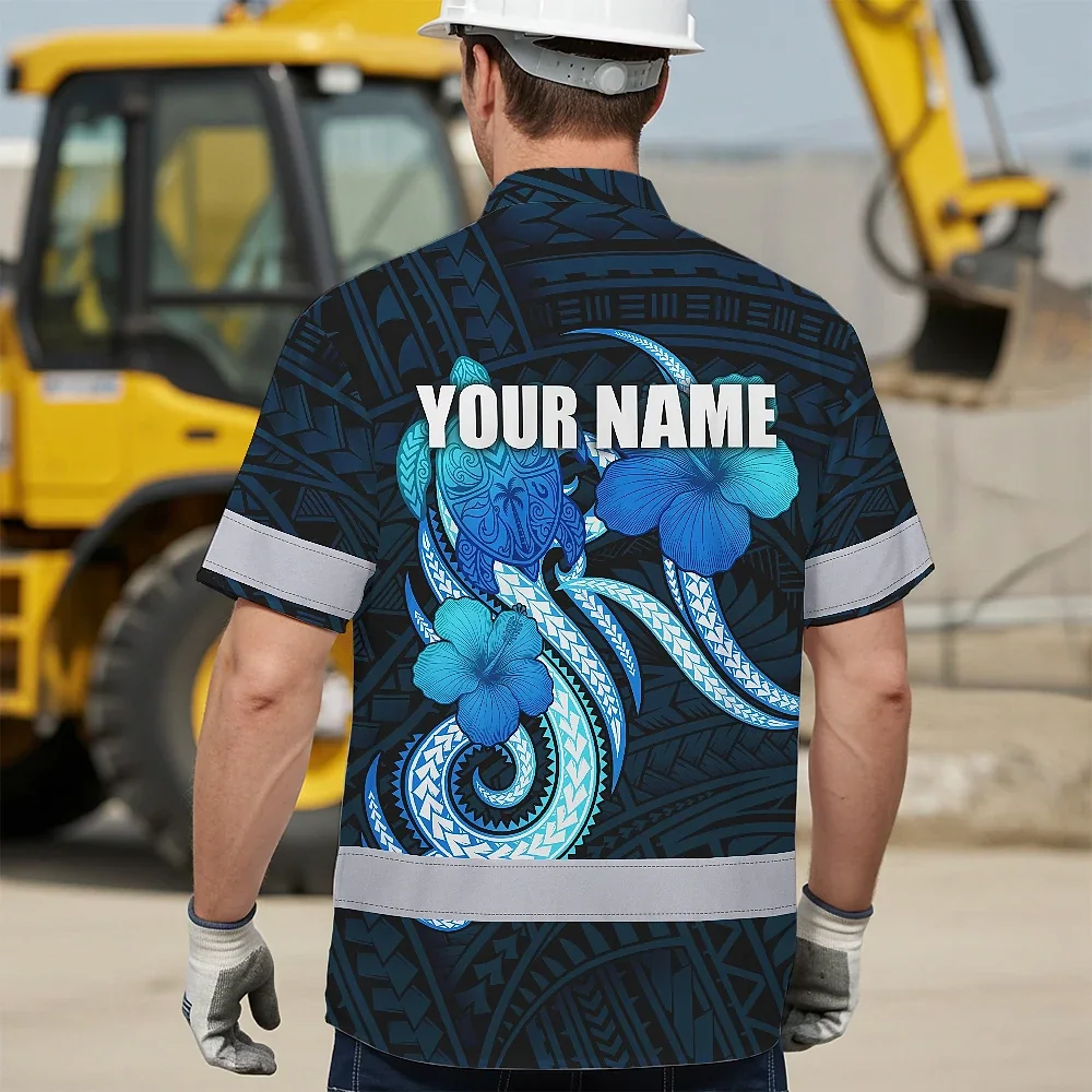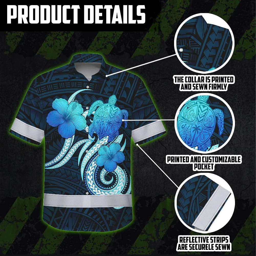Hi Vis Hawaiian Shirt Reflective Tapes Blue Turtle Polynesian Custom Name Safety Workwear For Workers, Truckers, Operators