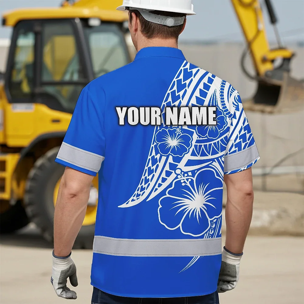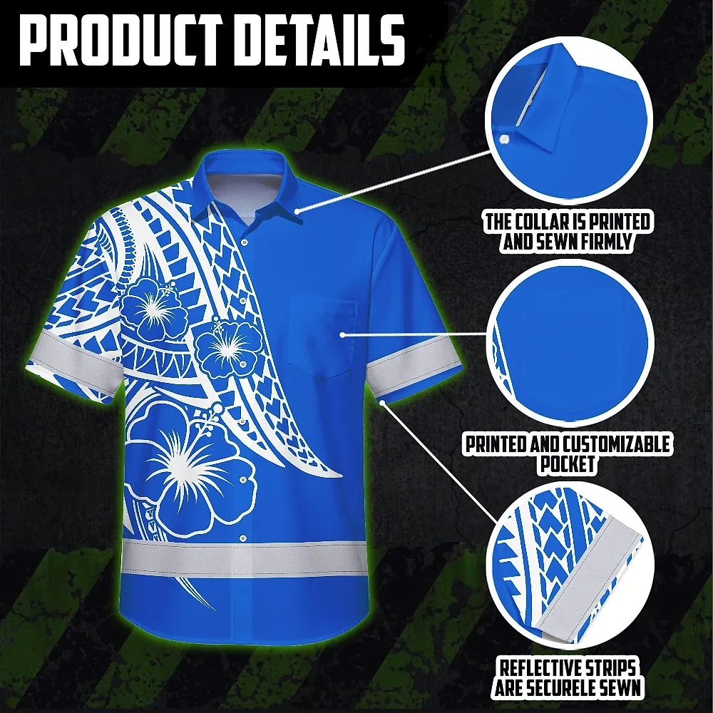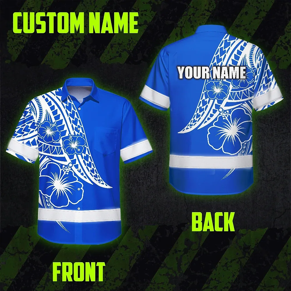 Hi Vis Hawaiian Shirt Reflective Tapes Blue White Polynesian Custom Name Safety Workwear For Workers, Truckers, Operators