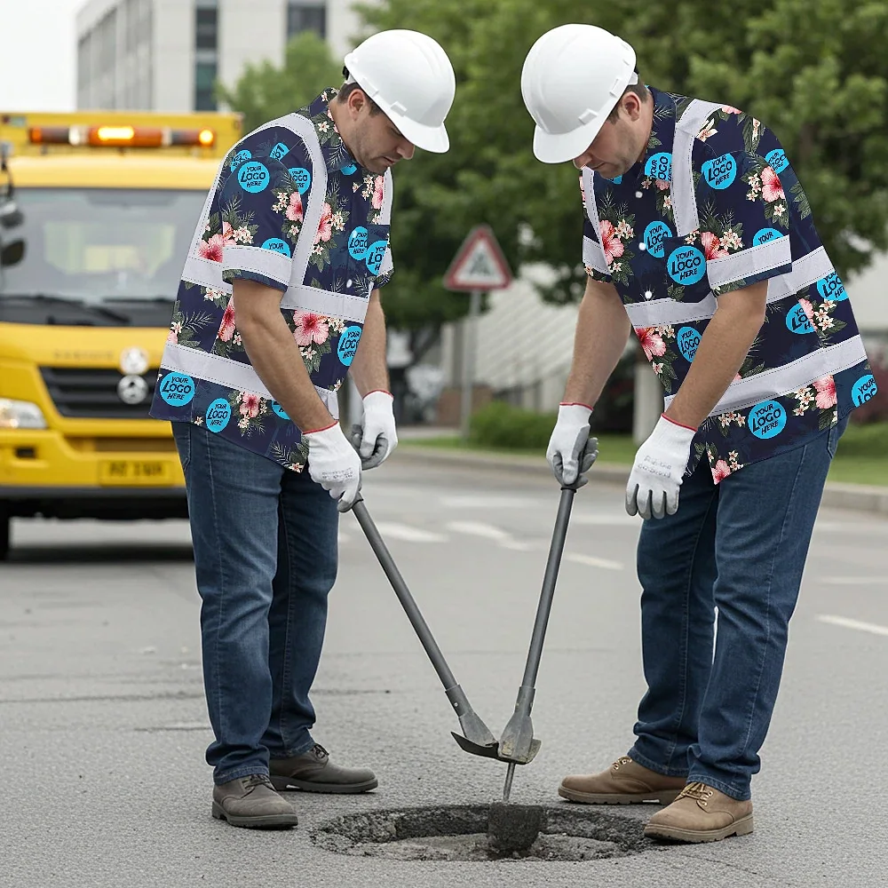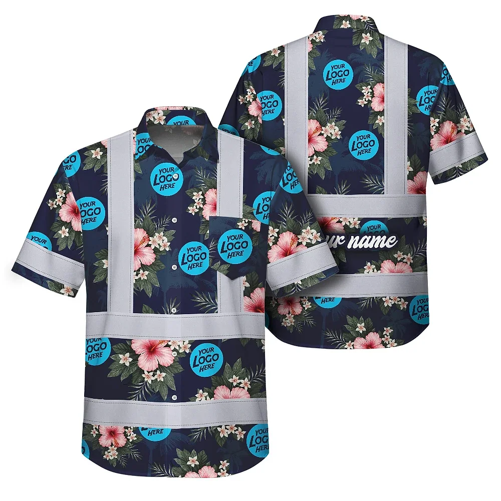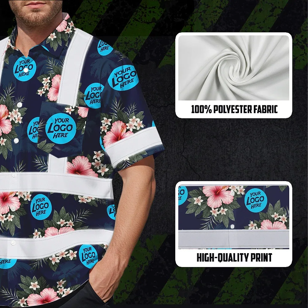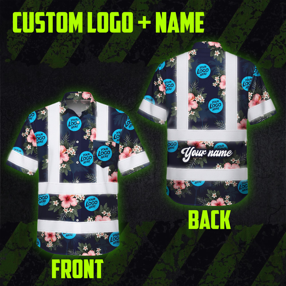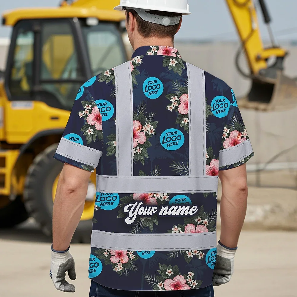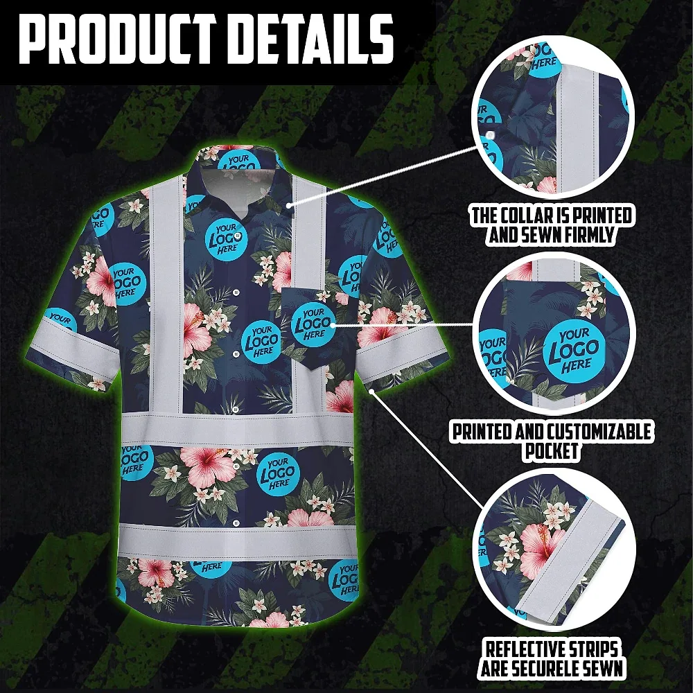 Hi Vis Hawaiian Shirt Reflective Tapes Dark Blue And Flowers Custom Name And Logo Safety Workwear For Workers, Truckers, Operators, Company