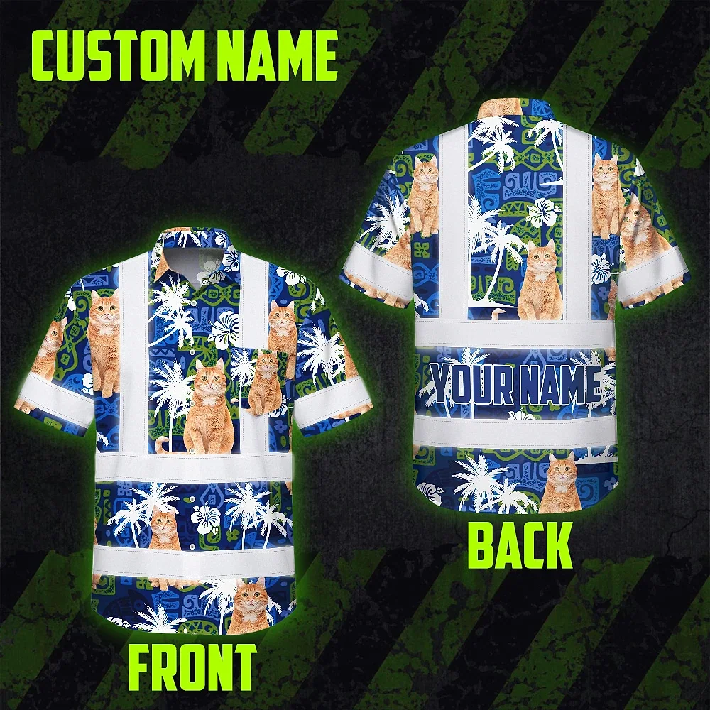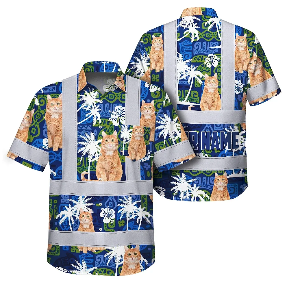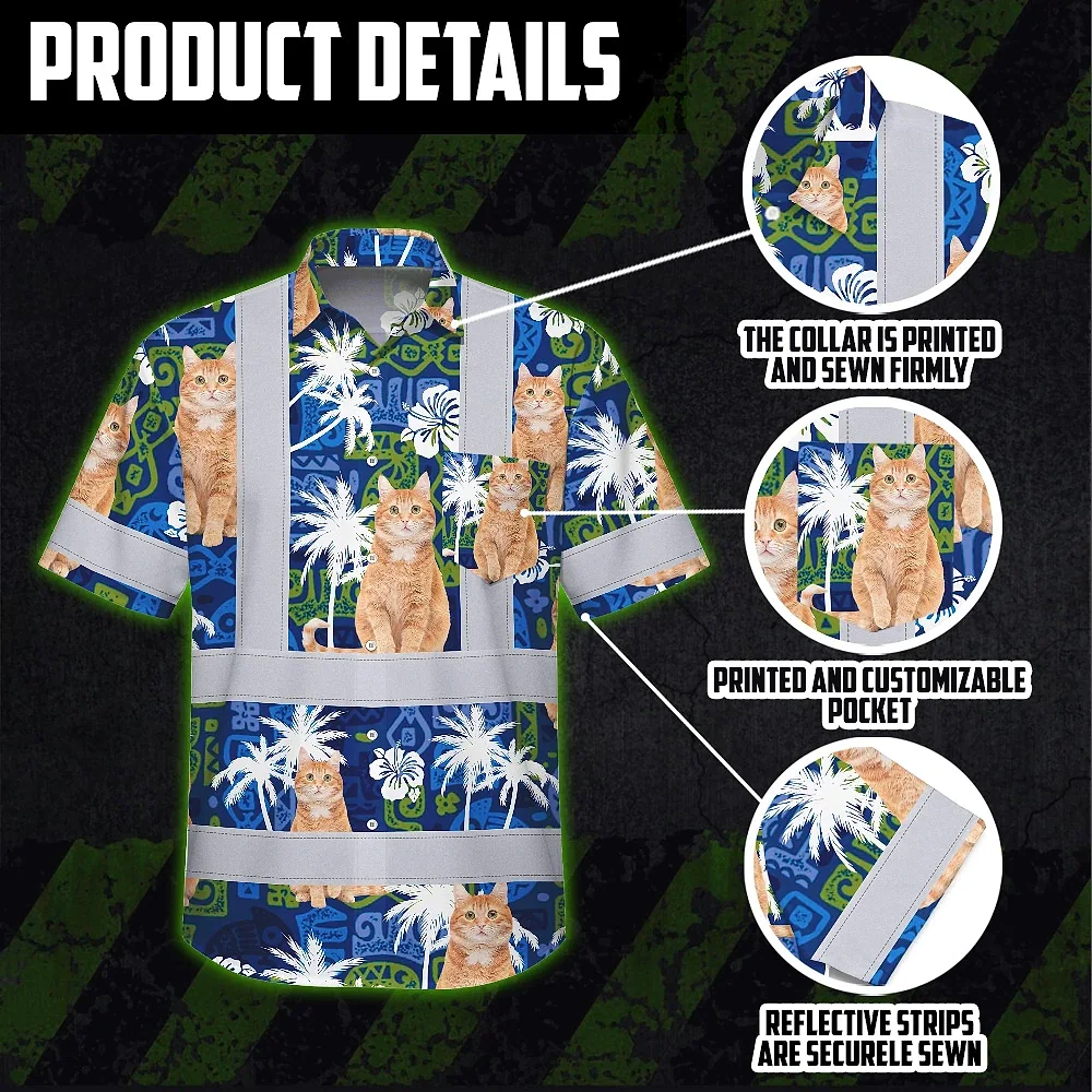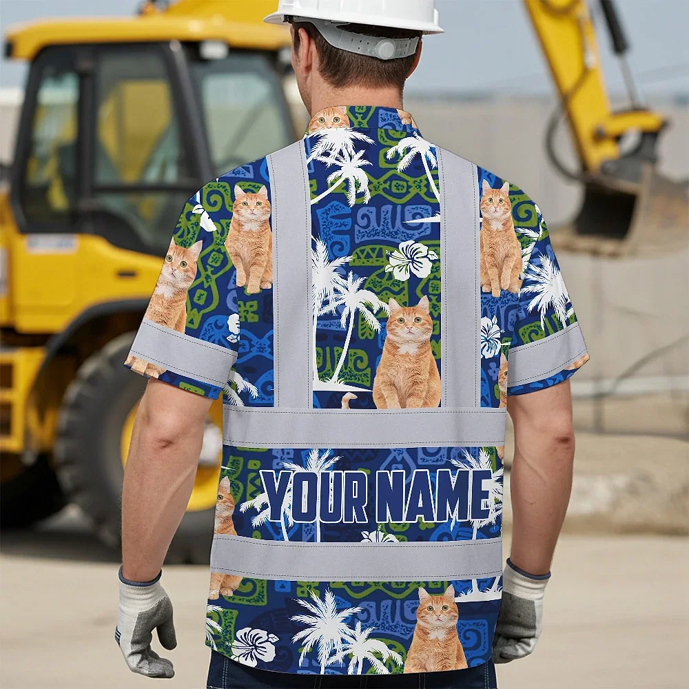 Hi Vis Hawaiian Shirt Reflective Tapes Dark Blue Custom Name And Image Safety Workwear For Workers, Truckers, Operators, Company, Pet Lovers