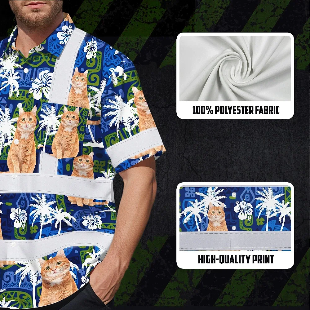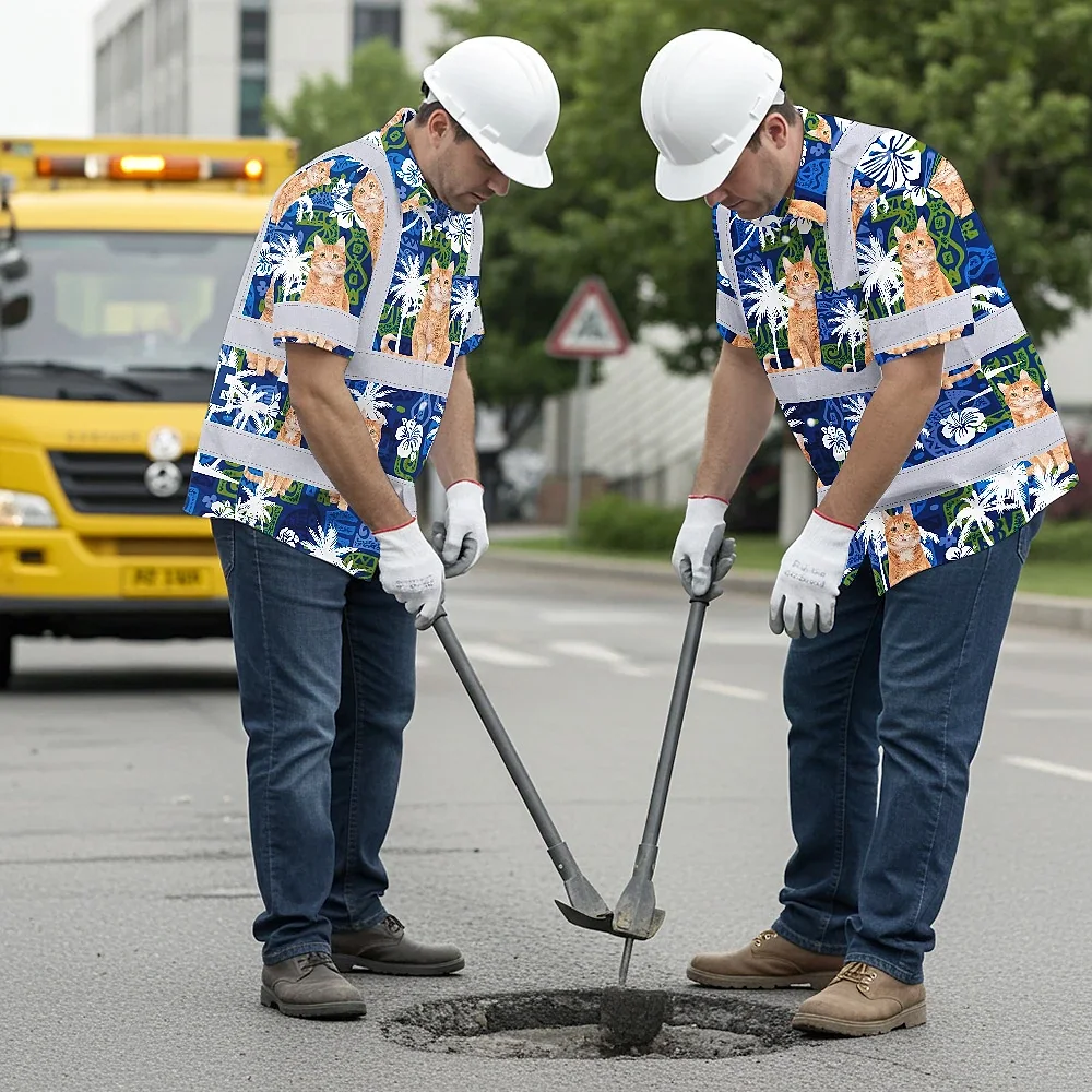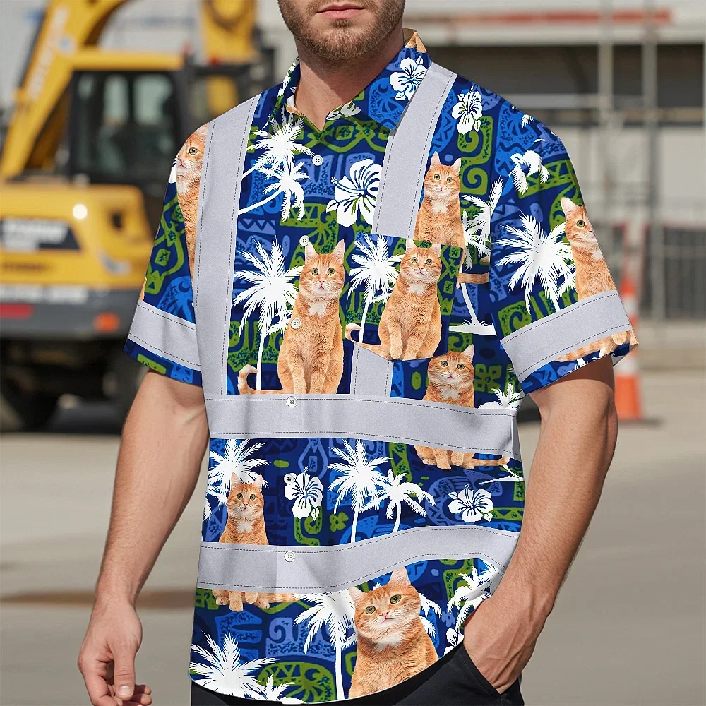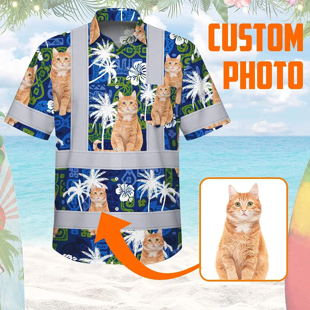 Hi Vis Hawaiian Shirt Reflective Tapes Dark Blue Custom Name And Image Safety Workwear For Workers, Truckers, Operators, Company, Pet Lovers