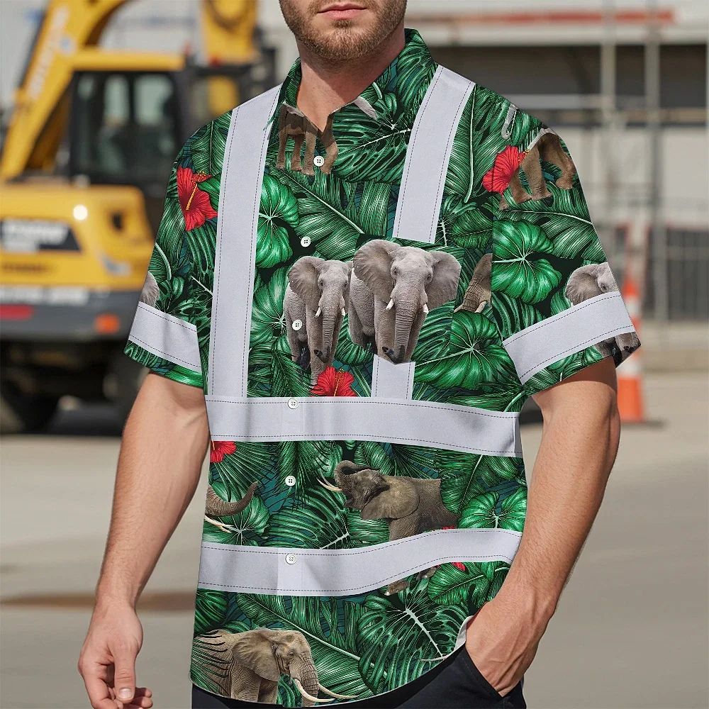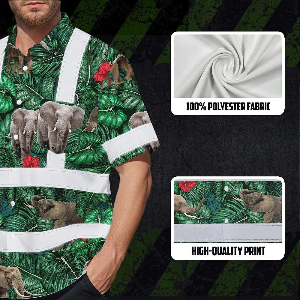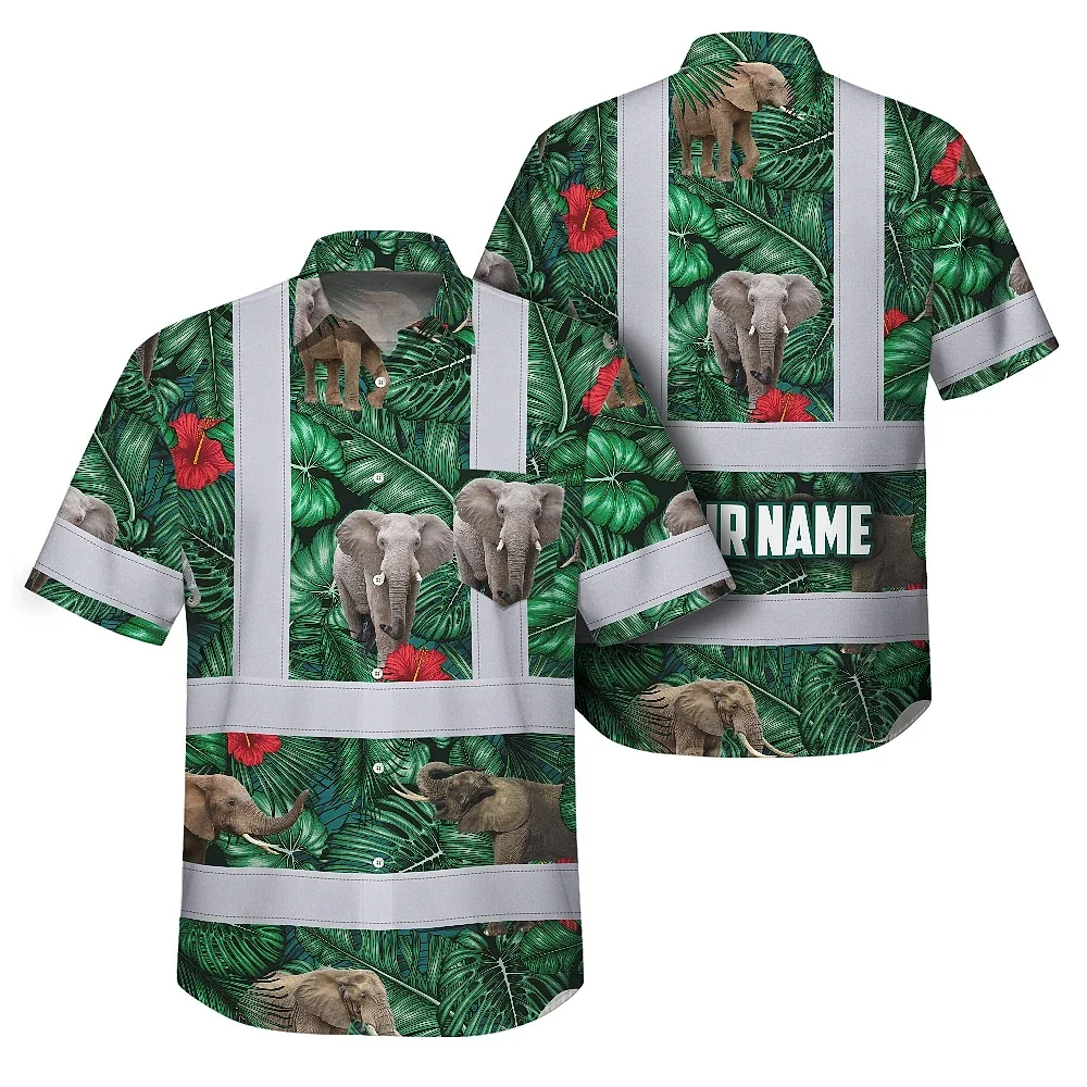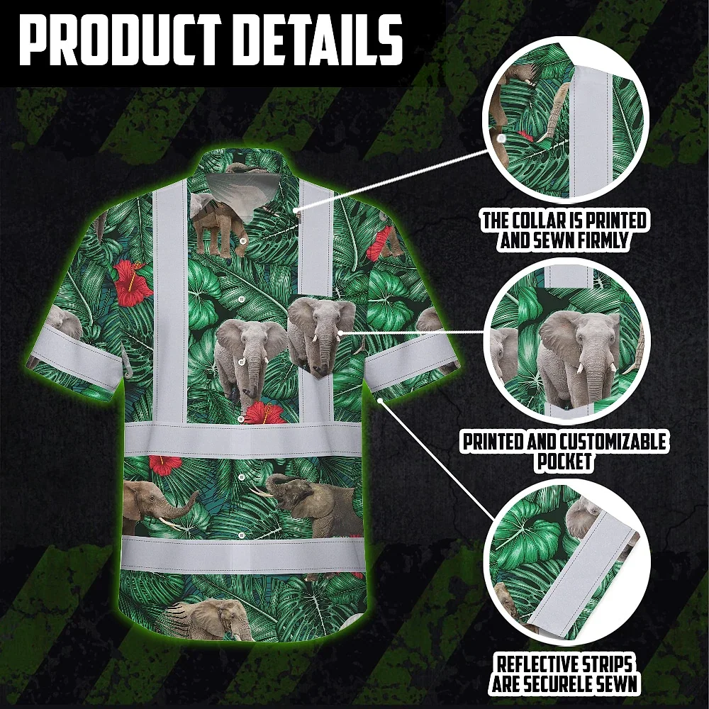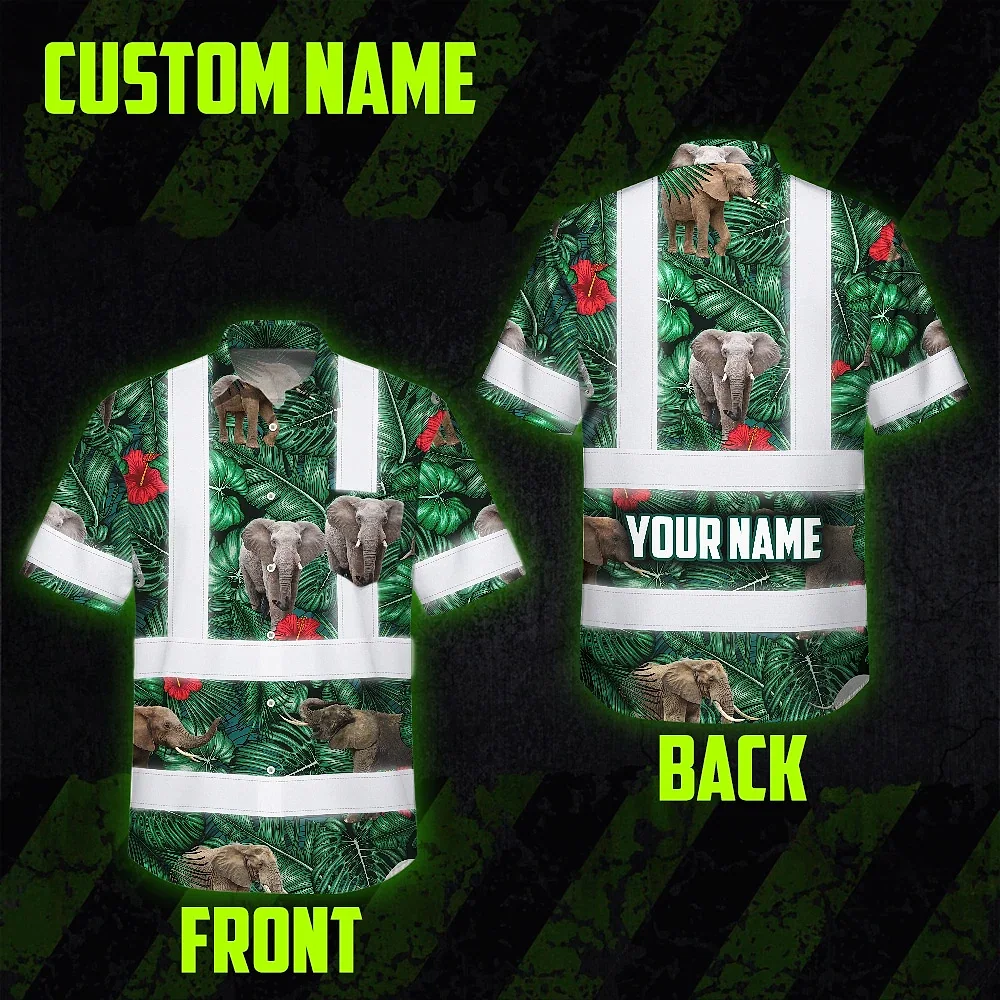 Hi Vis Hawaiian Shirt Reflective Tapes Elephant Flowers Custom Name Safety Workwear For Workers, Truckers, Operators