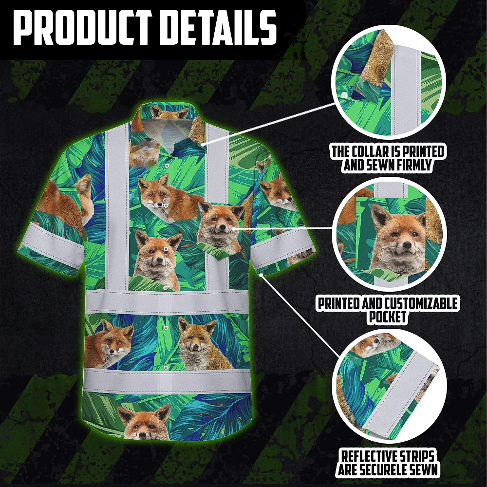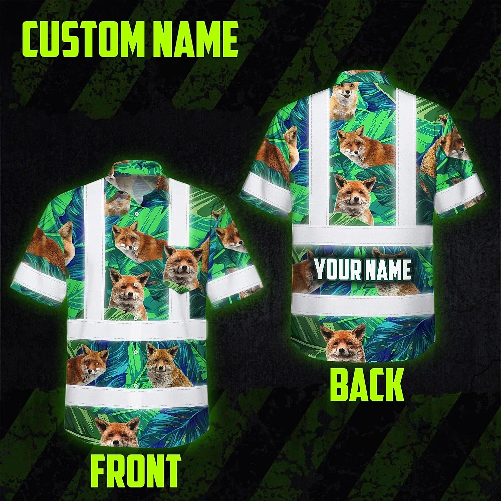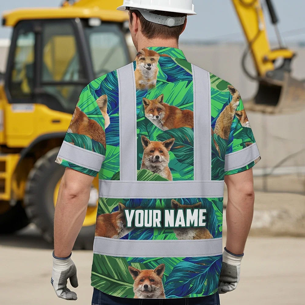 Hi Vis Hawaiian Shirt Reflective Tapes Fox Flowers Custom Name Safety Workwear For Workers, Truckers, Operators