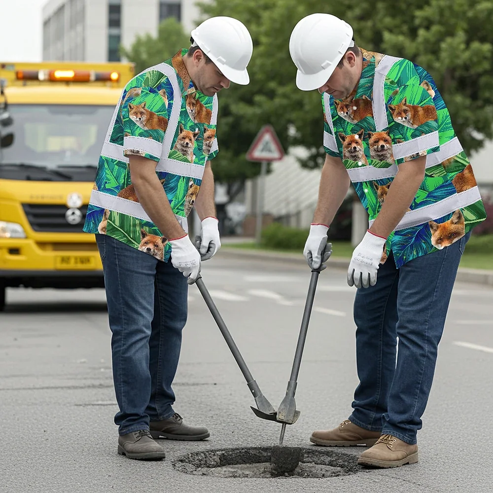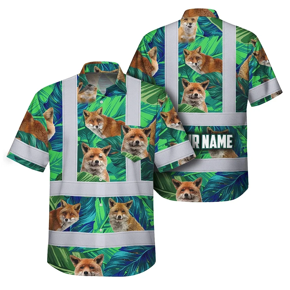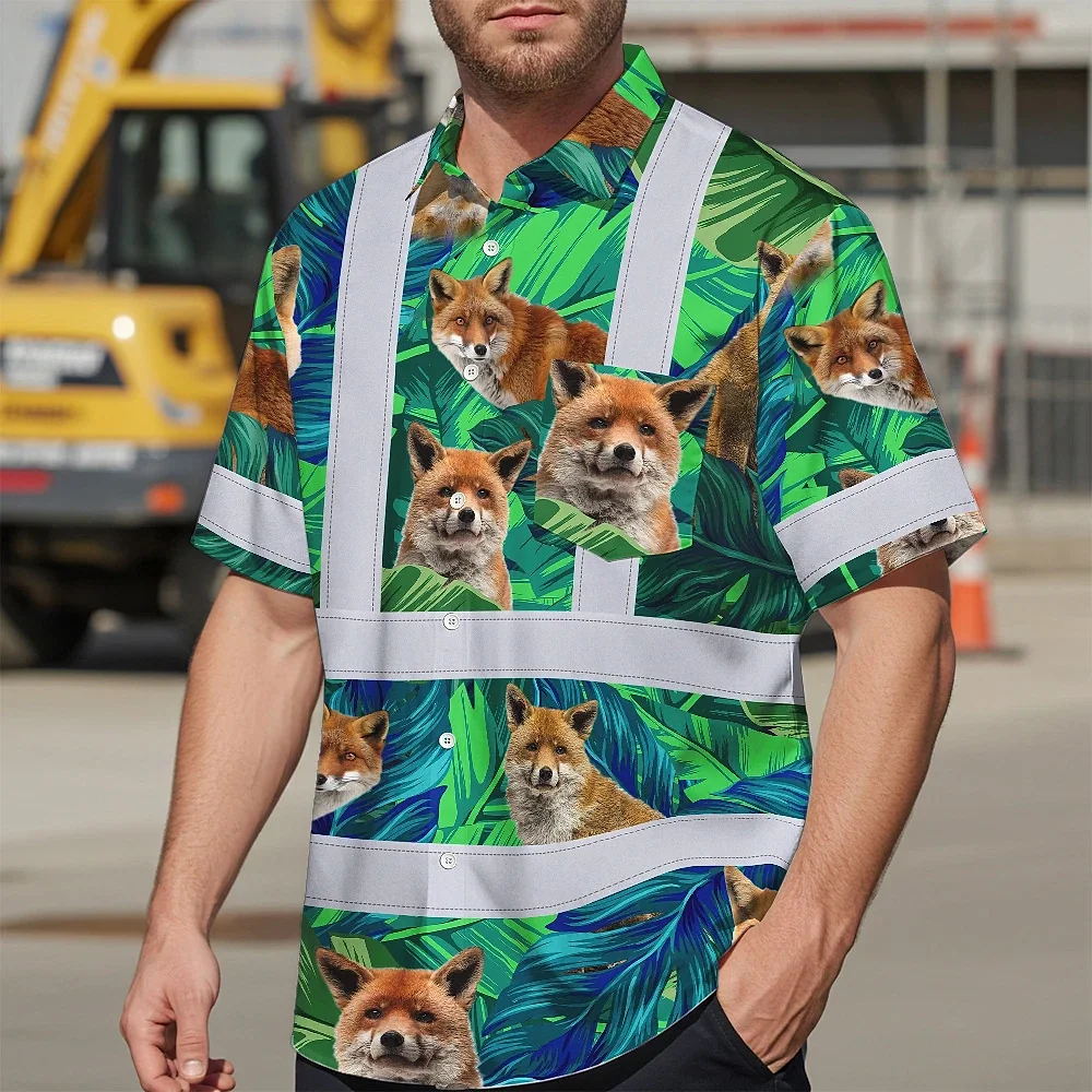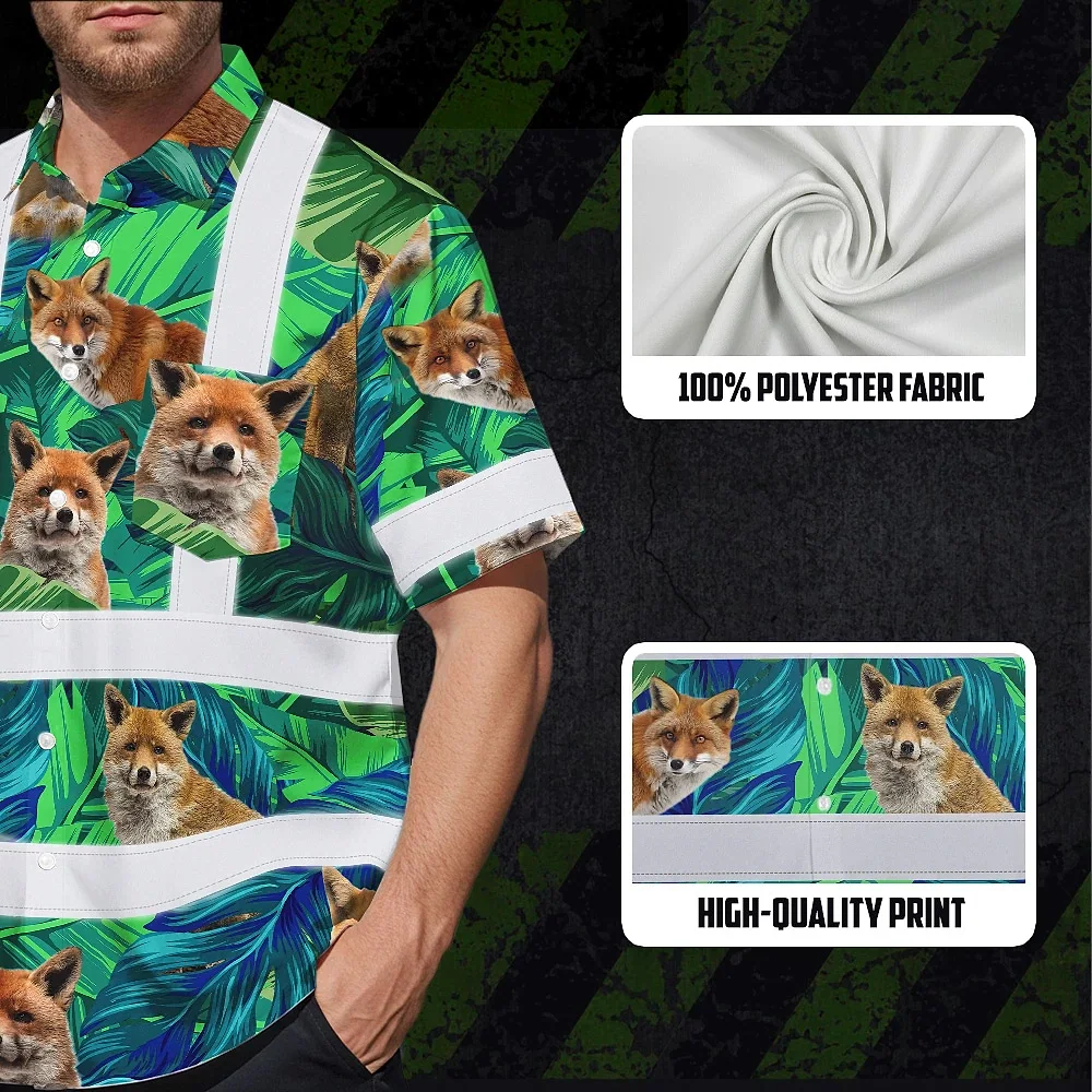 Hi Vis Hawaiian Shirt Reflective Tapes Fox Flowers Custom Name Safety Workwear For Workers, Truckers, Operators