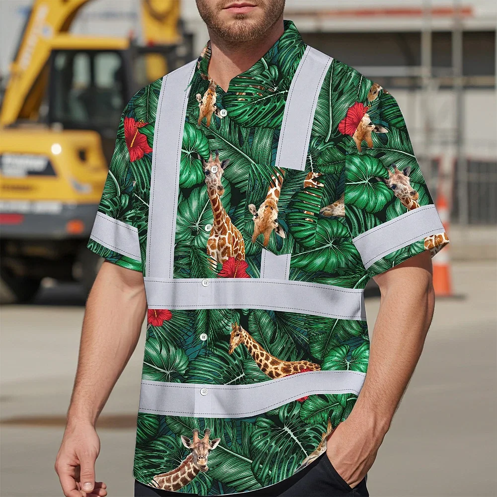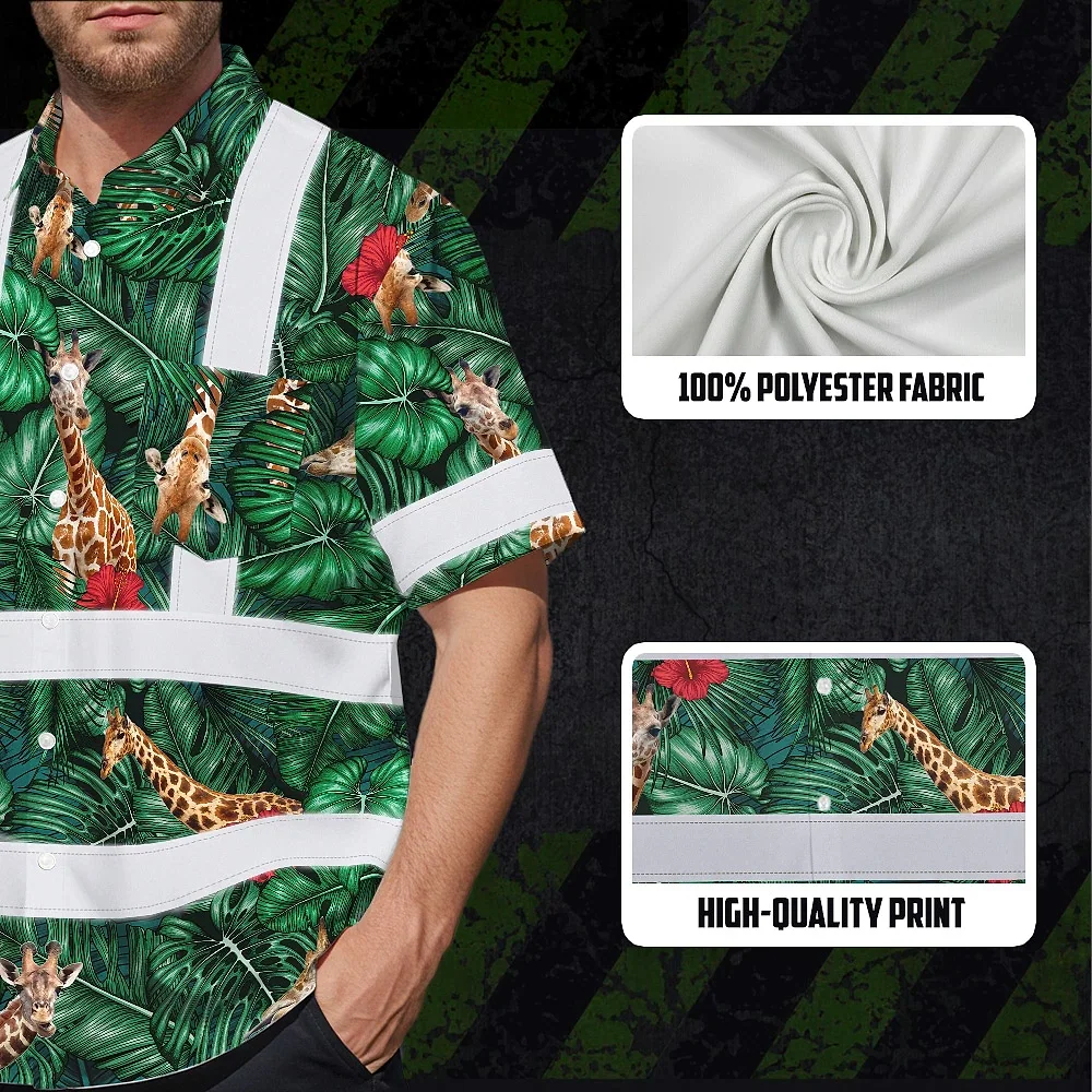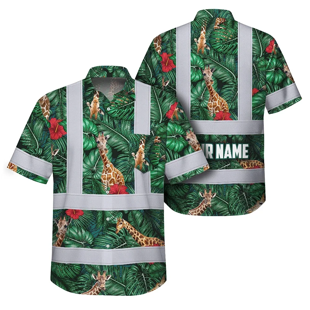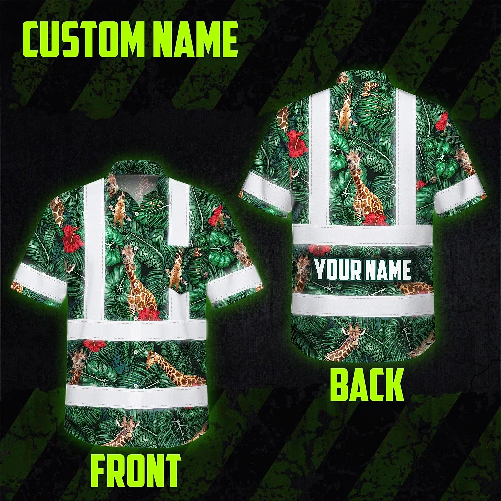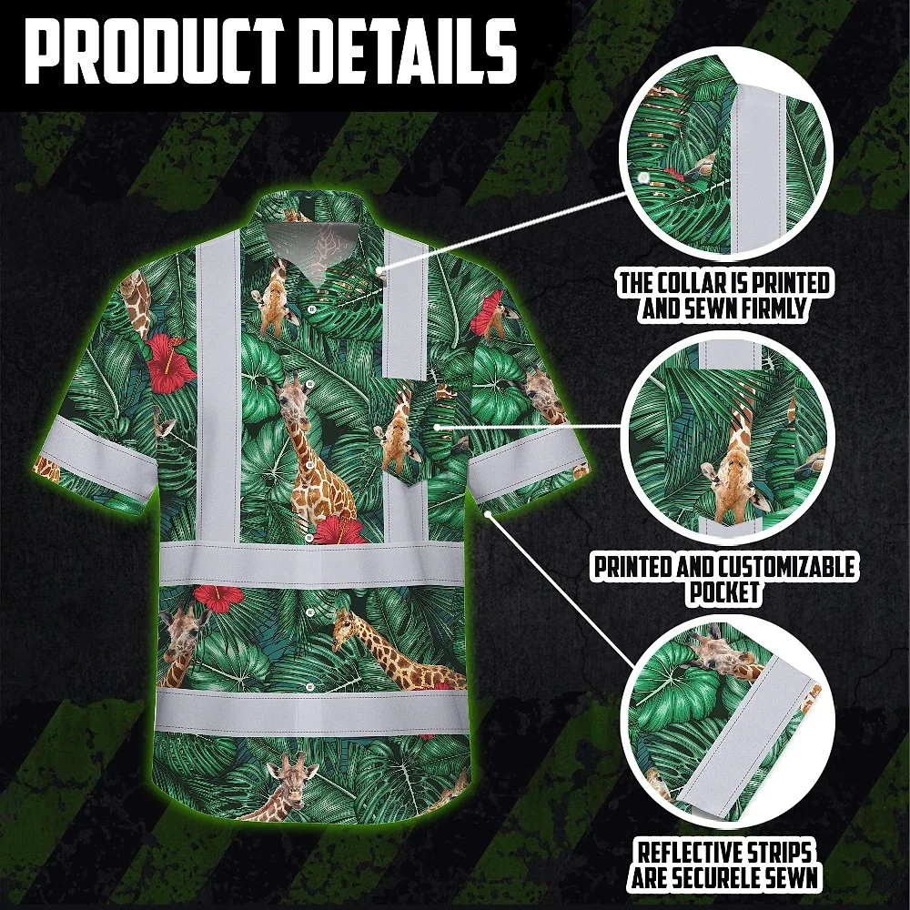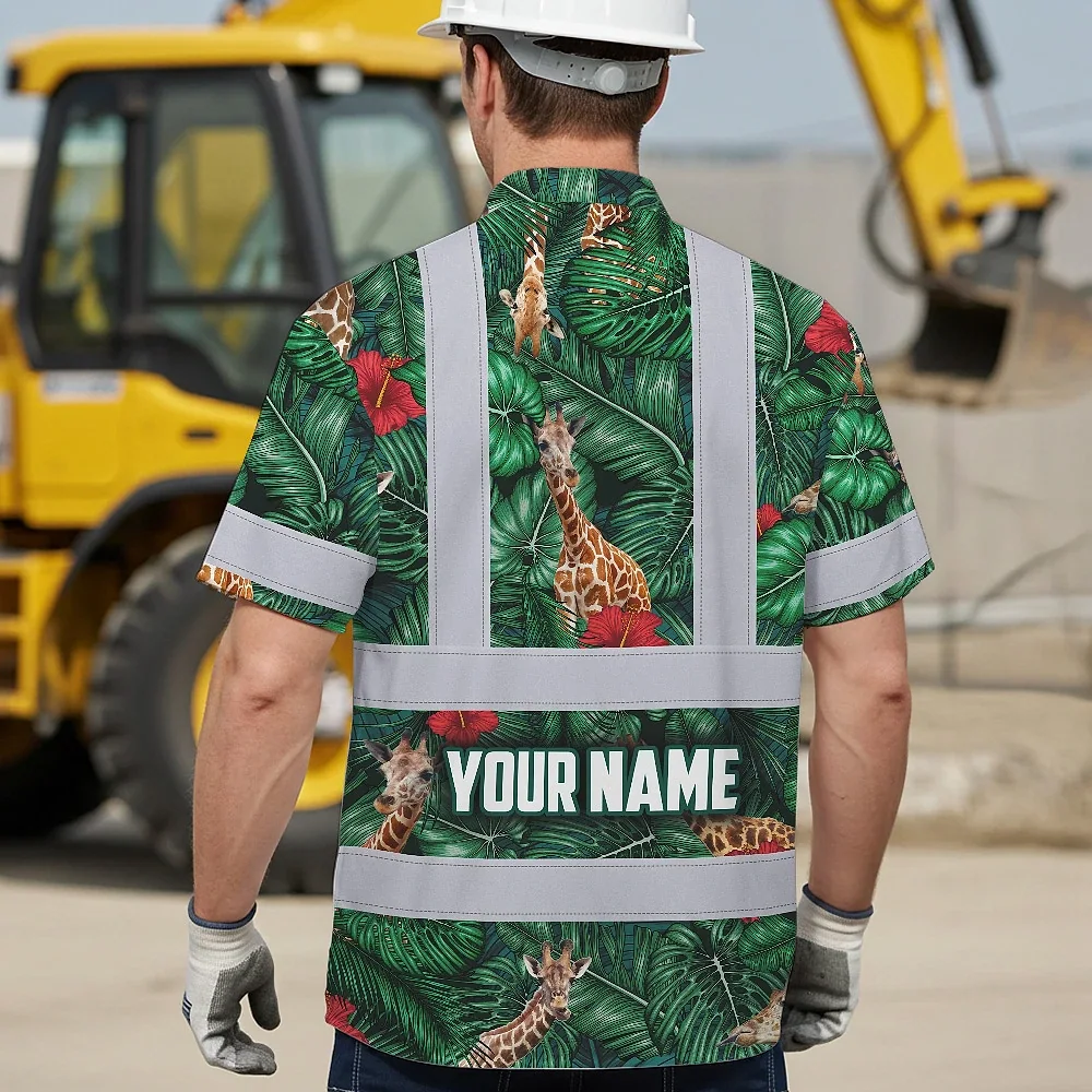 Hi Vis Hawaiian Shirt Reflective Tapes Giraffe Flowers Custom Name Safety Workwear For Workers, Truckers, Operators