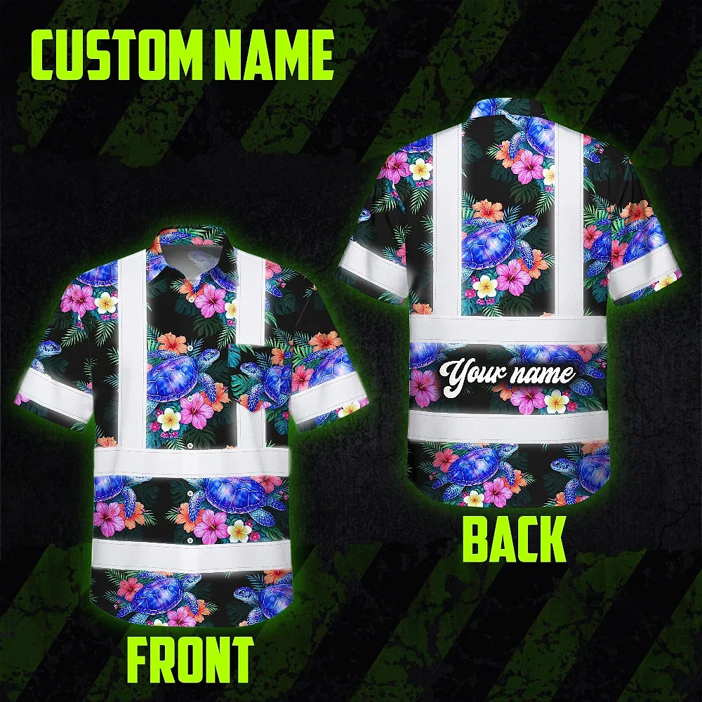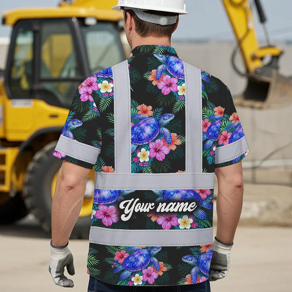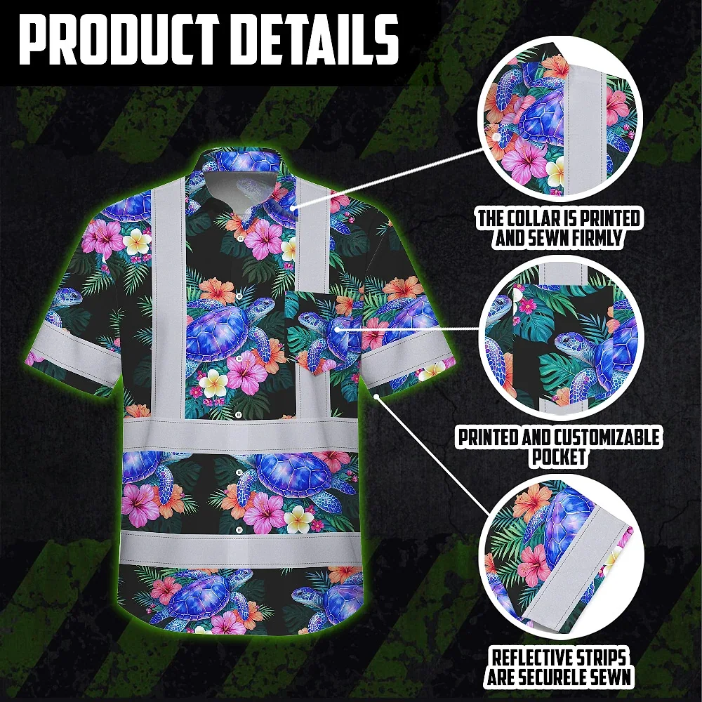 Hi Vis Hawaiian Shirt Reflective Tapes Green Black Flowers Turtle Custom Name Safety Workwear For Workers, Truckers, Operators, Company