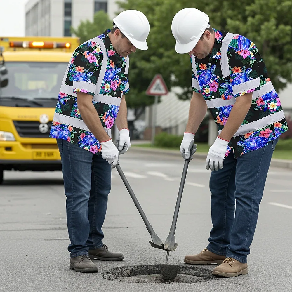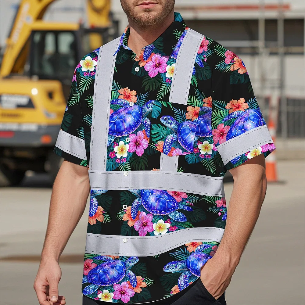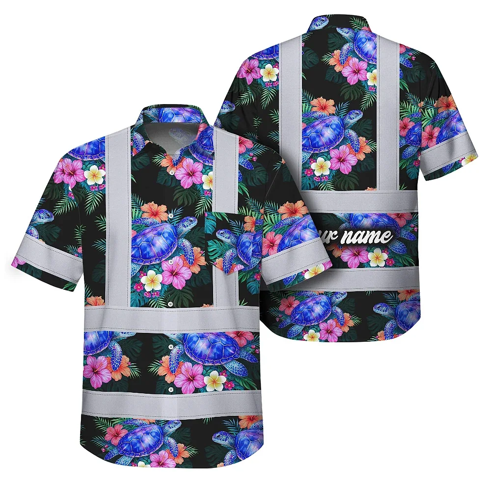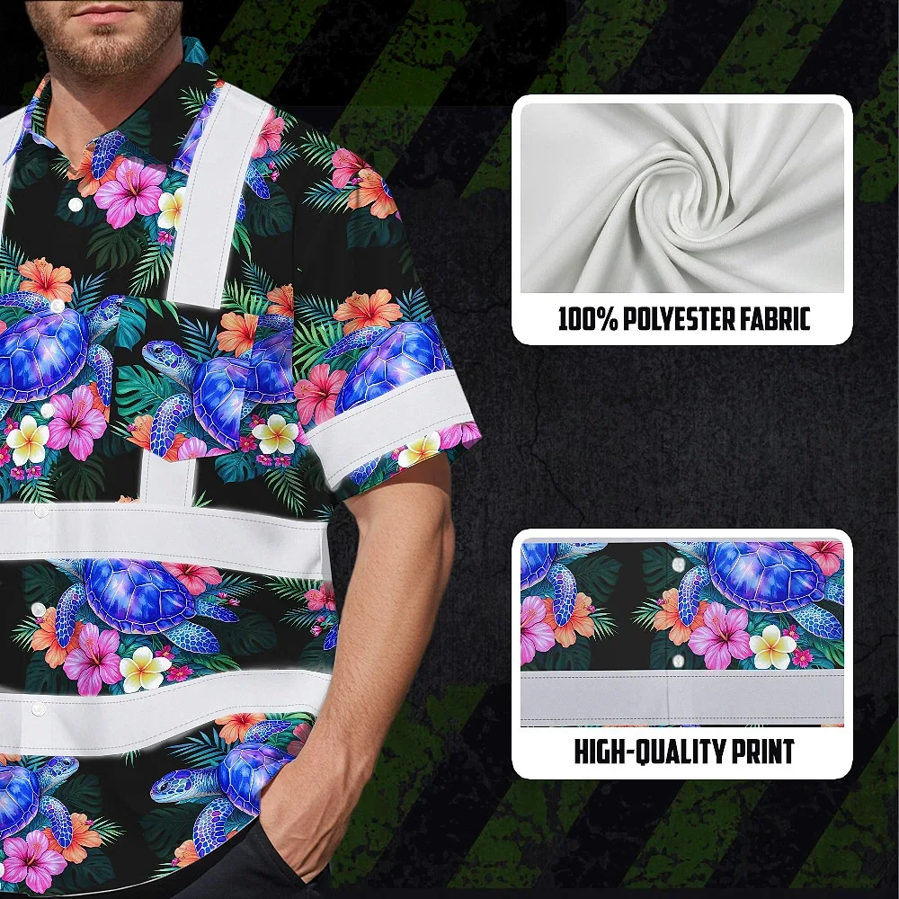 Hi Vis Hawaiian Shirt Reflective Tapes Green Black Flowers Turtle Custom Name Safety Workwear For Workers, Truckers, Operators, Company
