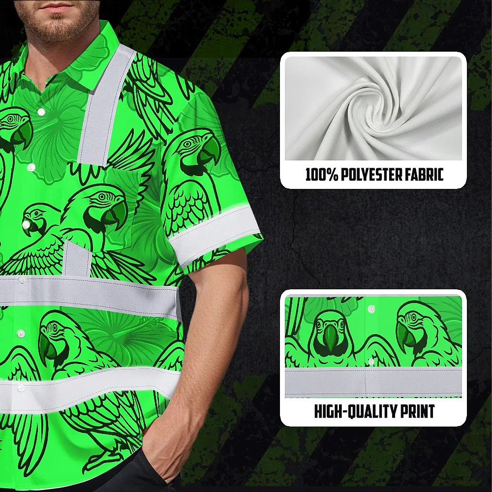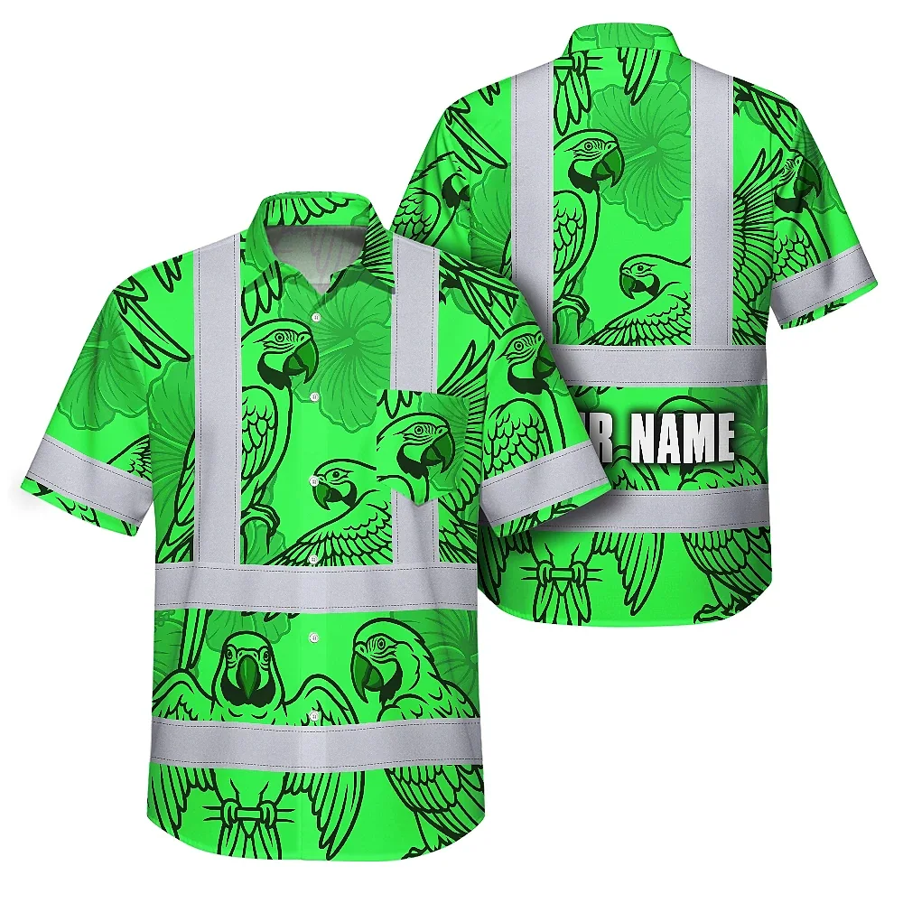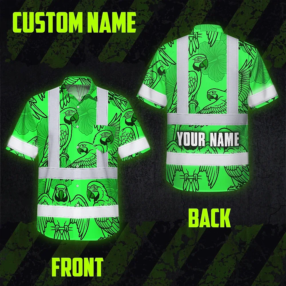 Hi Vis Hawaiian Shirt Reflective Tapes Green Black Parrot Custom Name Safety Workwear For Workers, Truckers, Operators