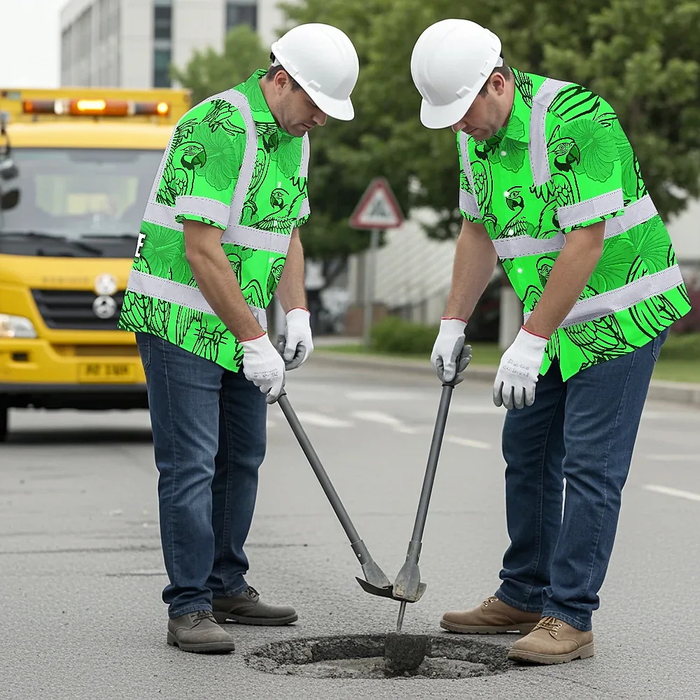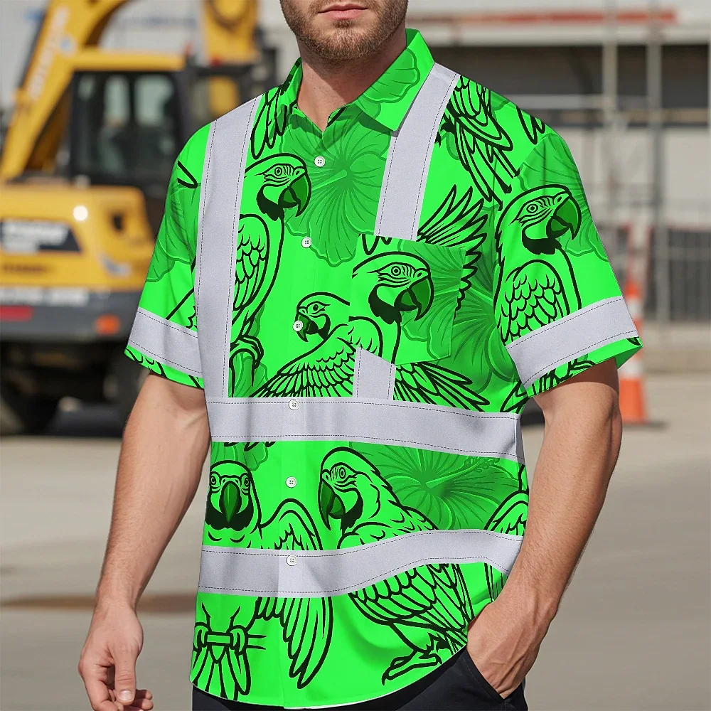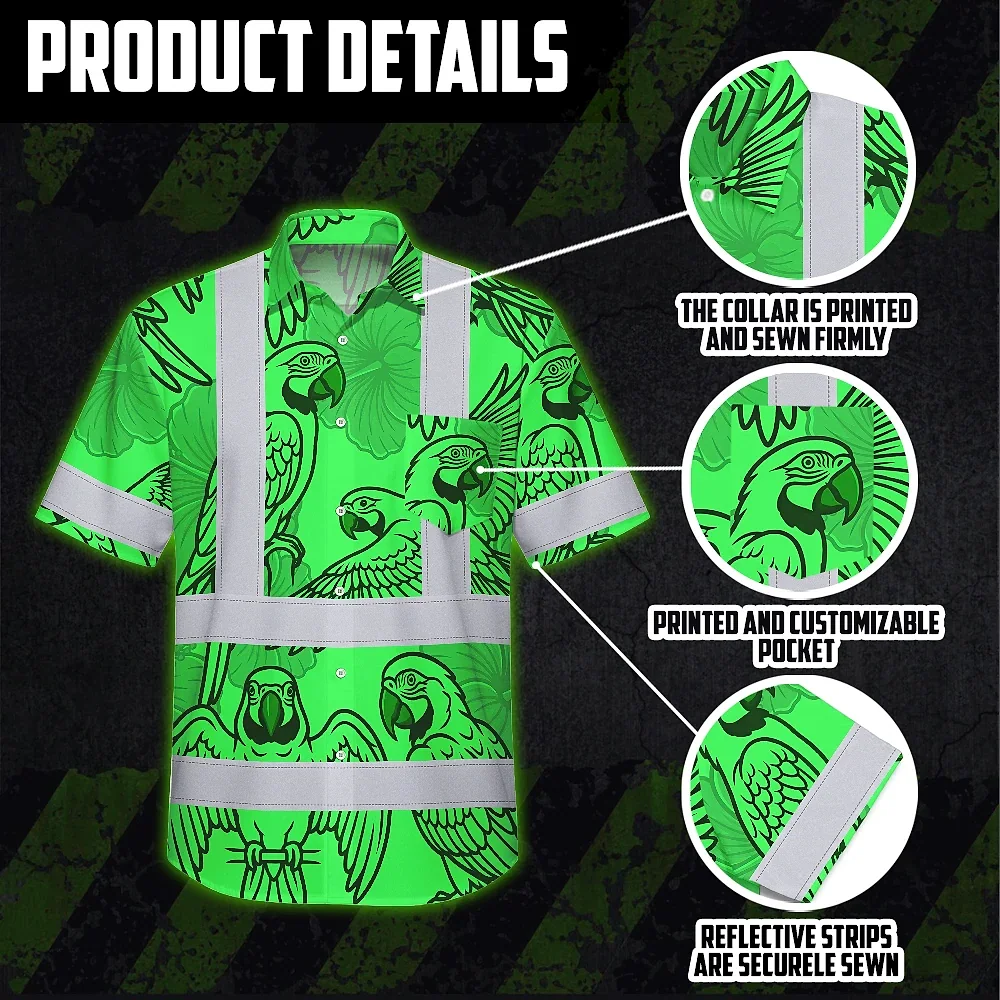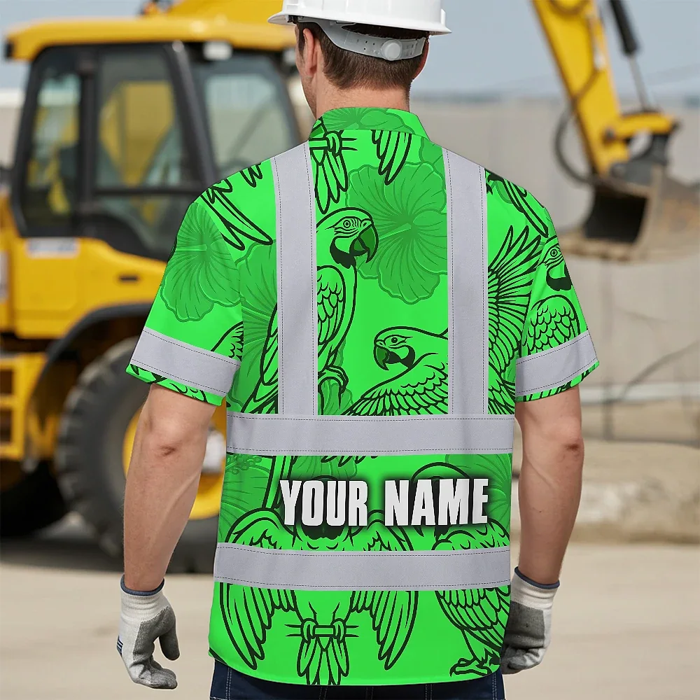 Hi Vis Hawaiian Shirt Reflective Tapes Green Black Parrot Custom Name Safety Workwear For Workers, Truckers, Operators