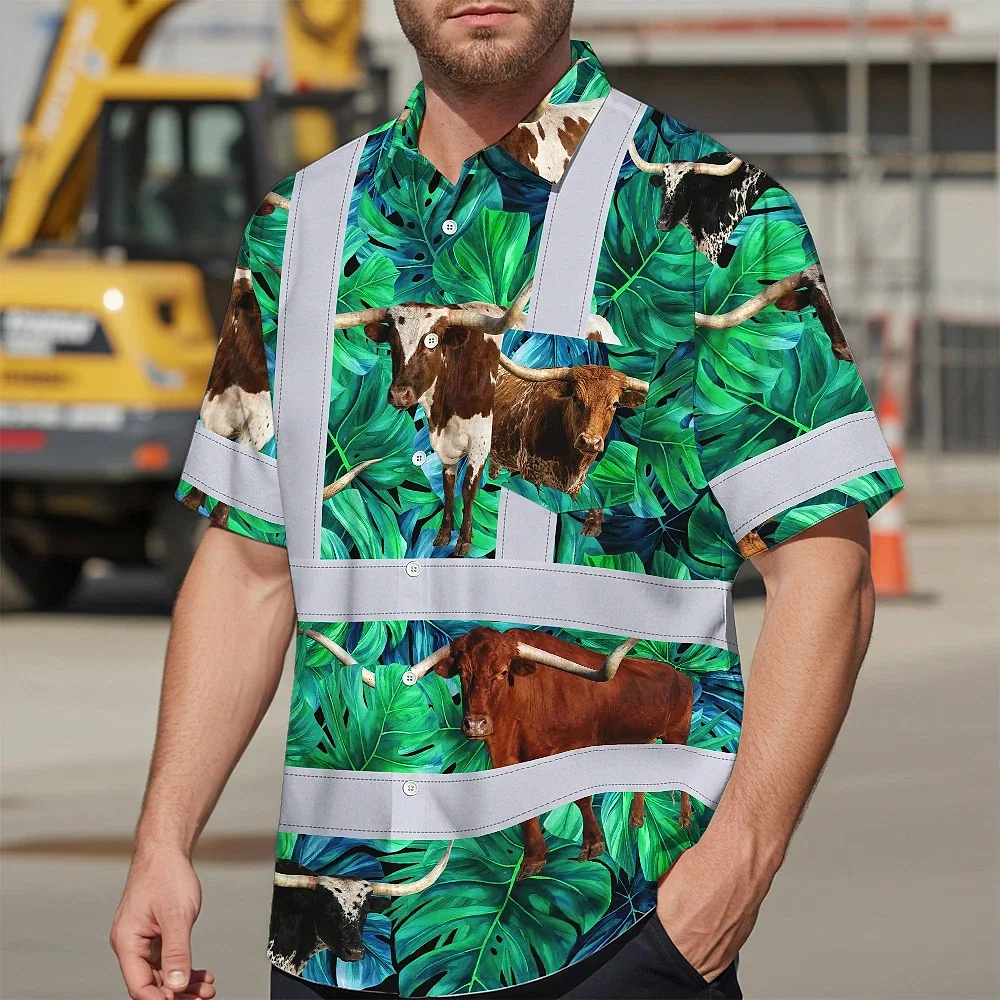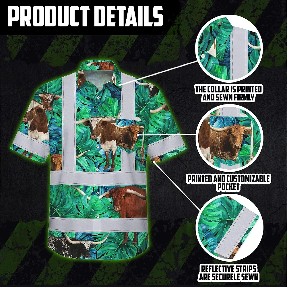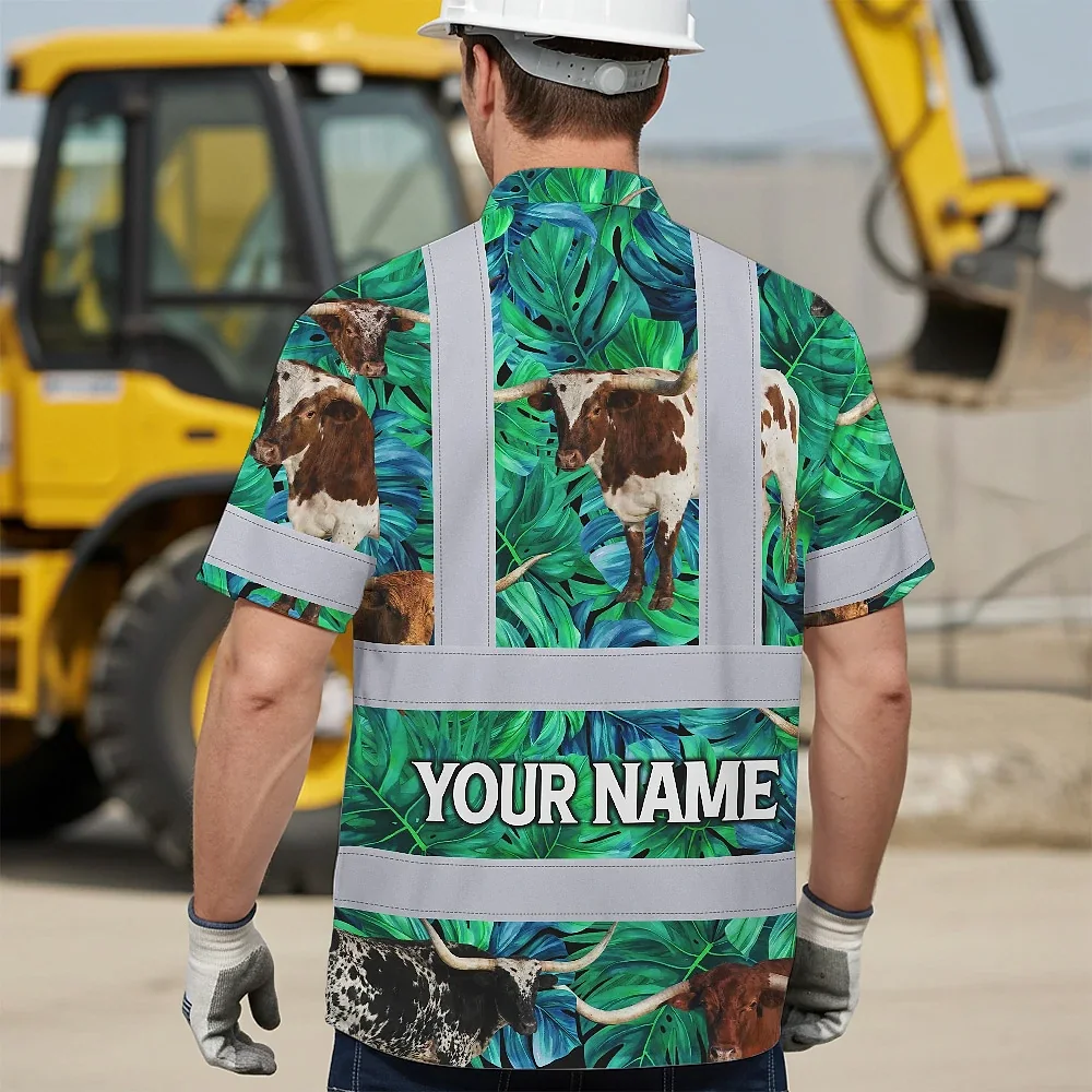 Hi Vis Hawaiian Shirt Reflective Tapes Green Flower Brown Cow 2 Custom Name Safety Workwear For Workers, Truckers, Operators, Company