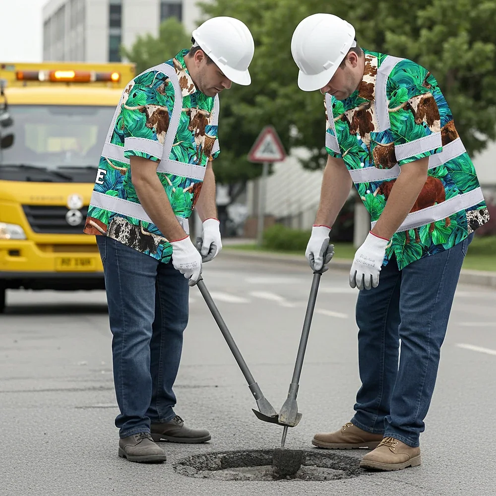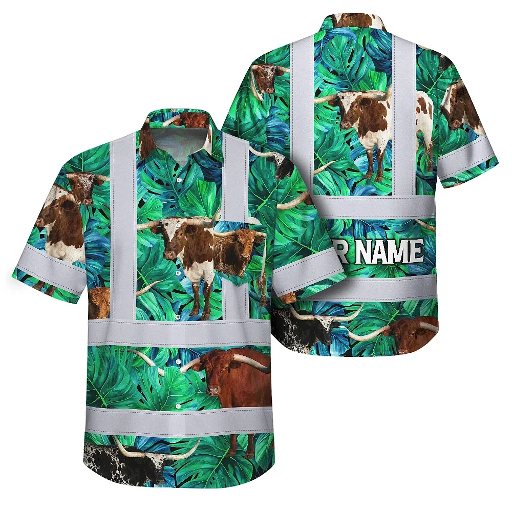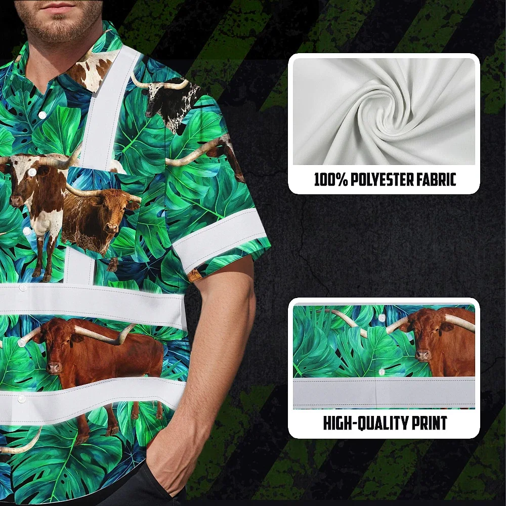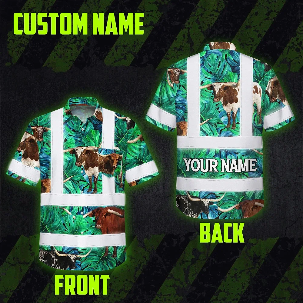 Hi Vis Hawaiian Shirt Reflective Tapes Green Flower Brown Cow 2 Custom Name Safety Workwear For Workers, Truckers, Operators, Company