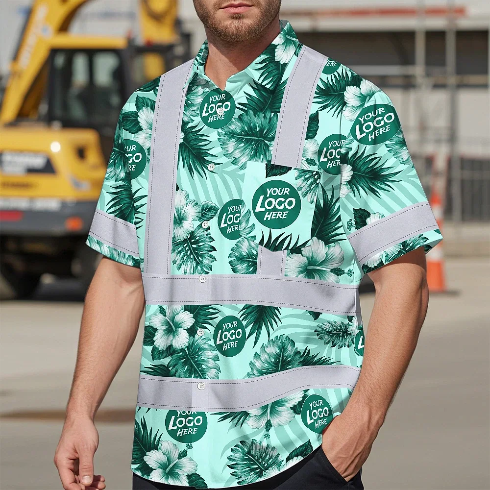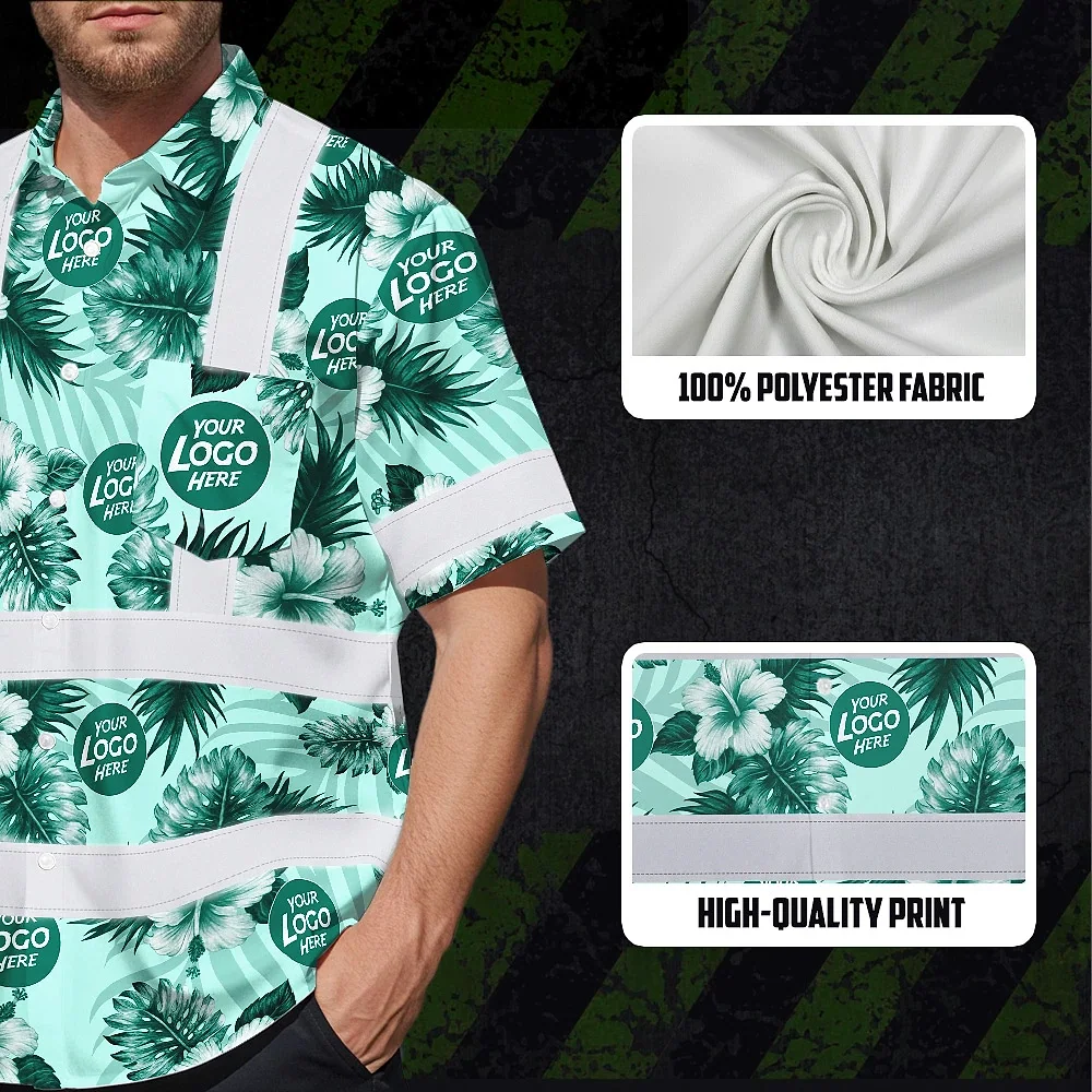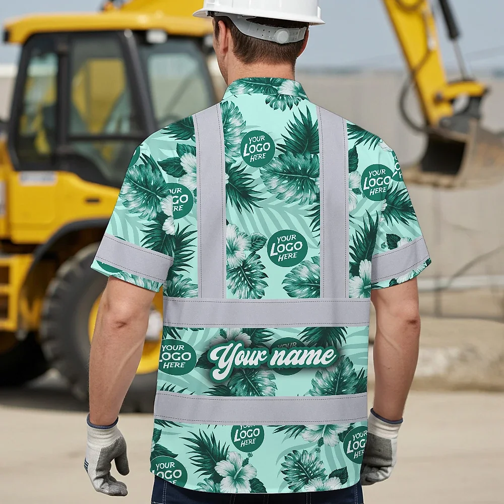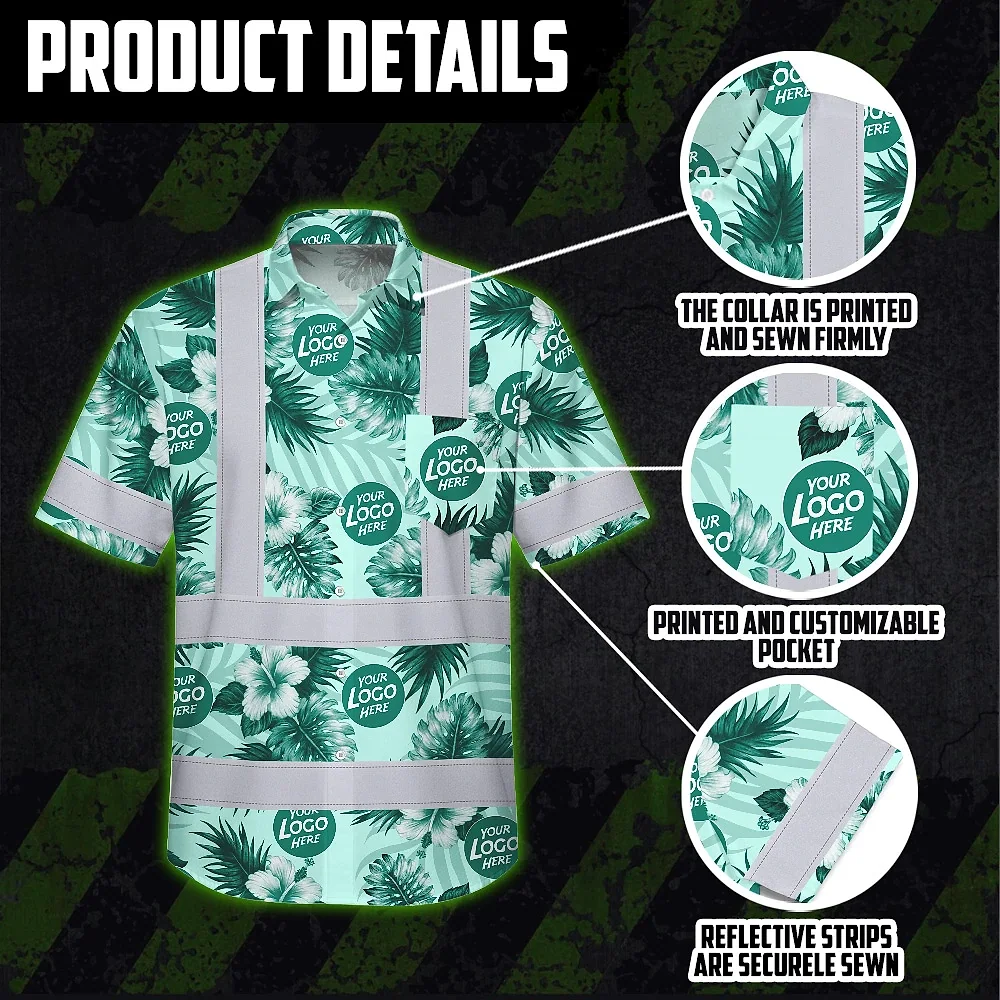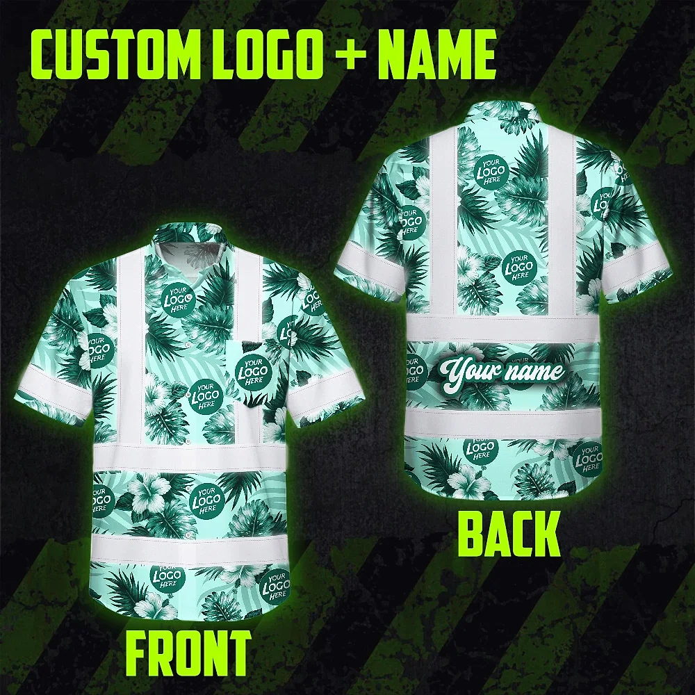 Hi Vis Hawaiian Shirt Reflective Tapes Green Neon And White Flowers Custom Name And Logo Safety Workwear For Workers, Truckers, Operators, Company