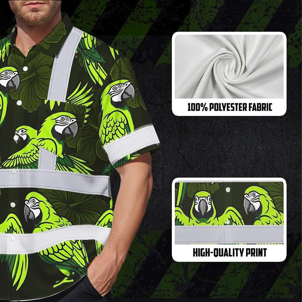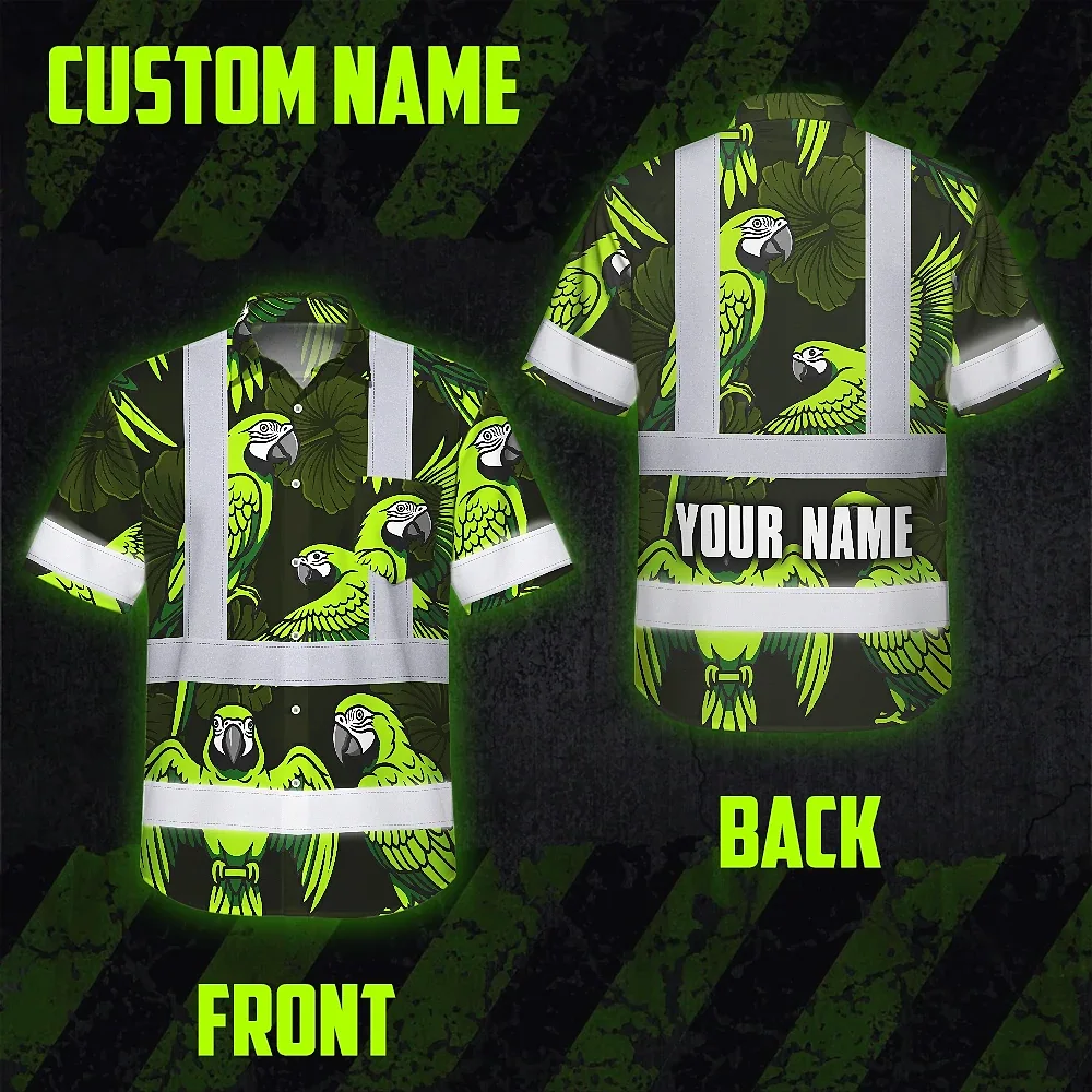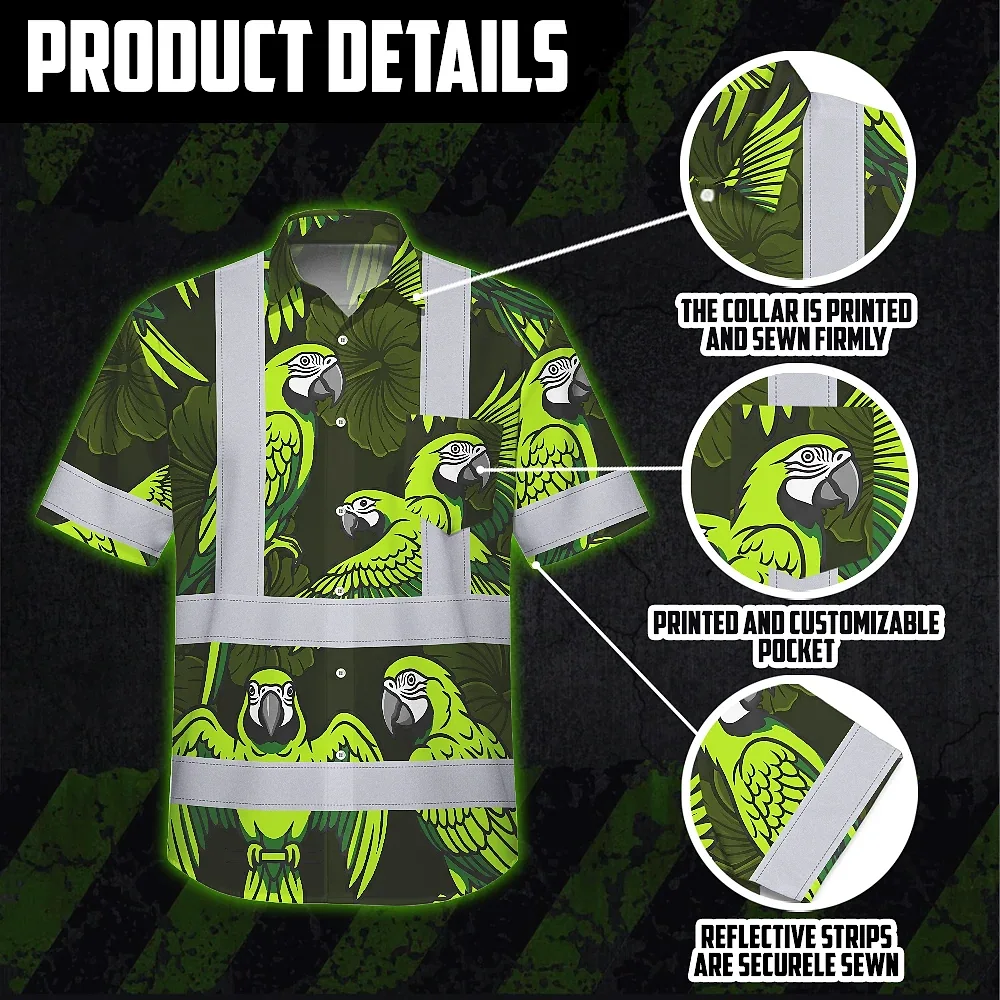 Hi Vis Hawaiian Shirt Reflective Tapes Green Neon Black Parrot Custom Name Safety Workwear For Workers, Truckers, Operators
