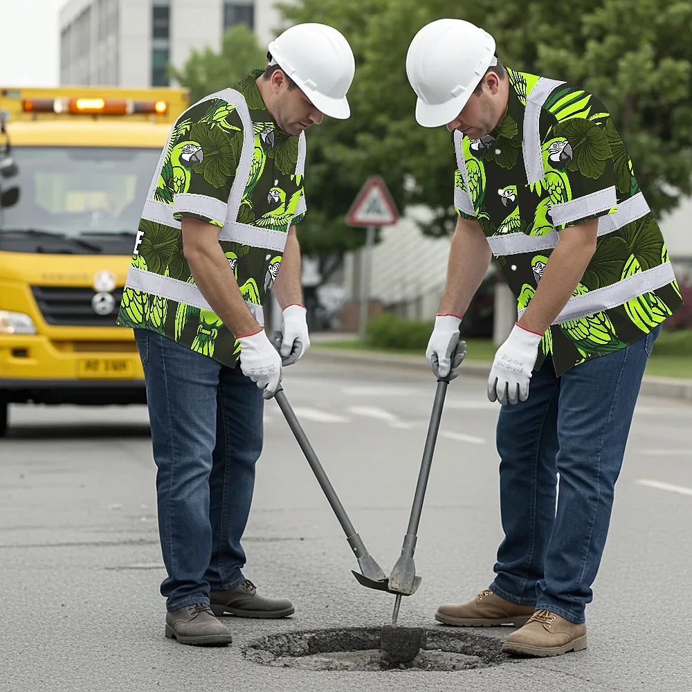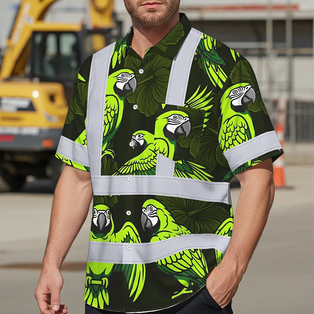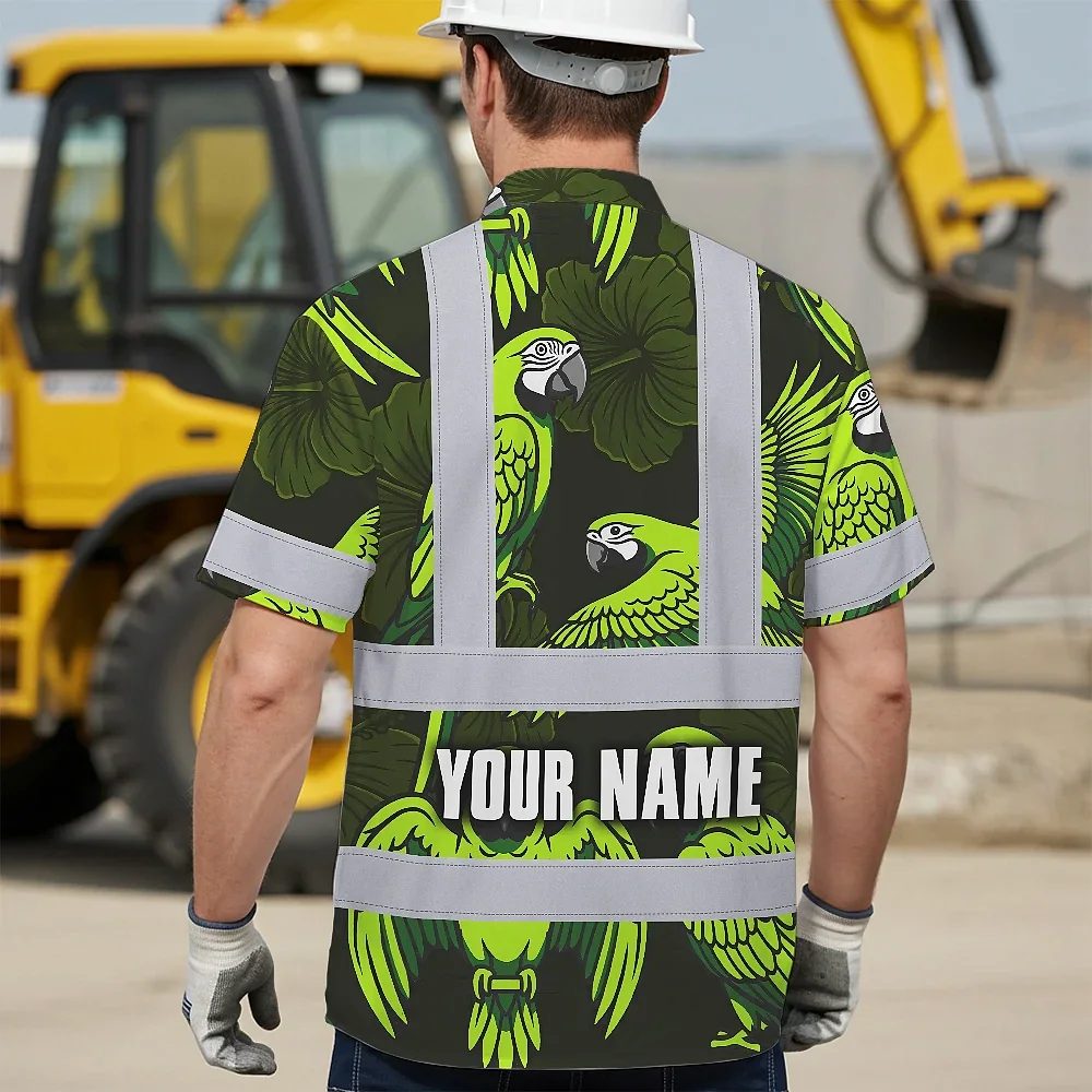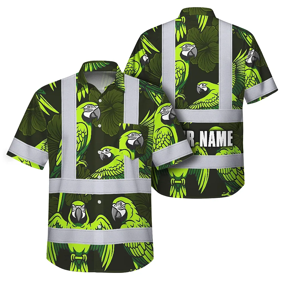 Hi Vis Hawaiian Shirt Reflective Tapes Green Neon Black Parrot Custom Name Safety Workwear For Workers, Truckers, Operators