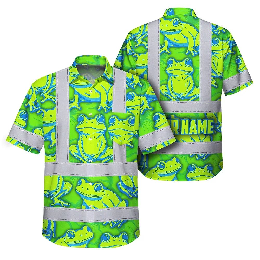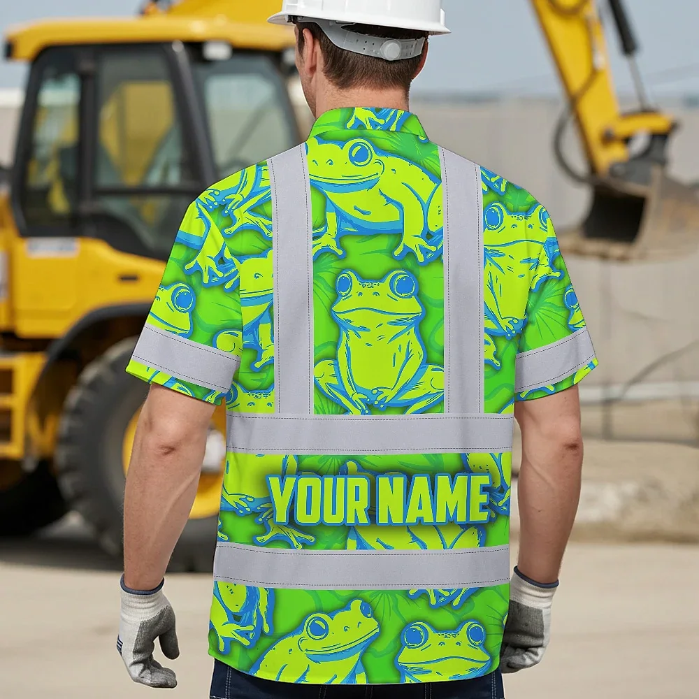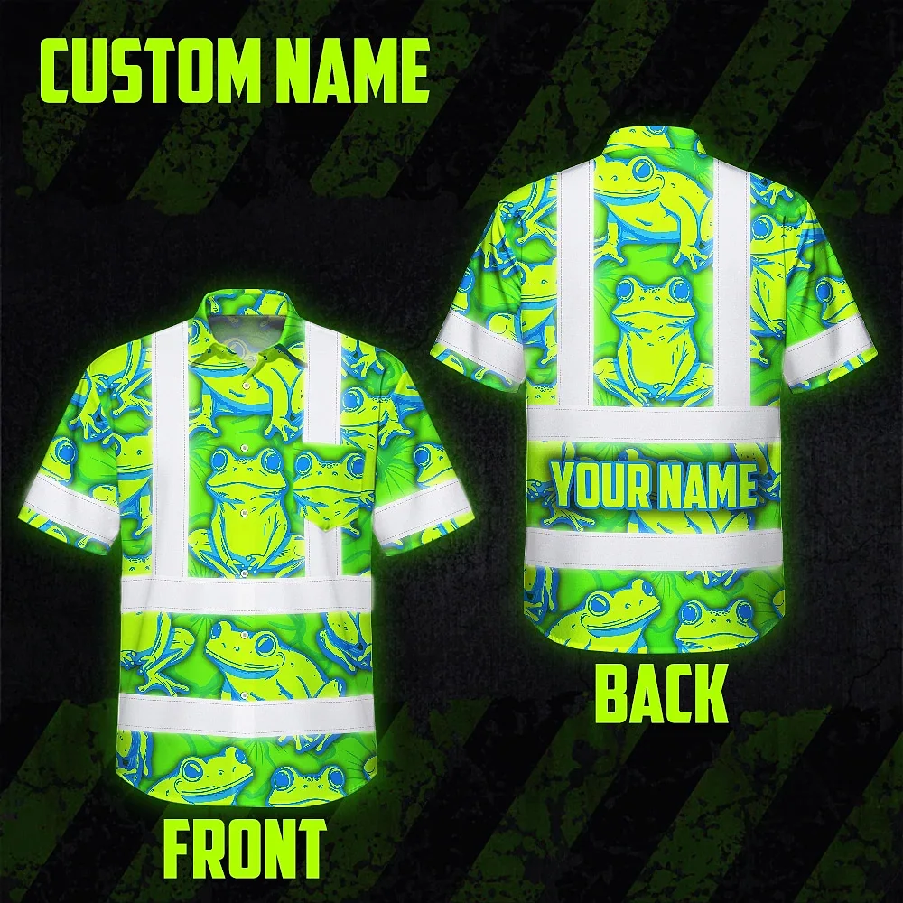 Hi Vis Hawaiian Shirt Reflective Tapes Green Neon Blue Frog Custom Name Safety Workwear For Workers, Truckers, Operators