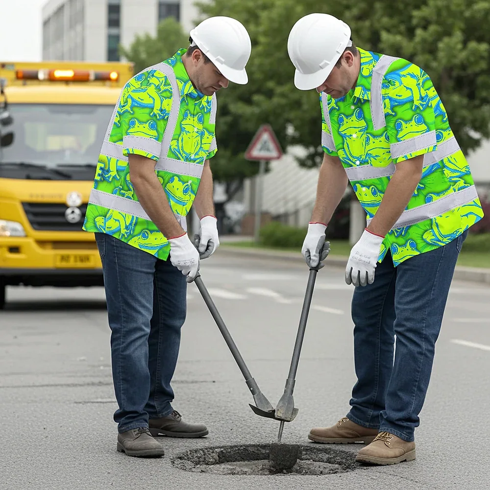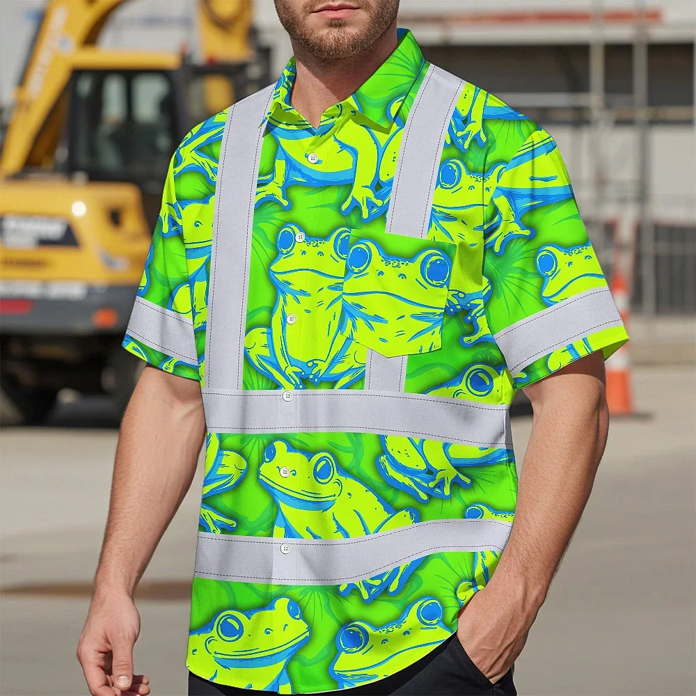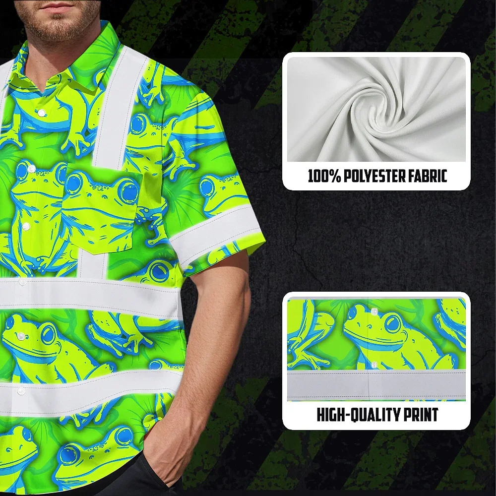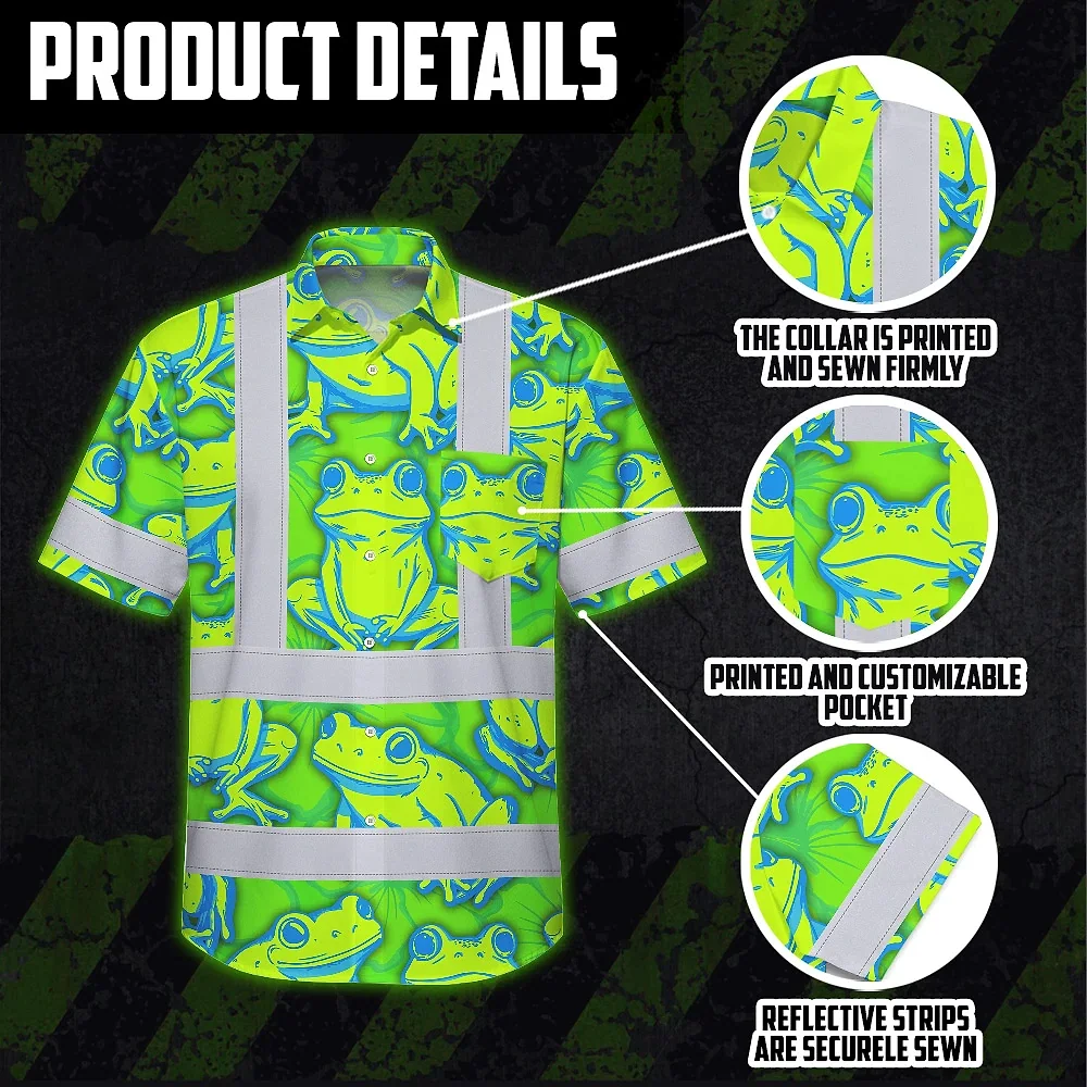 Hi Vis Hawaiian Shirt Reflective Tapes Green Neon Blue Frog Custom Name Safety Workwear For Workers, Truckers, Operators