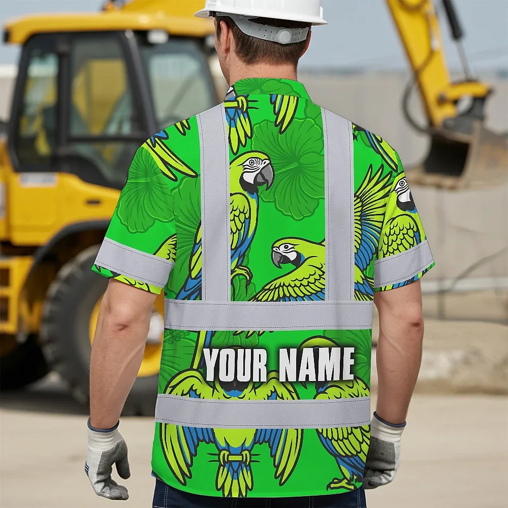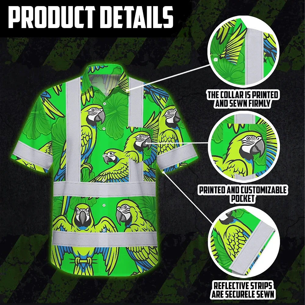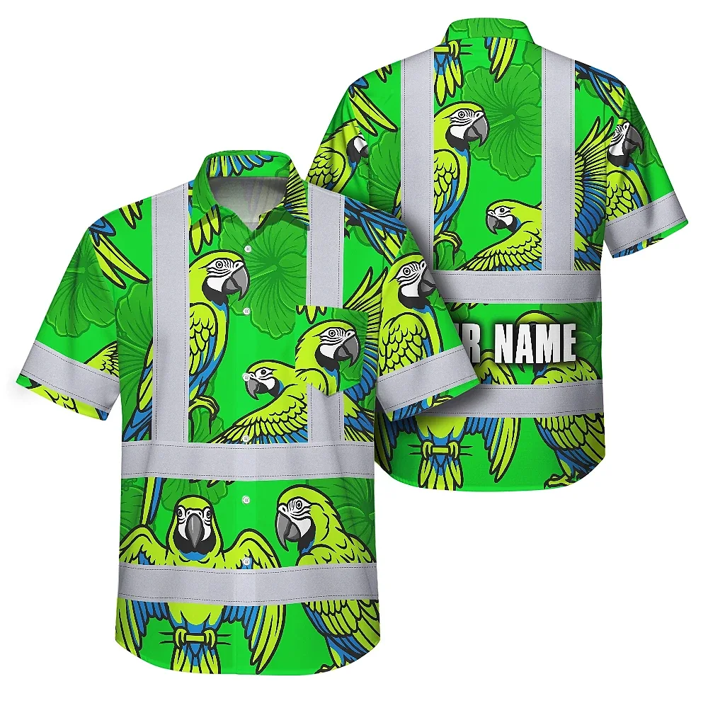 Hi Vis Hawaiian Shirt Reflective Tapes Green Neon Blue Parrot Custom Name Safety Workwear For Workers, Truckers, Operators