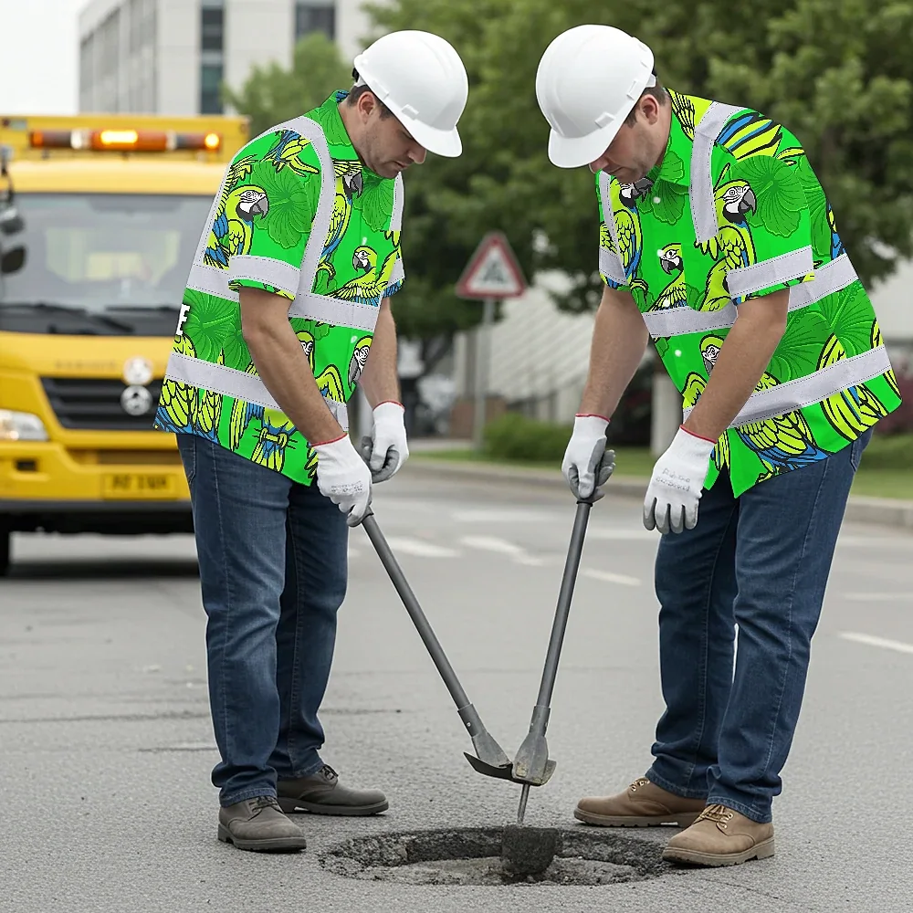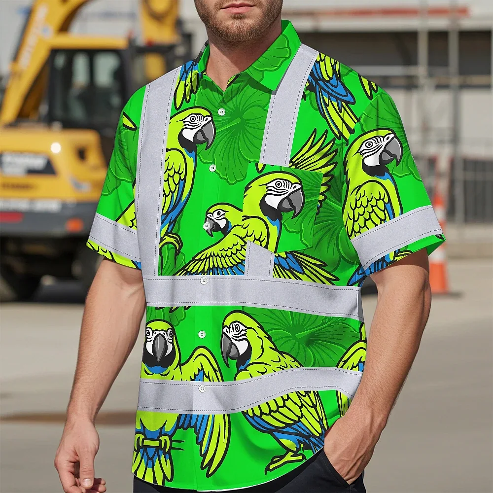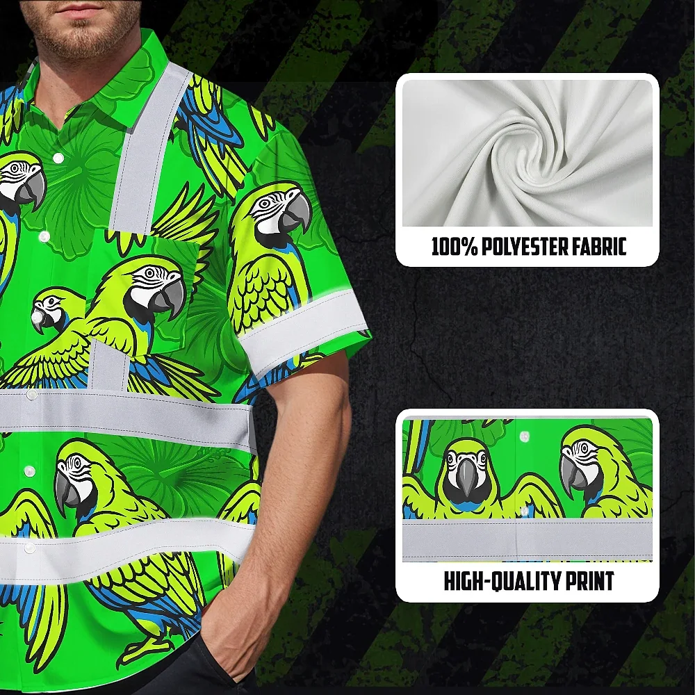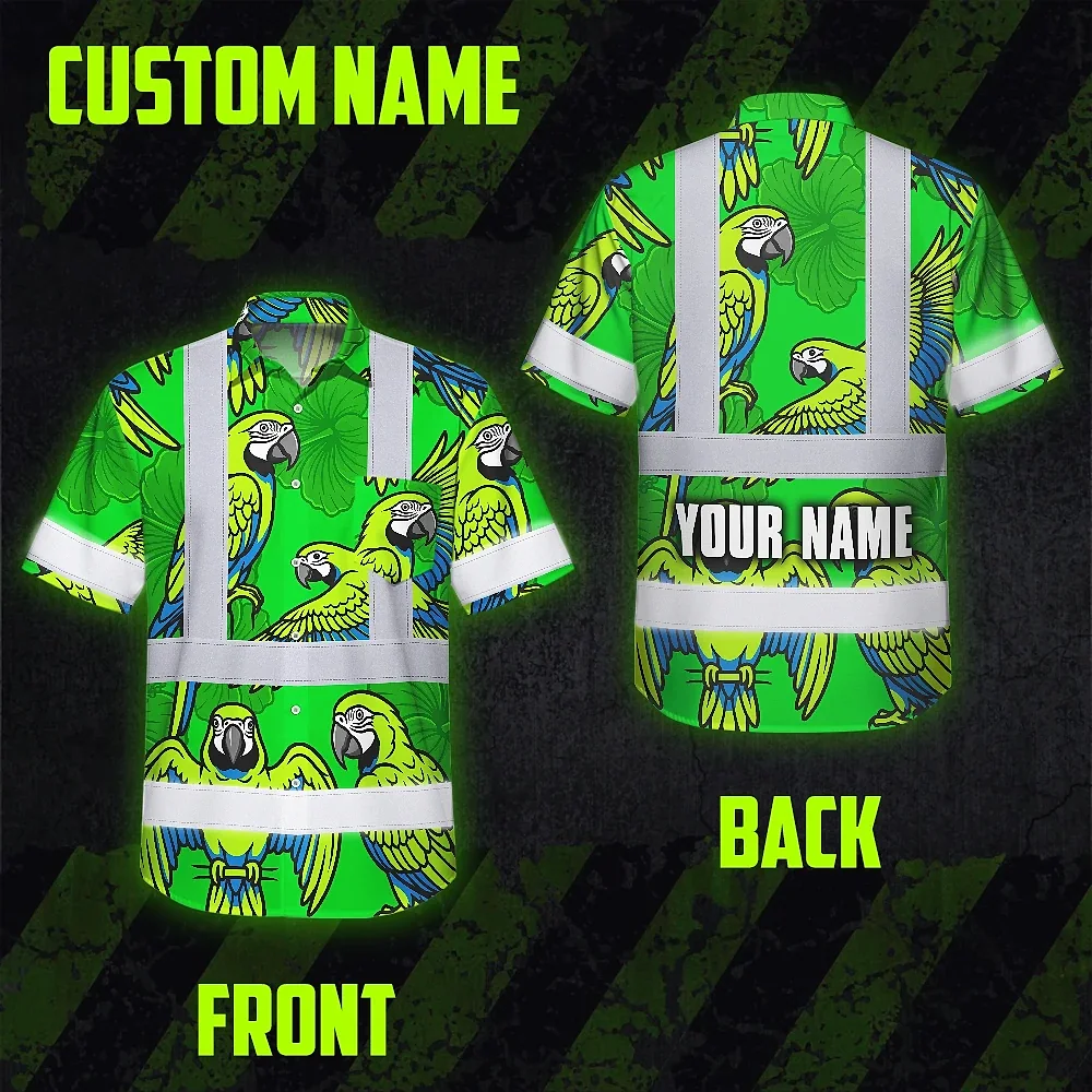 Hi Vis Hawaiian Shirt Reflective Tapes Green Neon Blue Parrot Custom Name Safety Workwear For Workers, Truckers, Operators