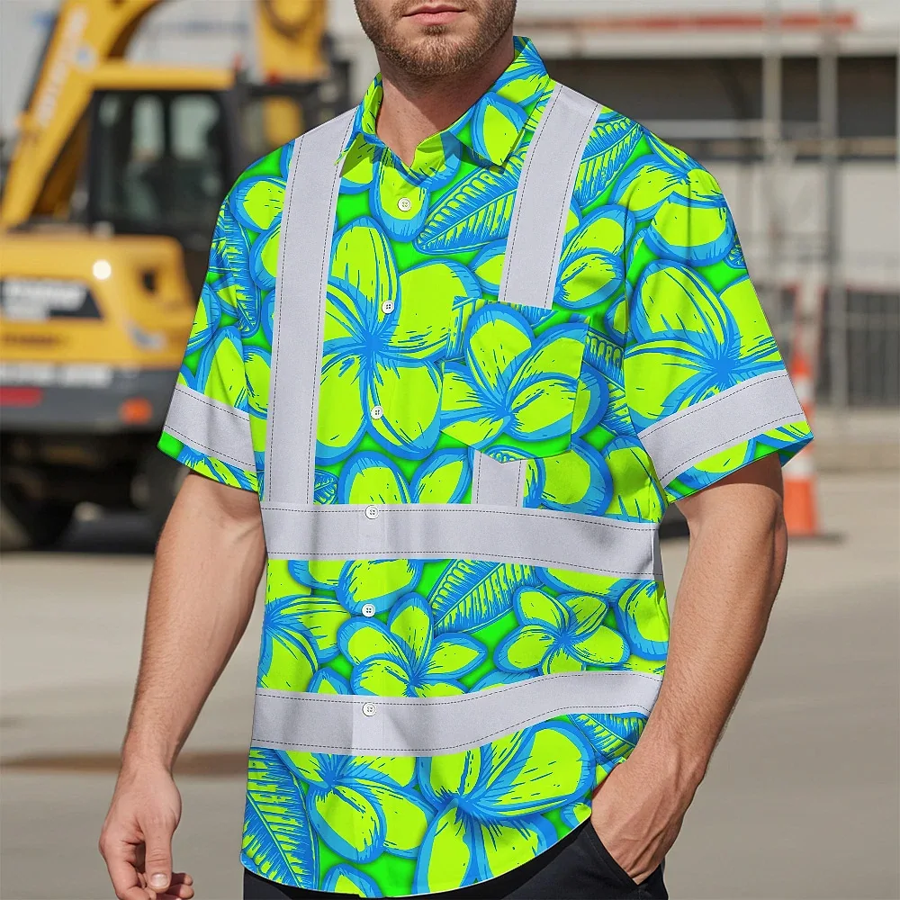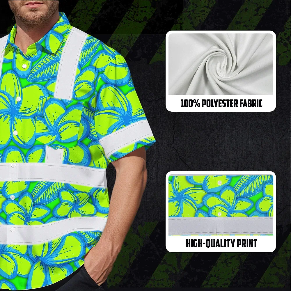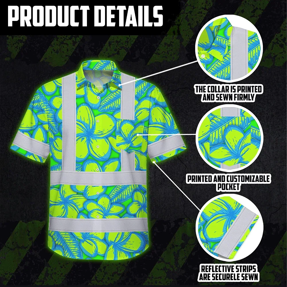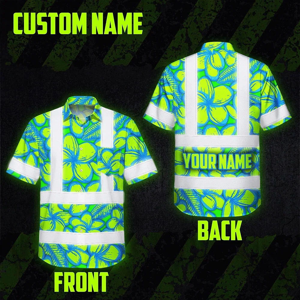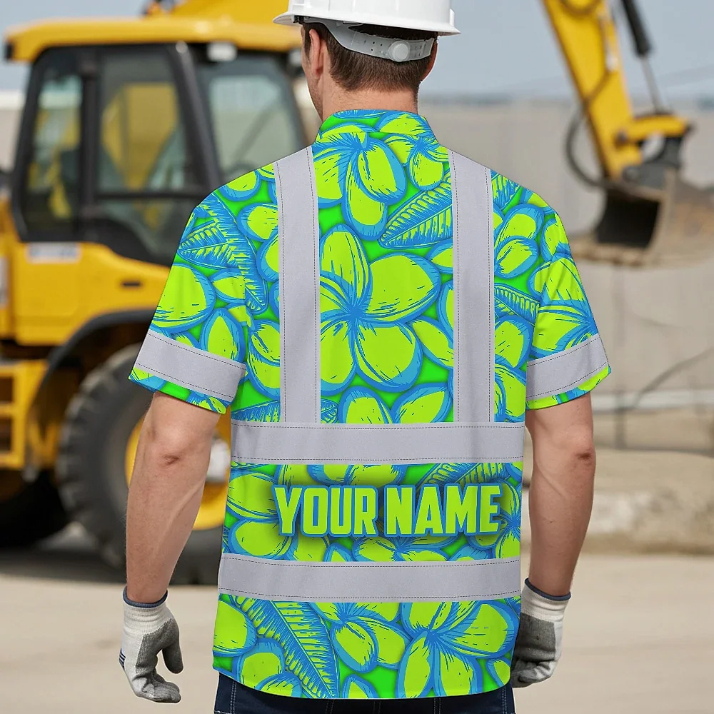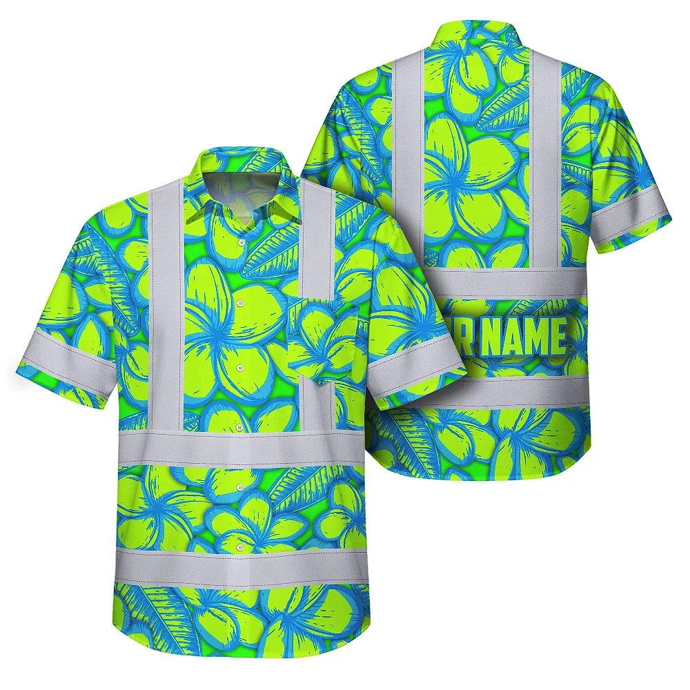 Hi Vis Hawaiian Shirt Reflective Tapes Green Neon Blue Plumeria Custom Name Safety Workwear For Workers, Truckers, Operators