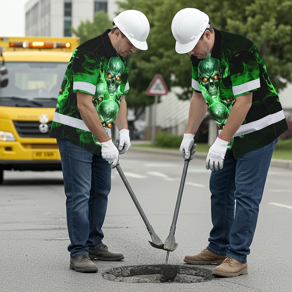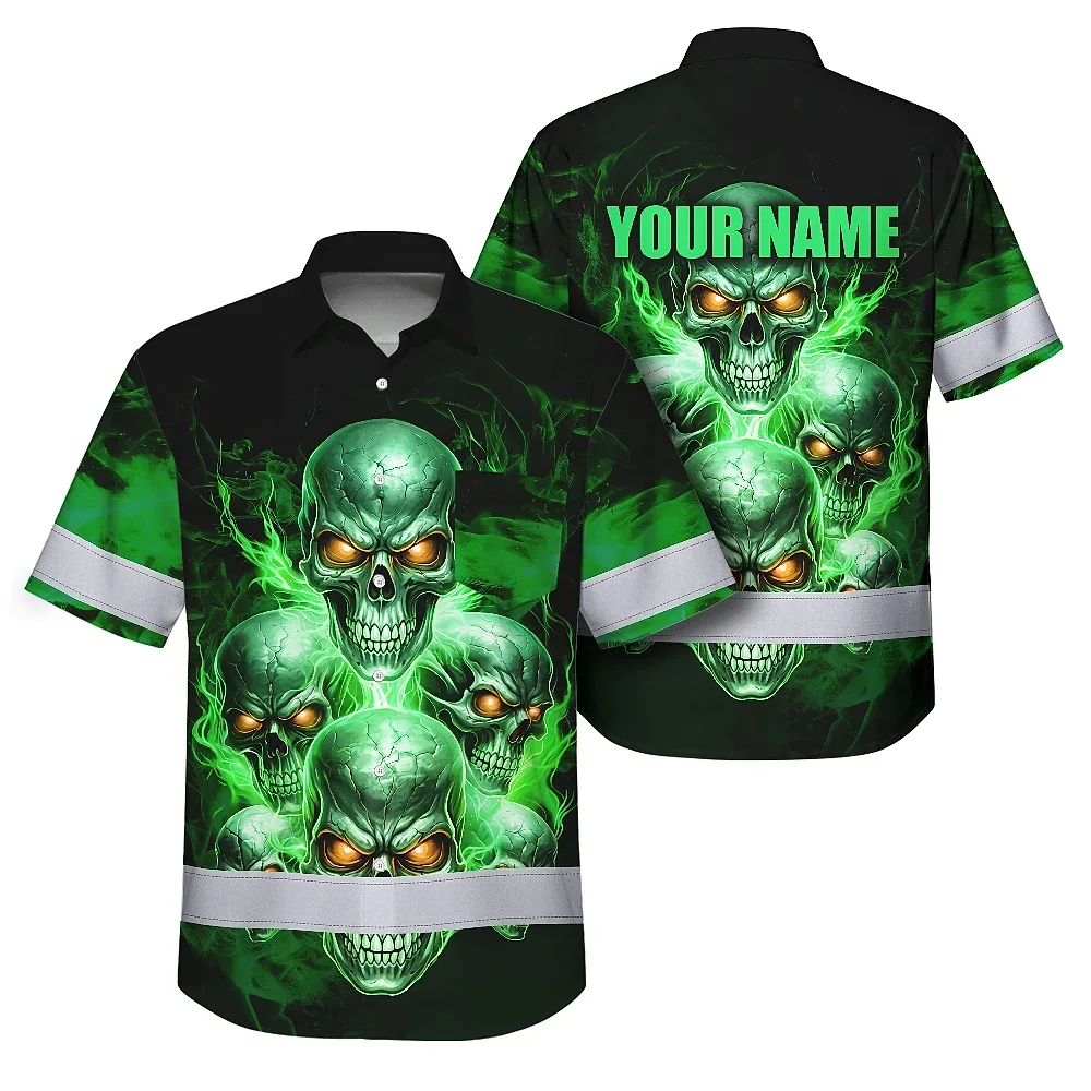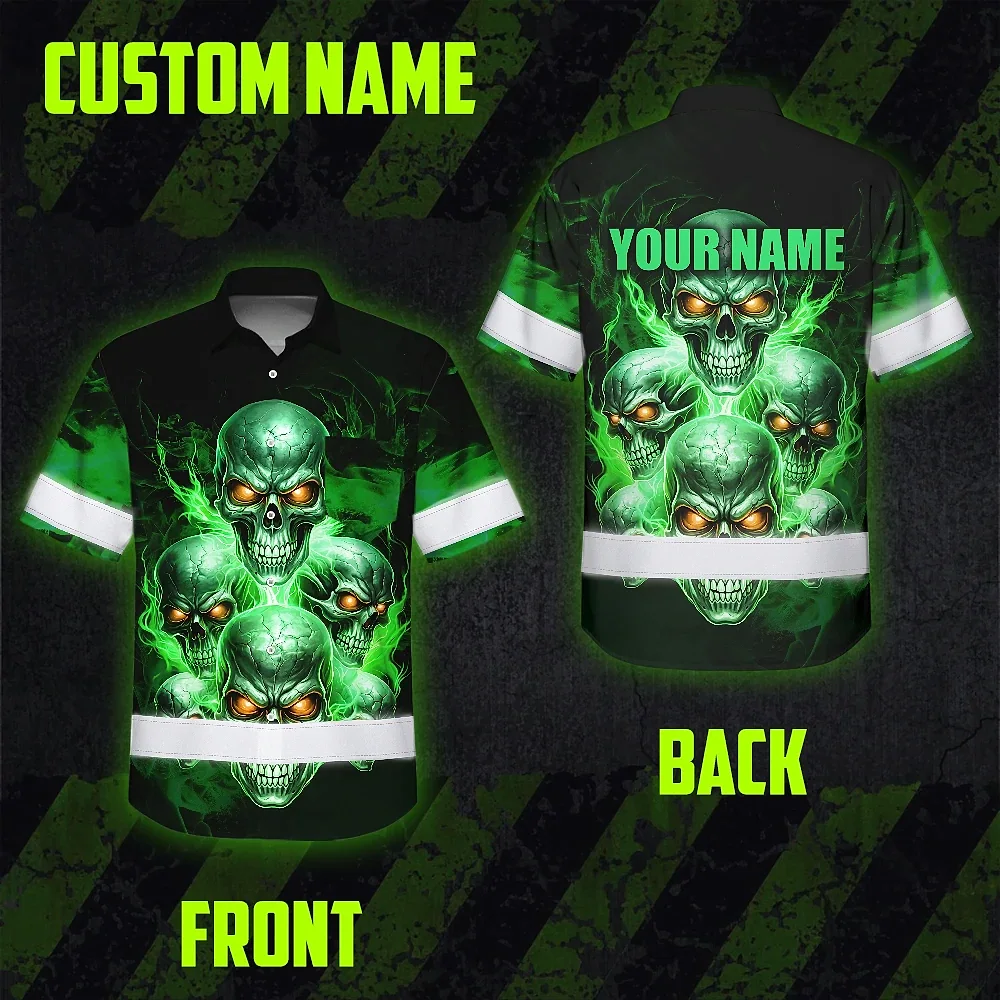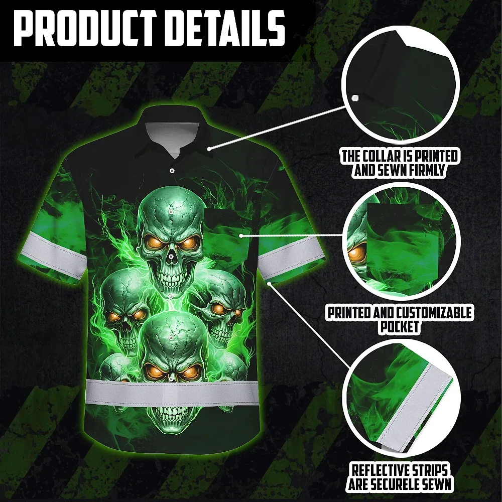 Hi Vis Hawaiian Shirt Reflective Tapes Green Neon Fire Skull Custom Name Safety Workwear For Workers, Truckers, Operators
