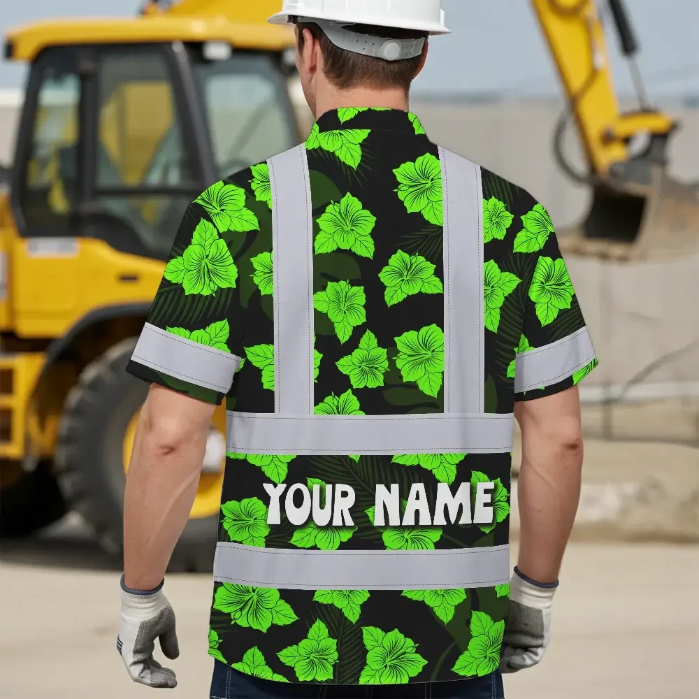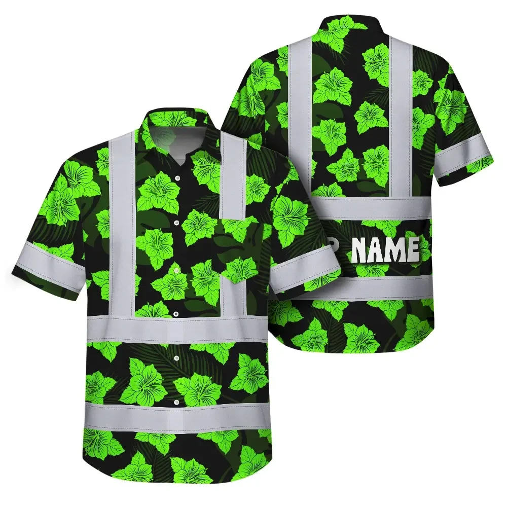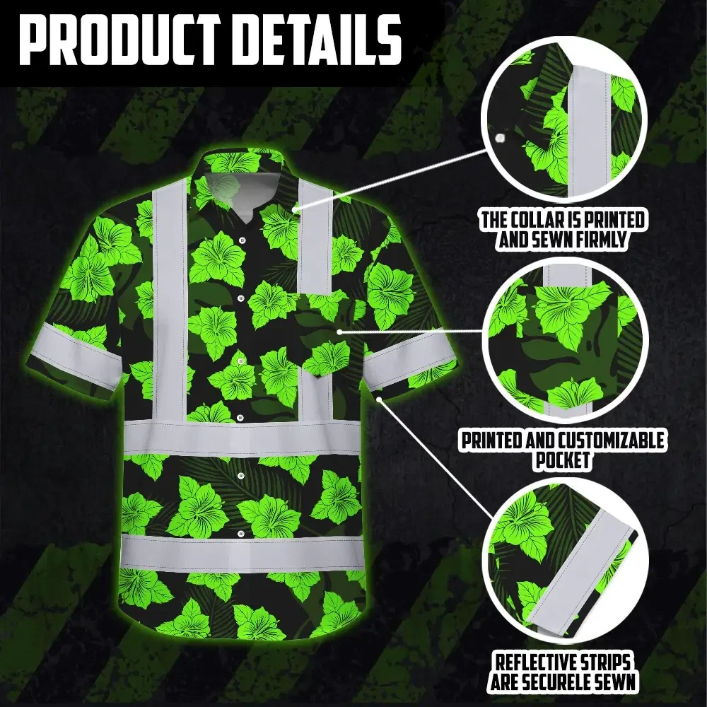 Hi Vis Hawaiian Shirt Reflective Tapes Green Neon Flowers 3 Custom Name