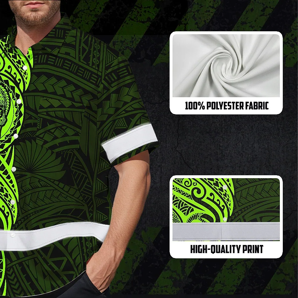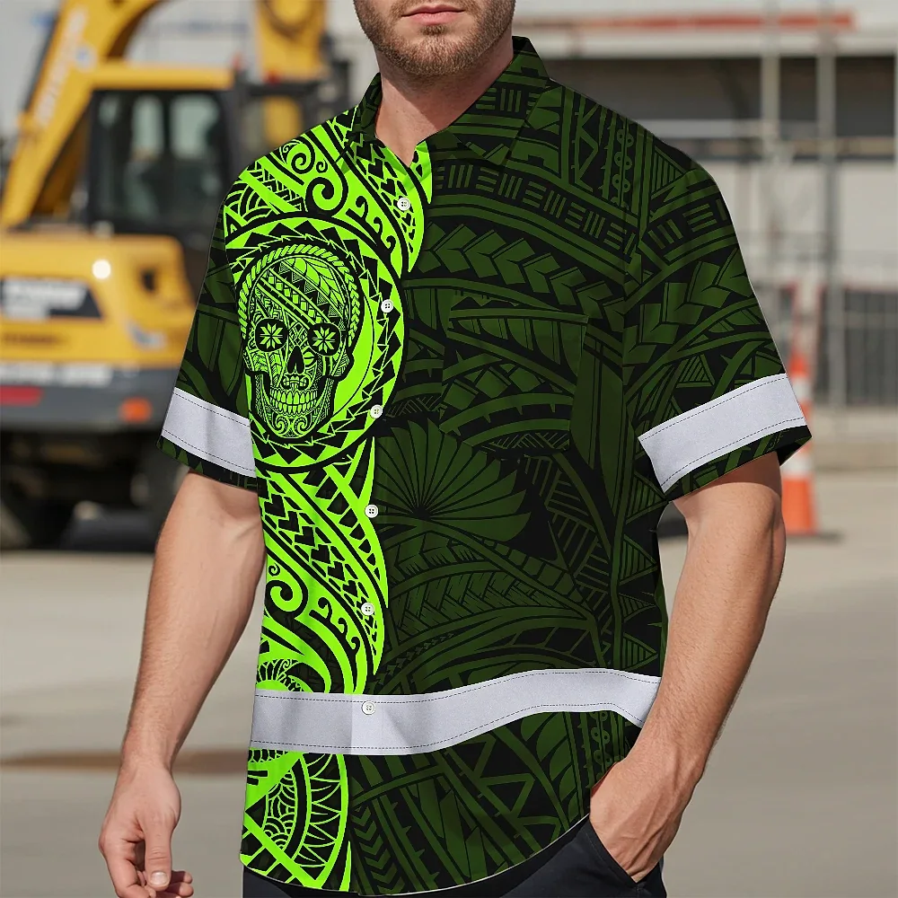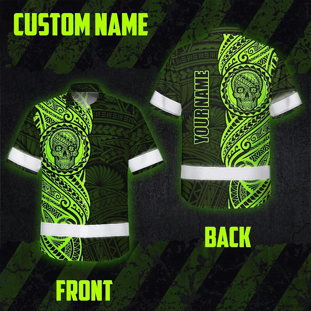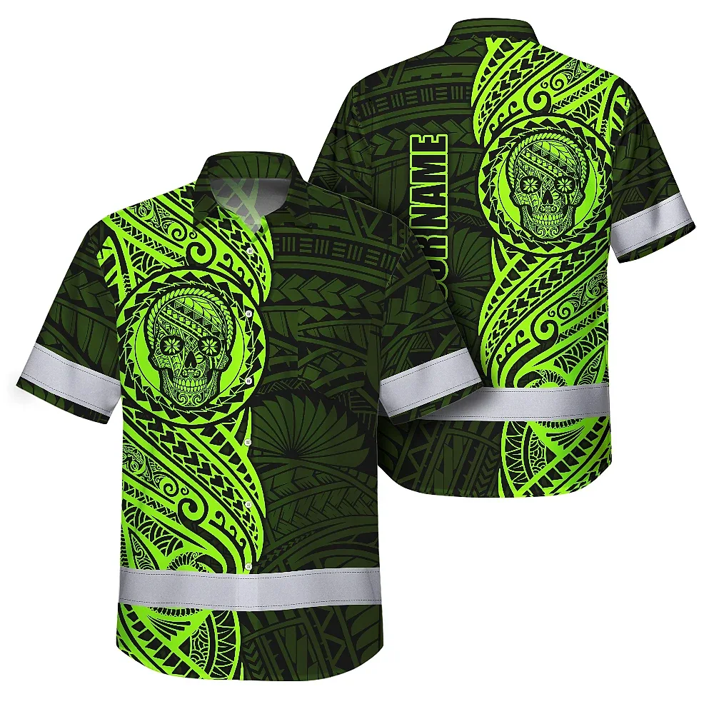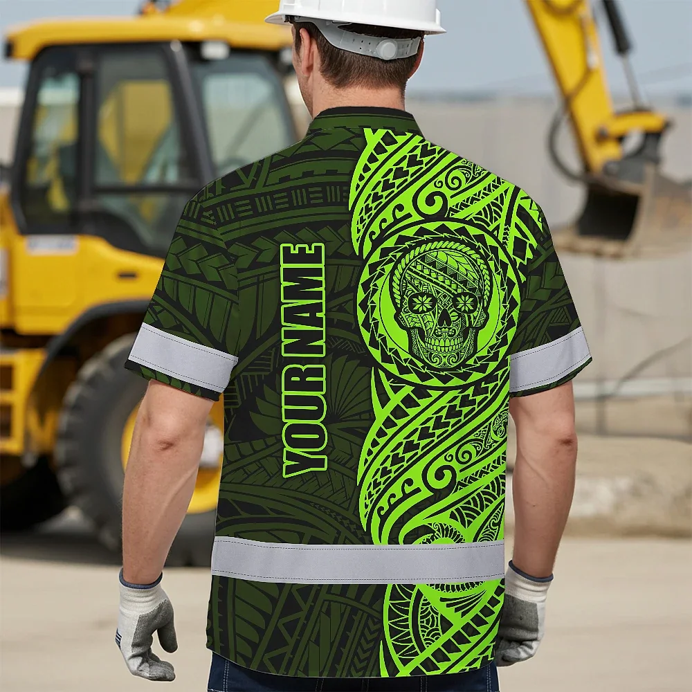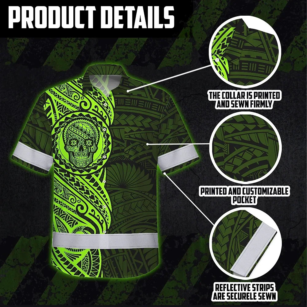 Hi Vis Hawaiian Shirt Reflective Tapes Green Neon Polynesian And Skull Custom Name Safety Workwear For Workers, Truckers, Operators
