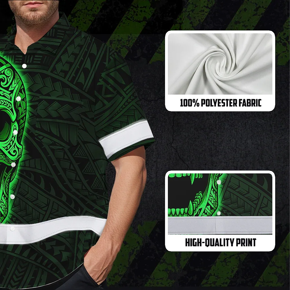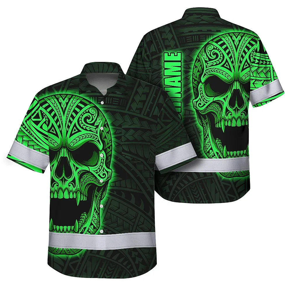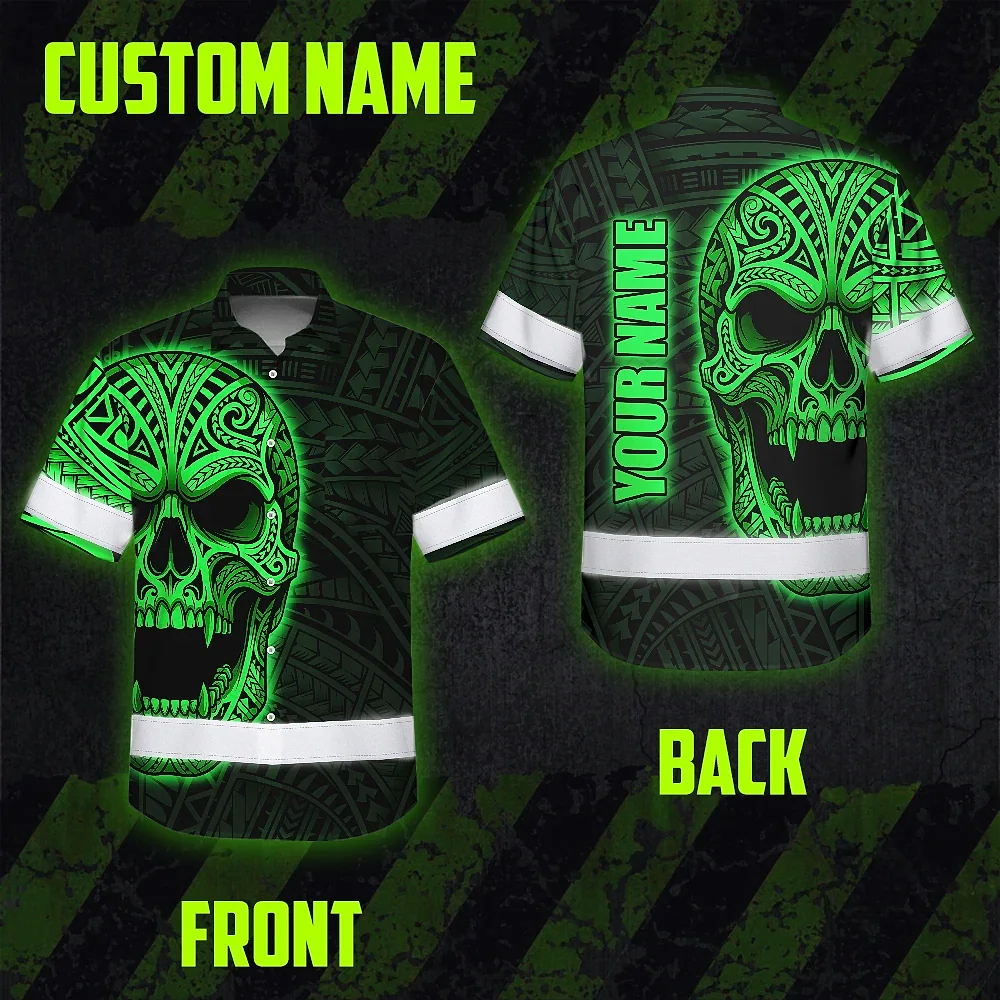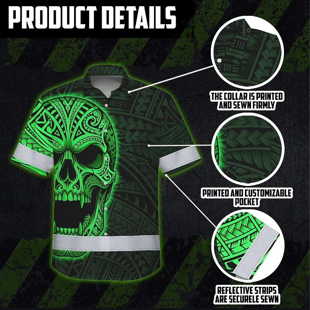 Hi Vis Hawaiian Shirt Reflective Tapes Green Neon Polynesian Half Skull Custom Name Safety Workwear For Workers, Truckers, Operators