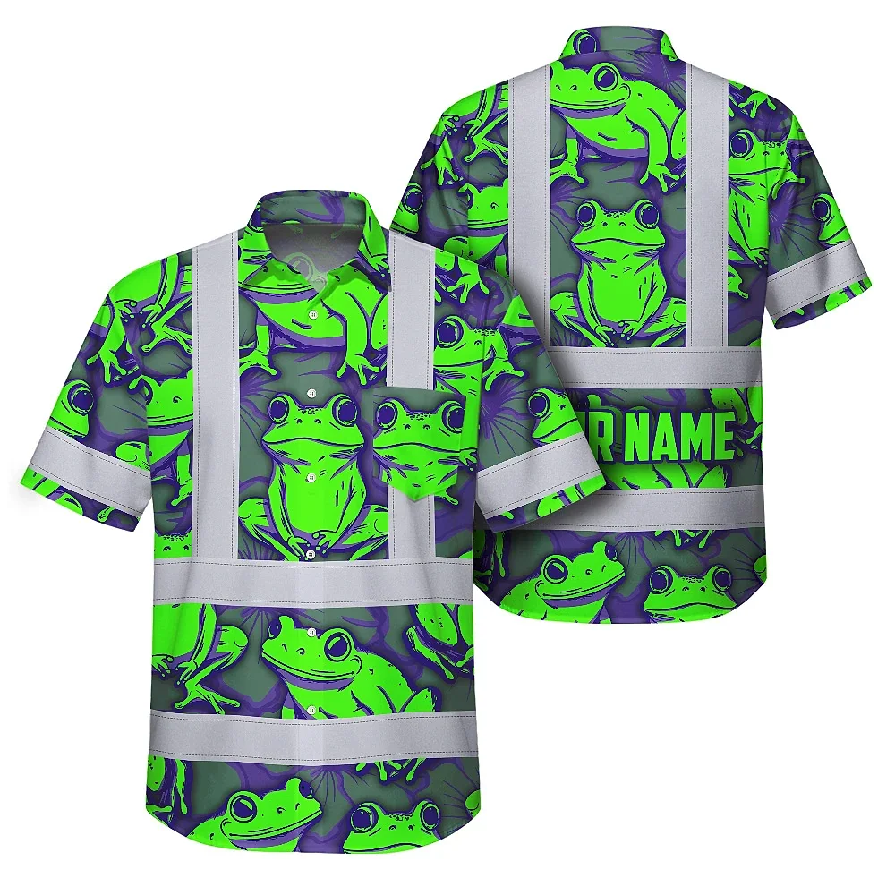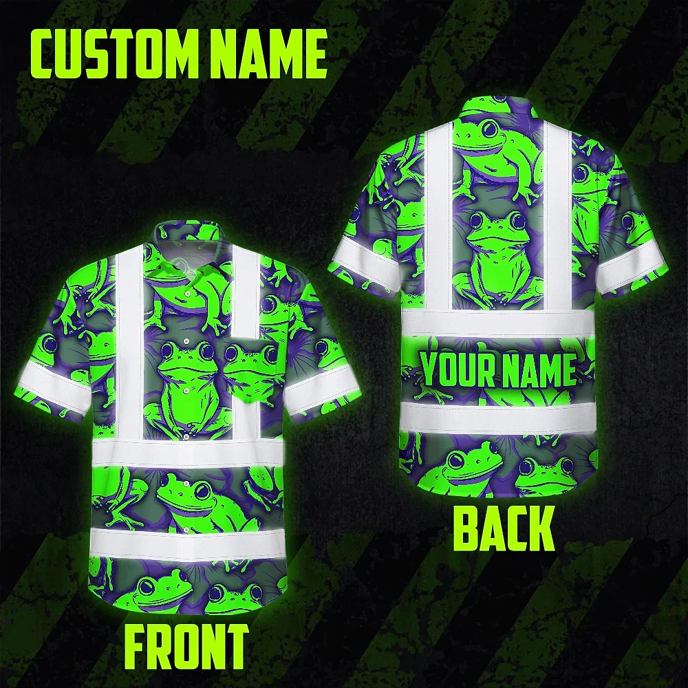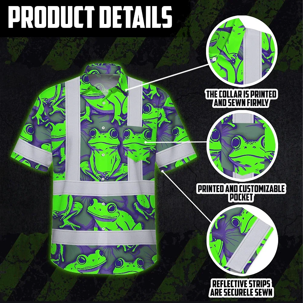 Hi Vis Hawaiian Shirt Reflective Tapes Green Neon Violet Frog Custom Name Safety Workwear For Workers, Truckers, Operators